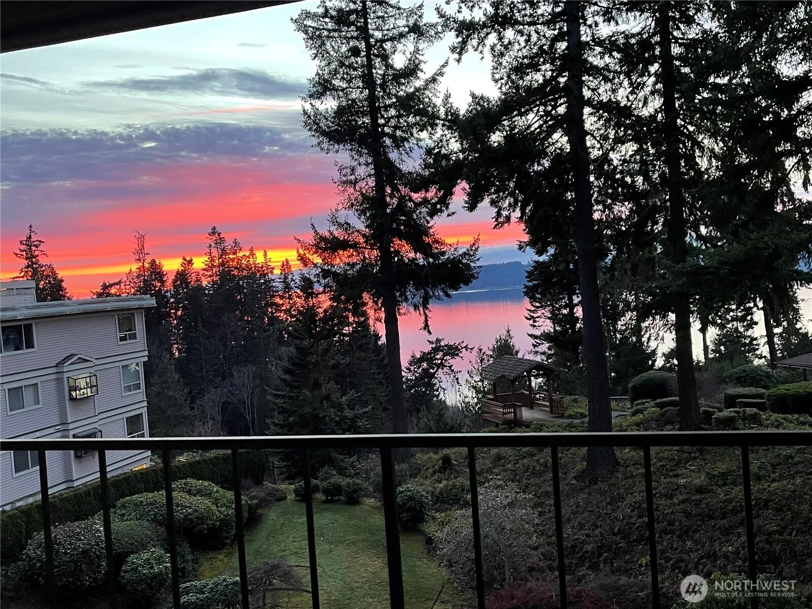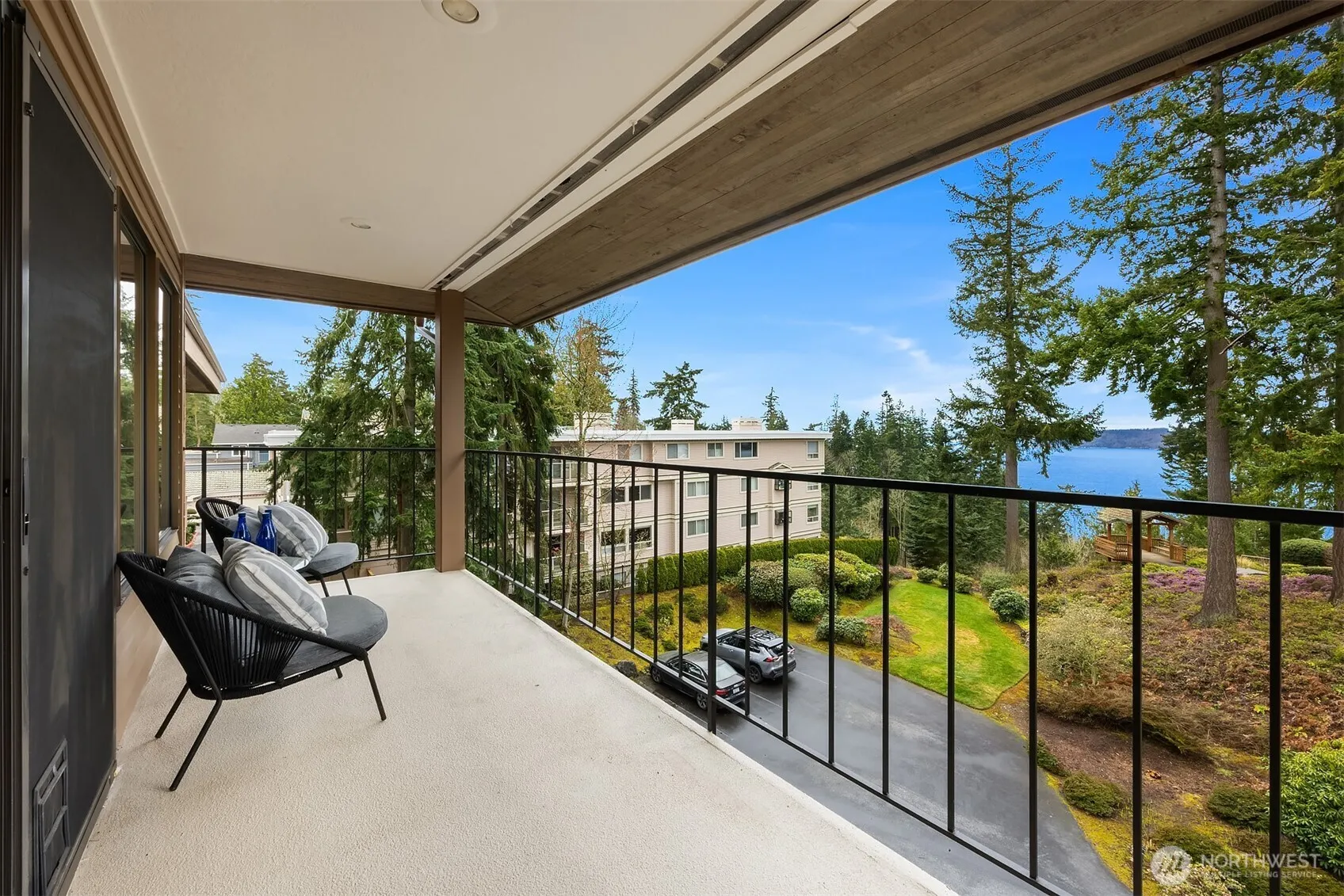 Top-Floor Corner Condo with stunning Sound & Mountain Views and a private deck! Recently updated with new windows, appliances, flooring, paint, and lighting. Generous living spaces w/ primary bedroom, walk-in closet and ensuite full bath. Radiant heat in ceiling, wood-fireplace, a great room, convenient half-bath, in unit laundry, ample storage within unit and private storage room in garage. Gated entry, intercom system and elevator to unit from the lobby & parking garage. One covered-secure parking space, and off-street owner/guest parking, plus RV Parking. Pool, clubhouse, and sport court for recreation. Two common gazebos, each w/ Sound & Mtn views. Step up to waterfront living! This is the one you’ve waited for!