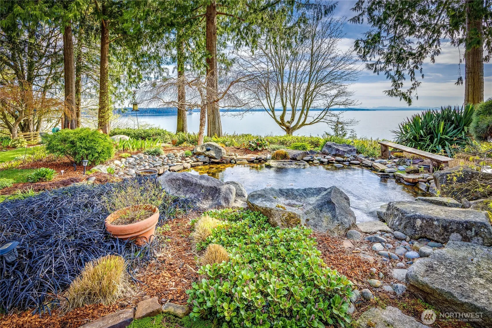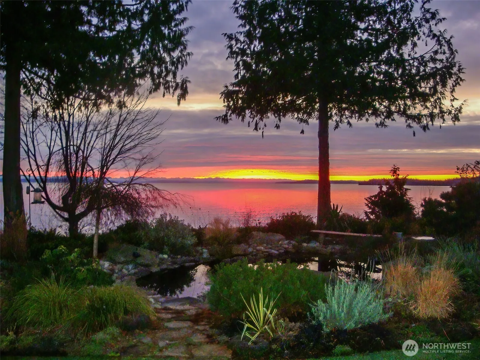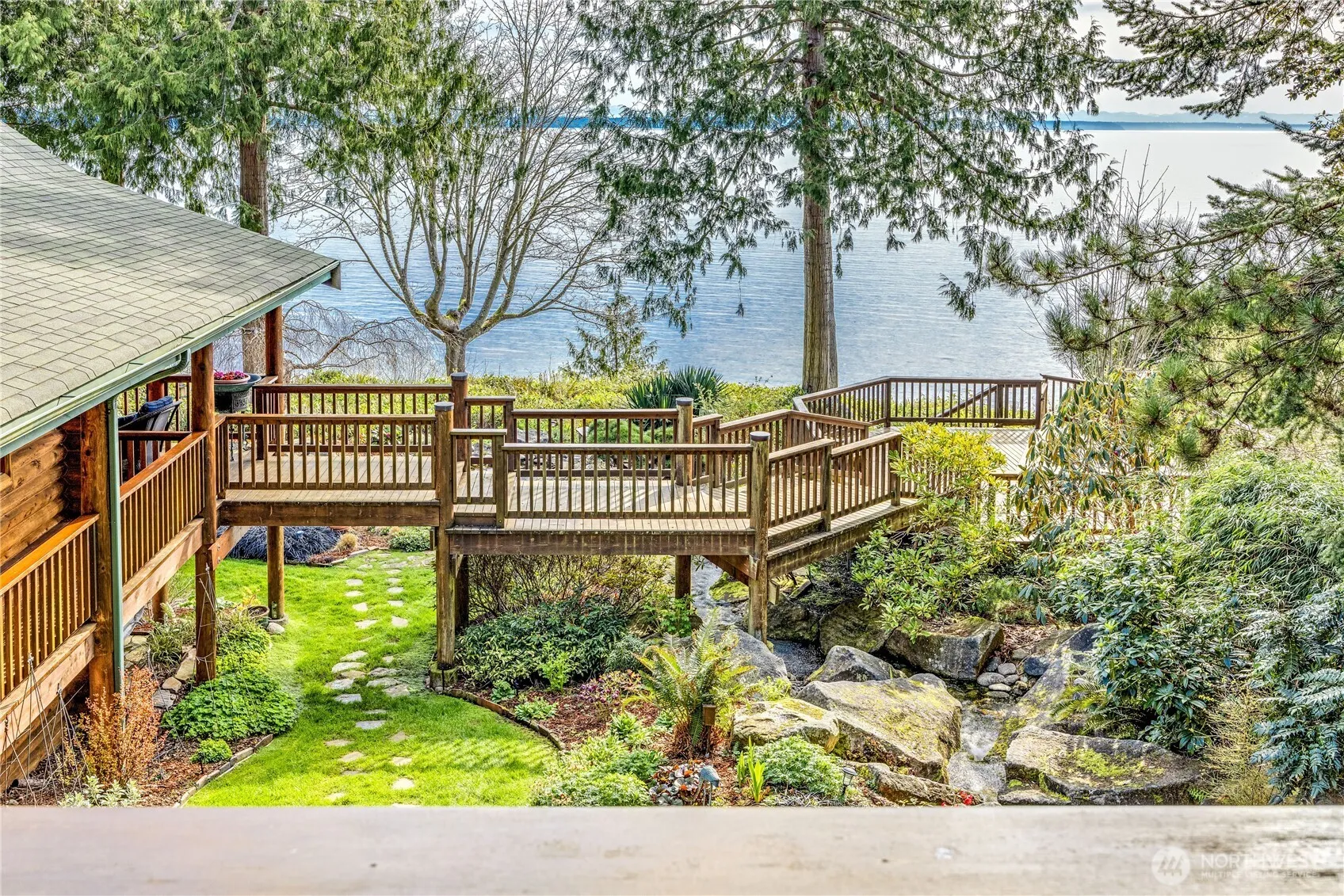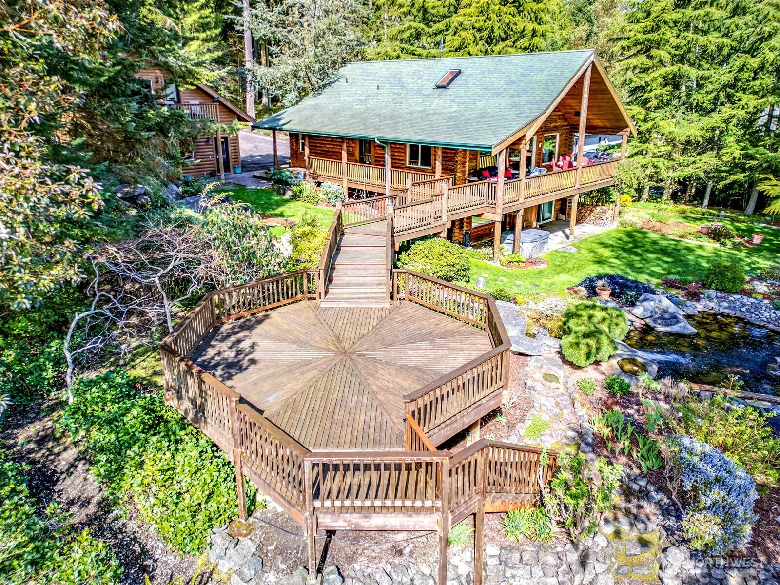 Stunning 2-bdrm, 2,708 sq ft waterfront home, plus a 1-bdrm, 816 sq ft detached apartment with panoramic views of Puget Sound & Cascade Mtns! Peaceful & private, the setting features a spectacular waterfall that flows into a tranquil pond, and expansive decking overlooking the scenery. Completely rebuilt in 2004 with quality throughout, the beautiful main home features a dramatic open layout with a soaring river rock fireplace, a Chef’s kitchen with an expansive island, gas-range, custom pantry. Wake to sunrises from the primary ensuite, walk out to the hot tub or relax in the private bath w/steam shower. The loft bedroom offers a ¾ bath & lots of storage. Apartment over the 3-car garage/shop has a full bath, kitchen, deck & amazing views!