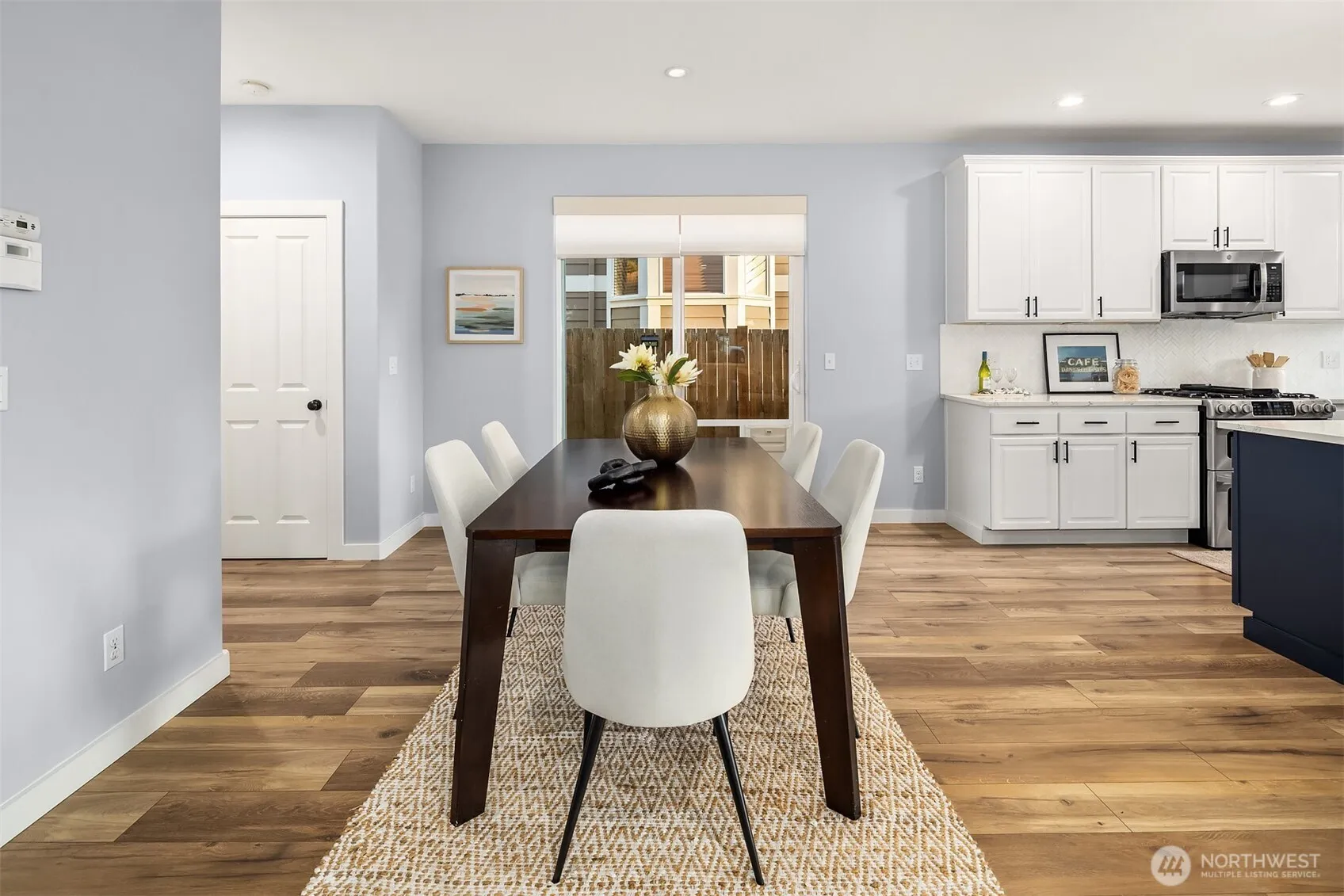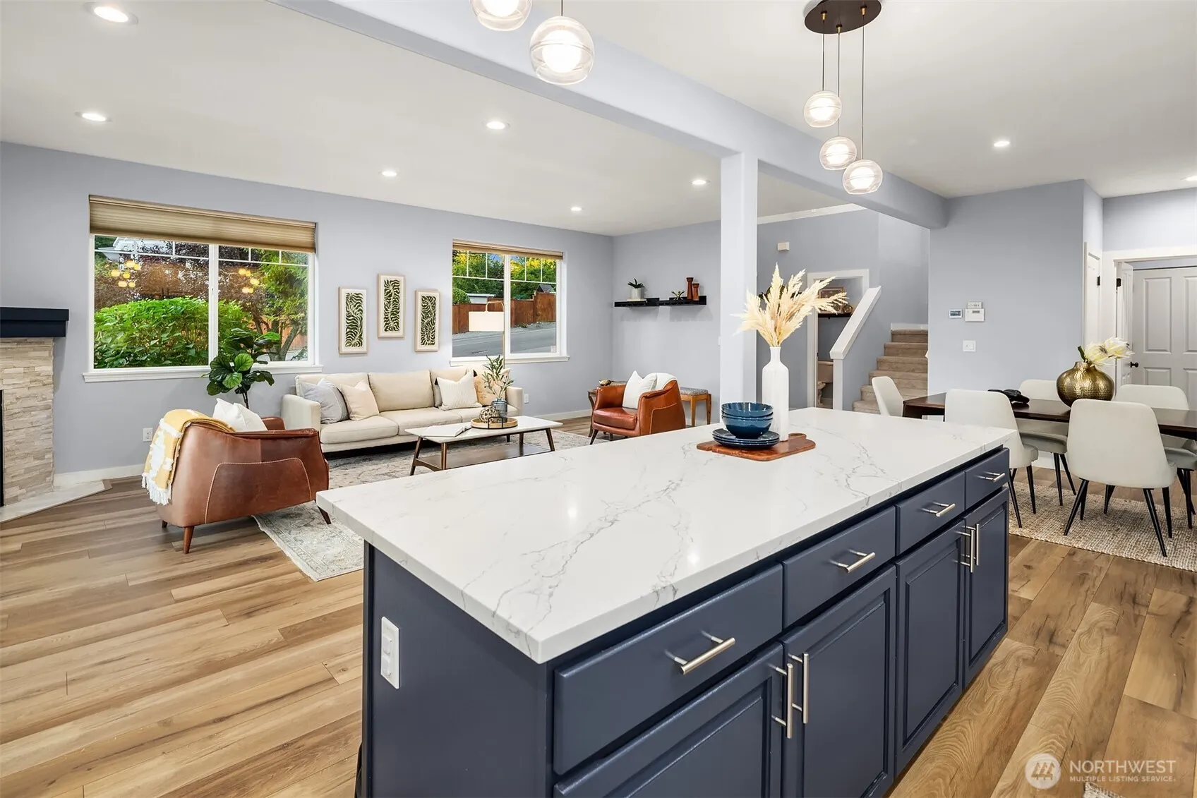Welcome to this impeccably maintained Maplewood home offering exceptional layout and outdoor living. The open-concept main floor includes a flexible front space, dining area, living room with gas fireplace, and a well-appointed kitchen with island seating. Upstairs, the thoughtful layout features a private owner’s suite separated from three additional bedrooms and a full bath. Enjoy two distinct outdoor entertaining areas—a deck off the living room and a large side patio—plus dog run. The home also features a three-car garage with EV charging and pulley-based overhead storage. Fresh paint and new flooring throughout make this home truly move-in ready. Close proximity to walkable amenities: parks, schools and coffee shops.