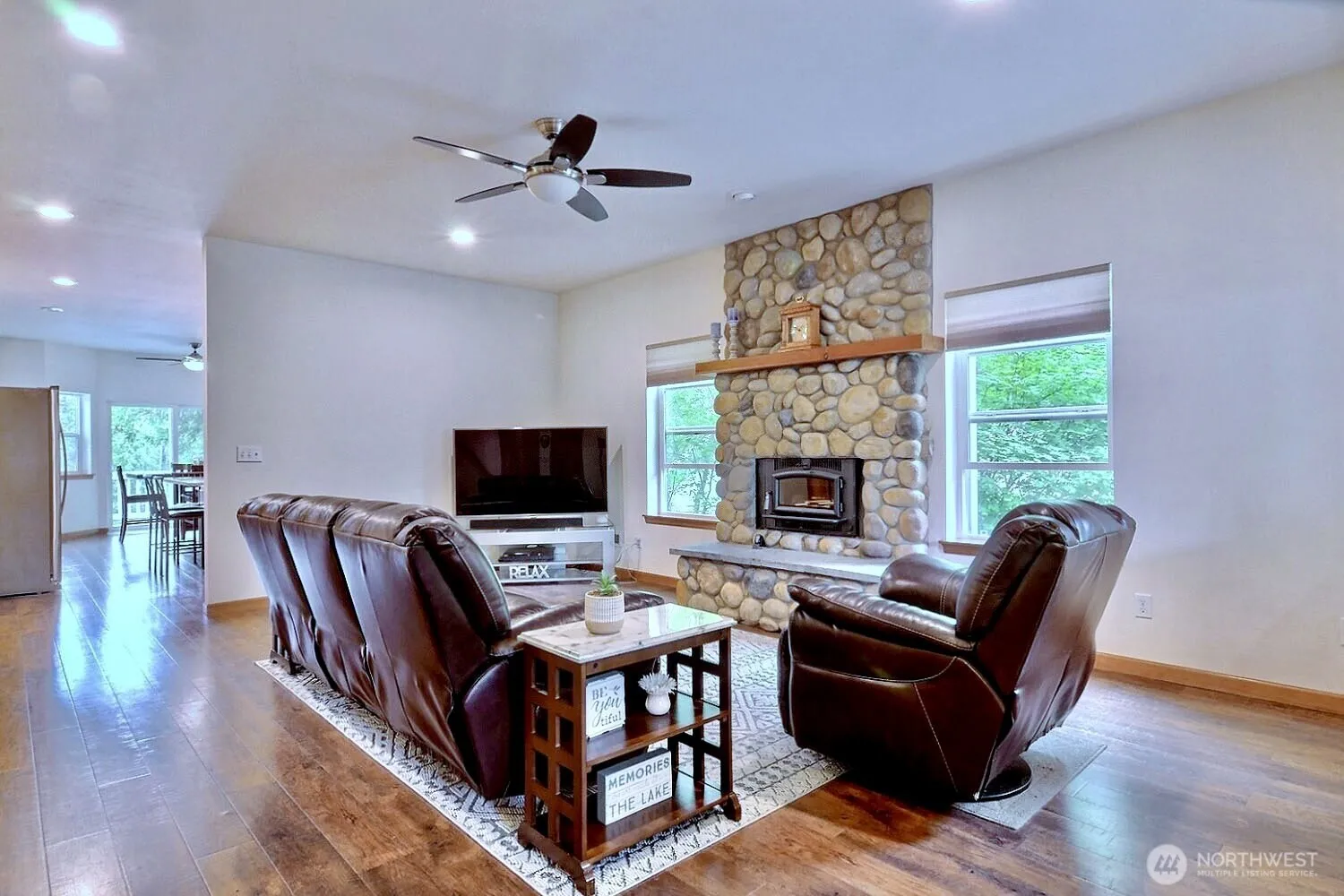 Life at the Lake awaits! 2783 sq.ft. home has been meticulously maintained & is ready for lakefront memories! A main-floor primary suite ensures this home appeals to all. 2 additional bedrooms PLUS a loft den/office and a bonus room. Large windows and lake views compliment quartz countertops and stainless appliances in the kitchen. River rock fireplace, wide planked floors, six-panel doors, central air, ample decks for entertaining, fire pit, and storage for the tools & toys. Enjoy your private deep-water dock, perfect for boating, kayaking, swimming, or sunbathing. Attached two car garage, detached carport, new roof, new hot water tank. Perfection!