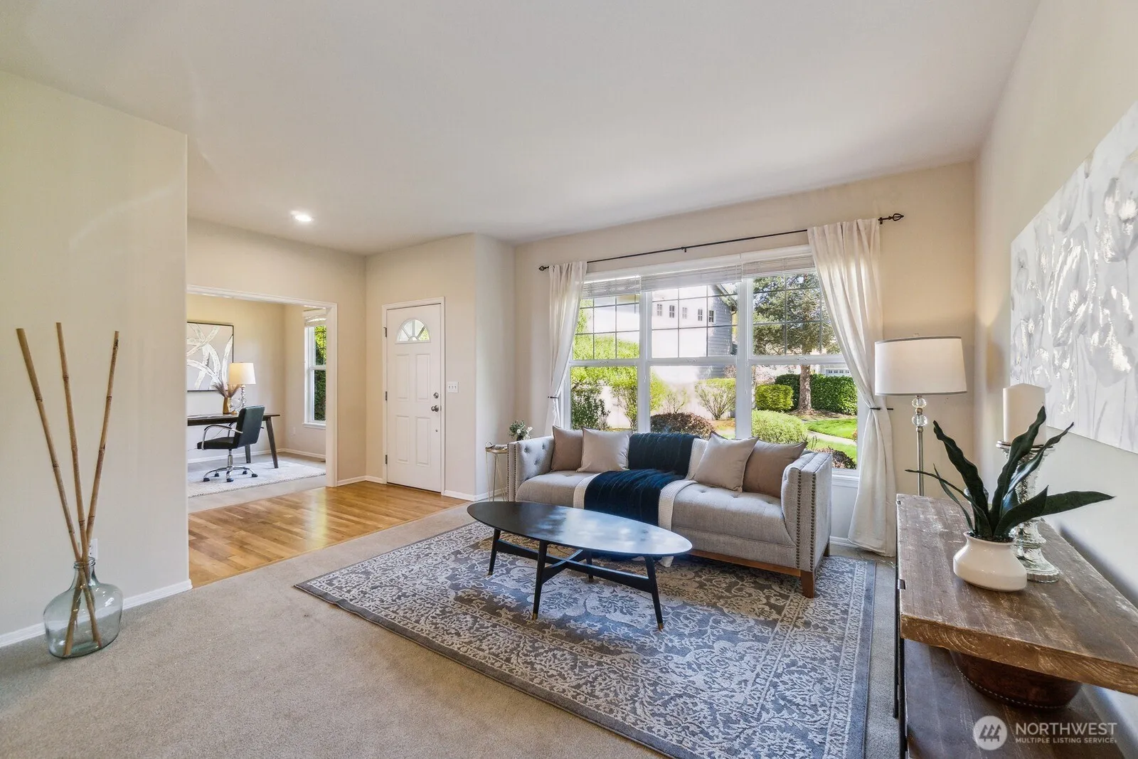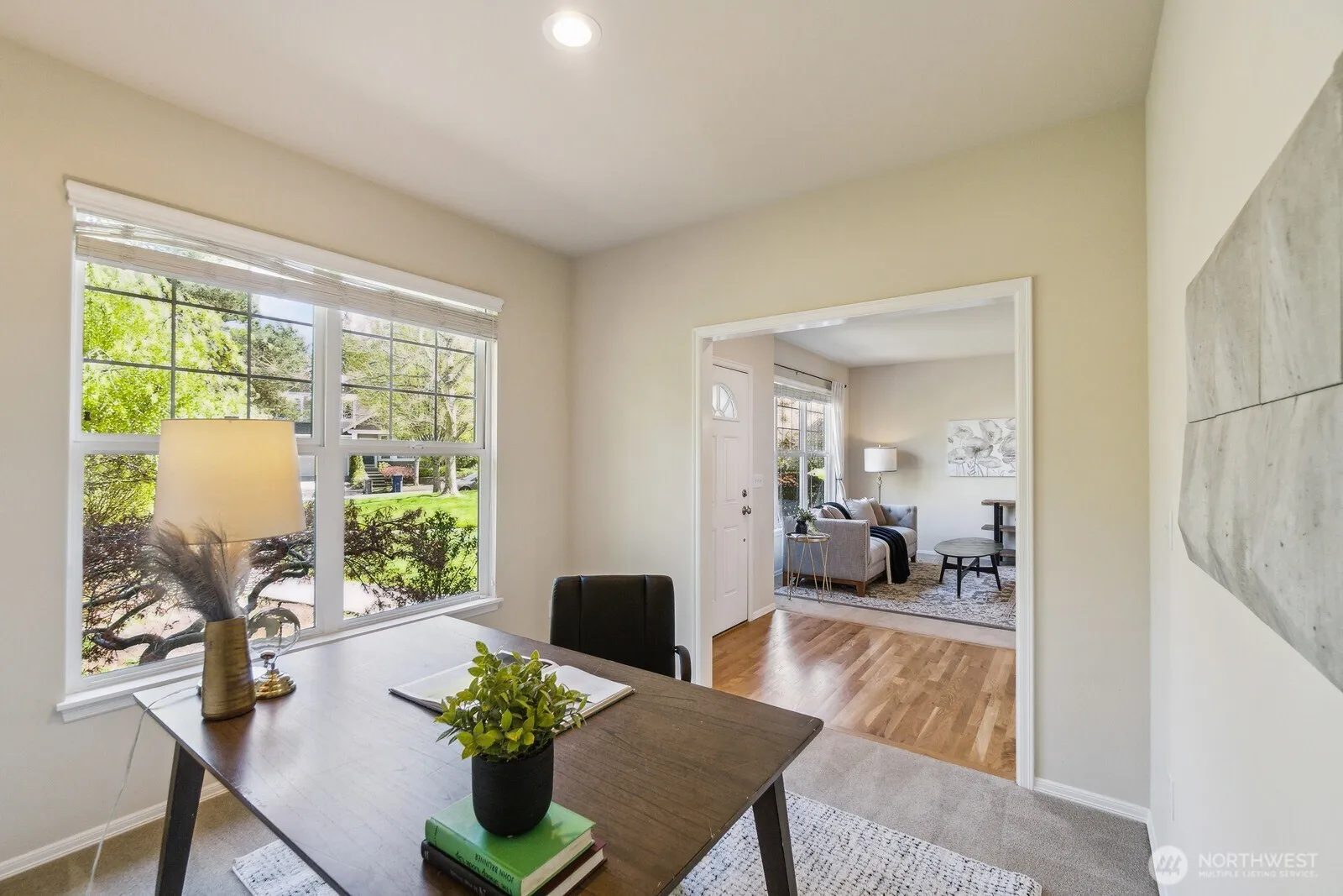 Nestled in the desirable Harbour Pointe Village, this beautifully maintained home sits in a tranquil, park-like setting with lush landscaping in front & a serene flagstone patio & garden oasis in back—perfect for relaxing or entertaining. Inside, you’re welcomed by rich hardwood floors, a private main-level office, and a spacious living room with soaring ceilings and a cozy gas fireplace. The kitchen features a sunny breakfast nook & looks out to the peaceful backyard, creating a seamless indoor-outdoor flow. Upstairs, the bright primary suite boasts vaulted ceilings, a spa-like ensuite bathroom, and generous closet space. Two additional bedrooms & a full guest bath. Short walk to top-rated schools, restaurants, parks, and scenic trails.