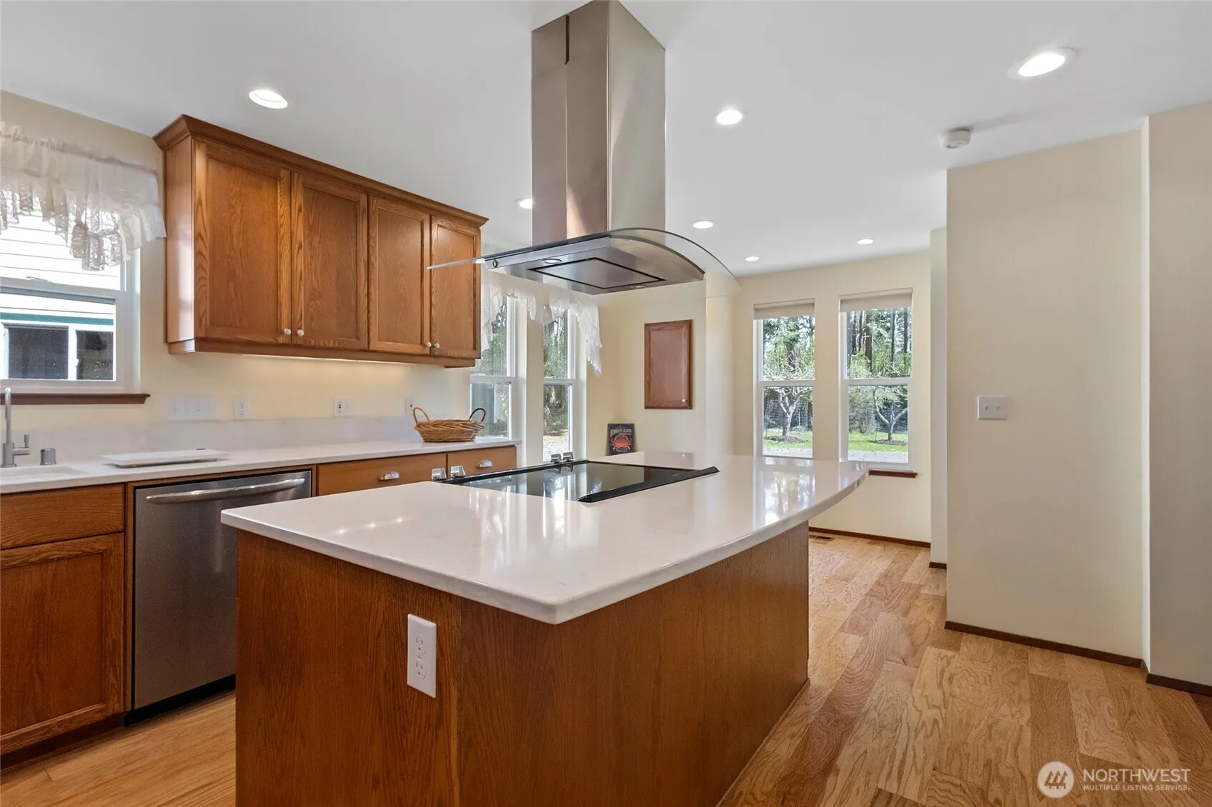 Delightful, storybook home set on 2.4 park like acres. The wrap around decks lead you into a comfortable, well laid out home. The updated kitchen features beautiful Quartz countertops and a sun filled breakfast nook. Wood floors throughout. The extra large, light filled primary bedroom features an ensuite bathroom, walk in closet, its own charming turret, and a private deck. Extra storage in the stand up attic. Wait until you see the amazing space above the 2 car detached garage! The carriage house is heated, 610 sq ft (included in overall sq footage) and features a kitchenette and 3/4 bathroom. So many possibilities up there! Walk the maintained trails and check out the beautiful acreage. A new, updated drain field is being installed.
