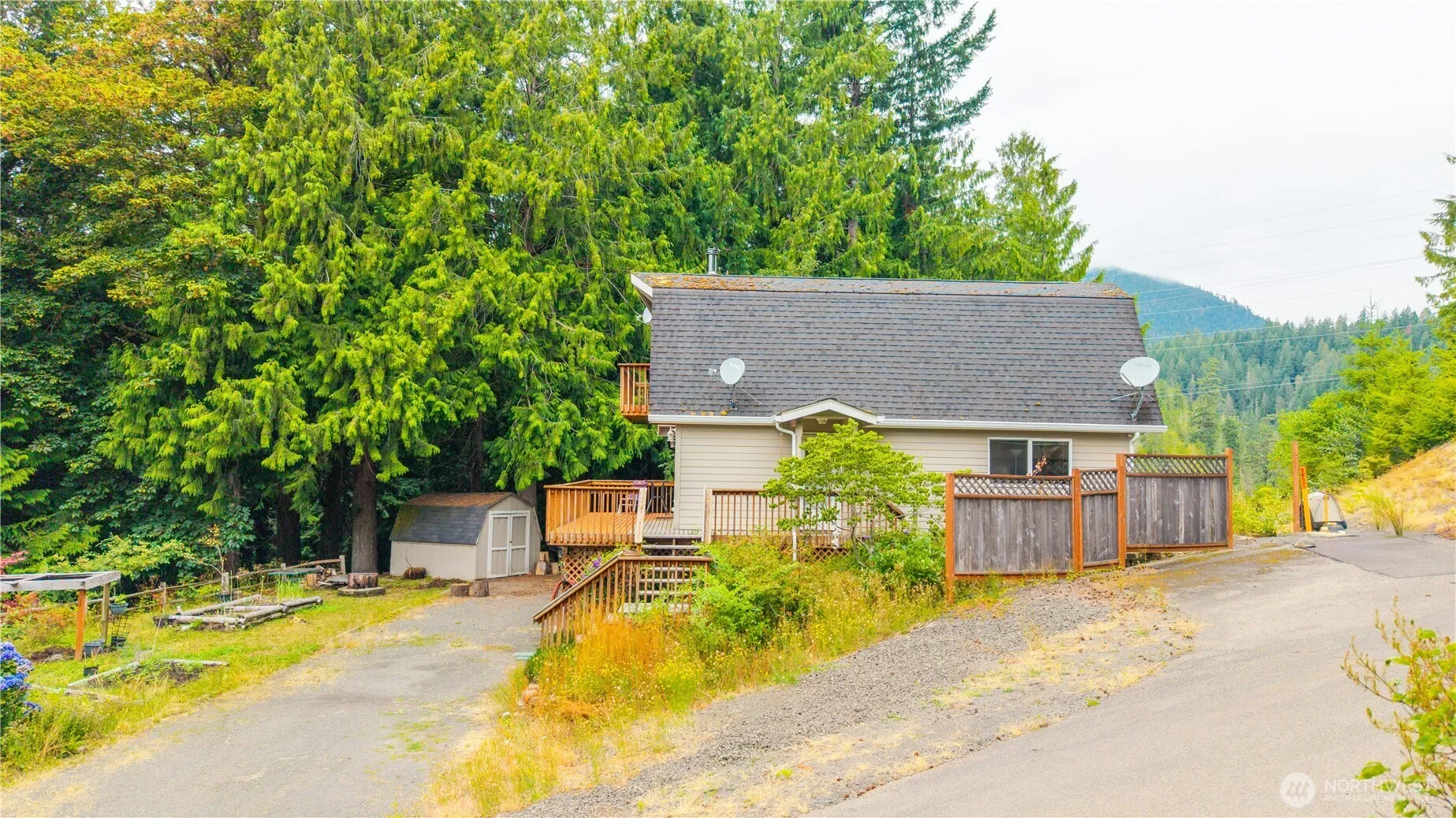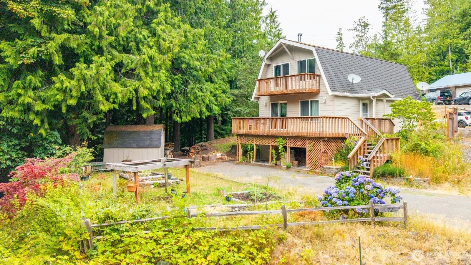 Well-maintained Gambrel-style home with Brazilian teak floors and a custom kitchen. Open floor plan makes entertaining easy. Ground-level entry and driveway allow for single-level living. This home is 3 bedrooms (2 bedroom septic). Main-level den/office has a possibility of being a 3rd bedroom. Full bath and laundry on the main floor. Spacious master bedroom on 2nd level features a walk-out balcony—perfect for morning coffee or sunset views. Cold storage room in basement area – great for canning. Multiple outbuildings for storage and lots of garden space. Enjoy decks on both levels for soaking up the sun and wildlife. Private community beach access on Hood Canal.