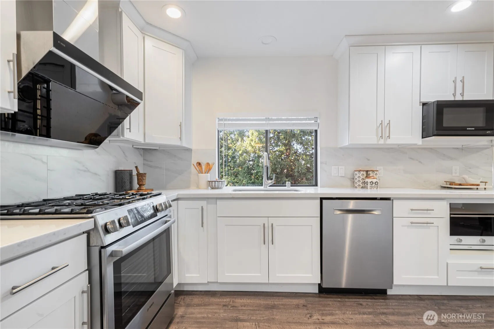 Beautifully renovated and move-in ready, this home offers the perfect blend of space, privacy, and convenience. Vaulted ceilings create an open, airy feel. The oversized primary suite includes a bonus room—ideal for a home office—and a spa-inspired upgraded bath. The modern kitchen features new appliances, paired with new flooring throughout. A remodeled lower level with private entrance, second kitchen, and laundry hook-up offers MIL or rental potential. Enjoy the fully fenced yard with lush landscaping and an expansive patio, perfect for entertaining. Located minutes from I-405, I-90, shopping, dining, and steps from Hazelwood Park. No HOA, with A/C and extensive updates throughout.