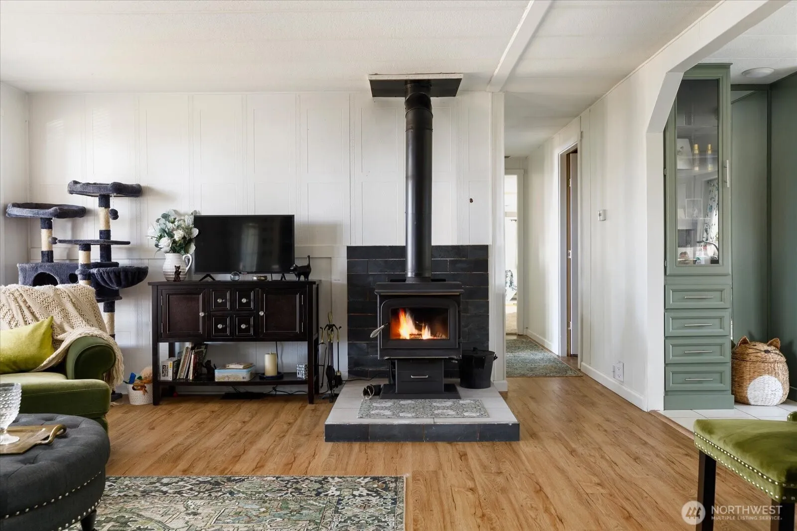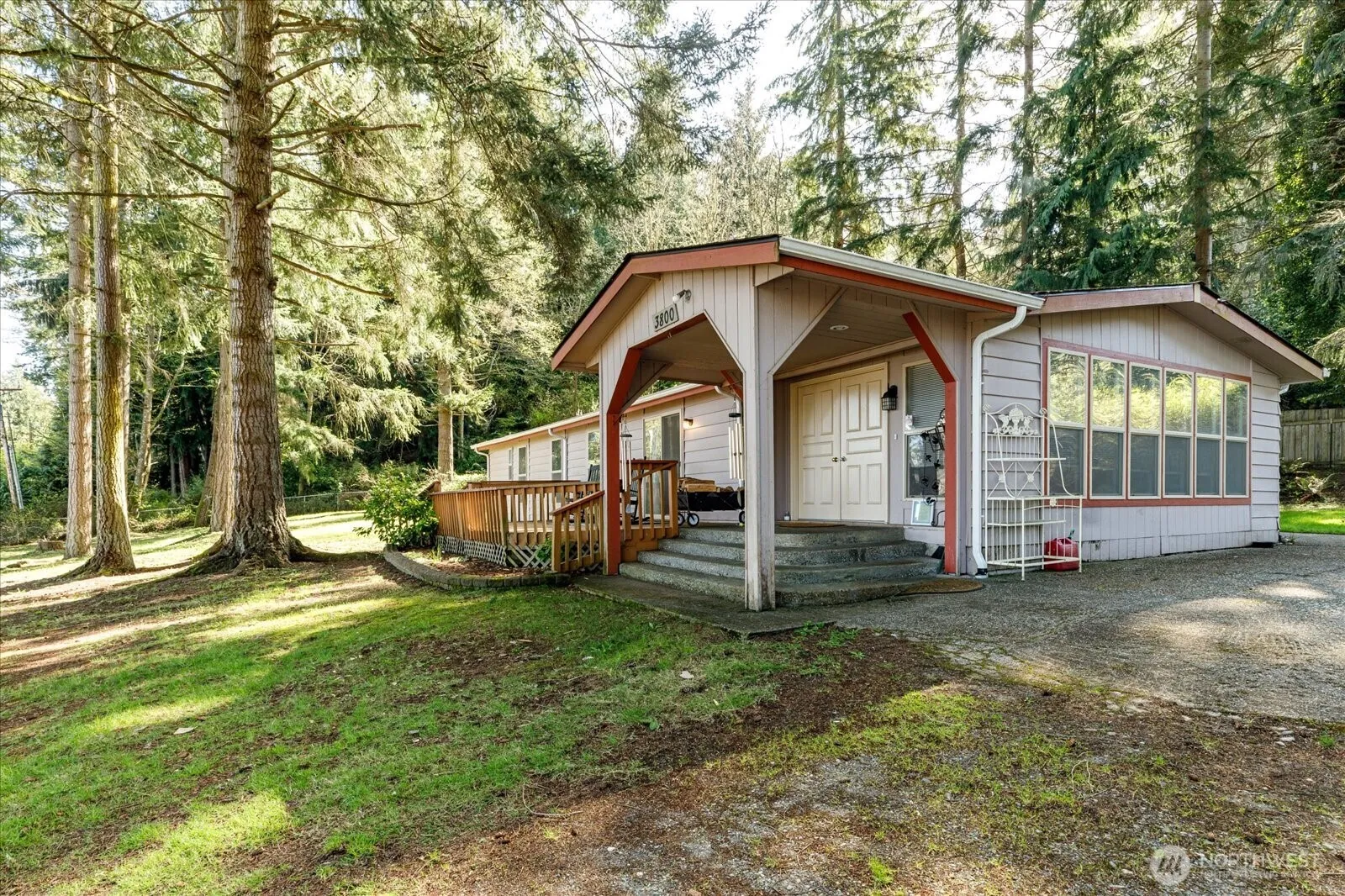 Tucked in the trees this 1976 manufactured home brings cozy living to island life, located 10 minutes from downtown Langley. Featuring 3 bedrooms, 2 bathrooms, and a large flex space as you enter the home. Newer LPV floors, newly installed (March 2025) carpet, fridge and oven and cabinets in flex room. The home is located on a large double lot with plenty of space for outdoor activities with a back patio ready for your summer BBQ. Cozy wood burning fireplace located in the center of the home to keep you warm on rainy days. Fully fenced yard and plenty of parking.