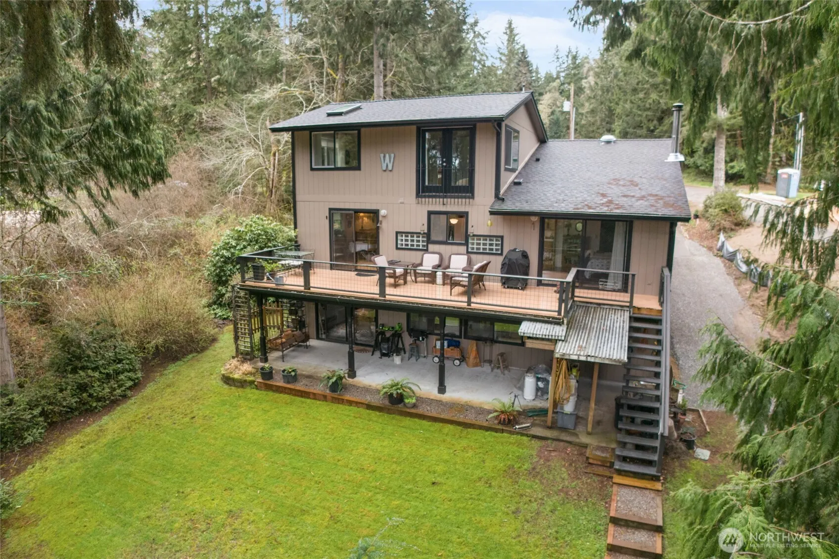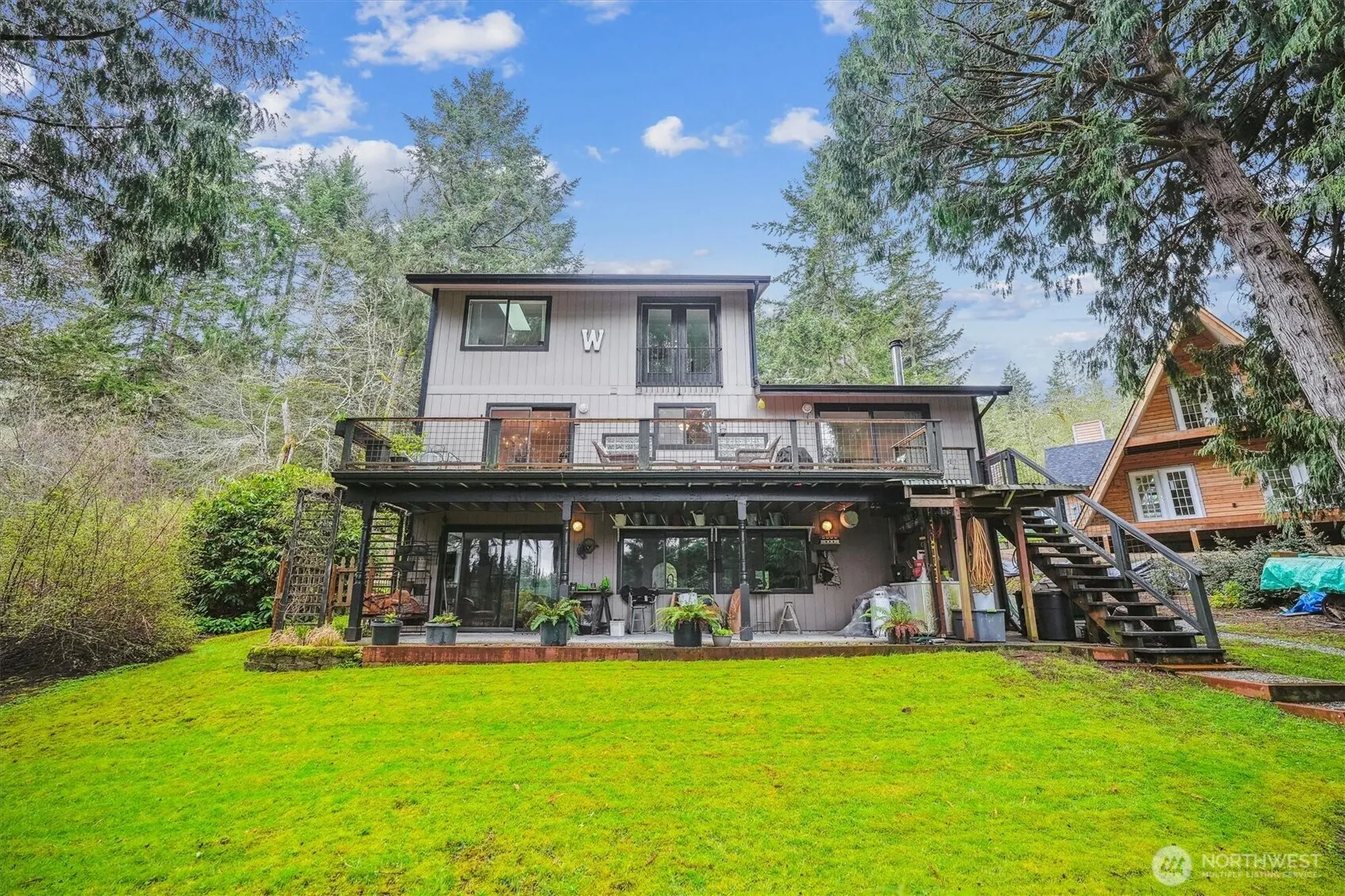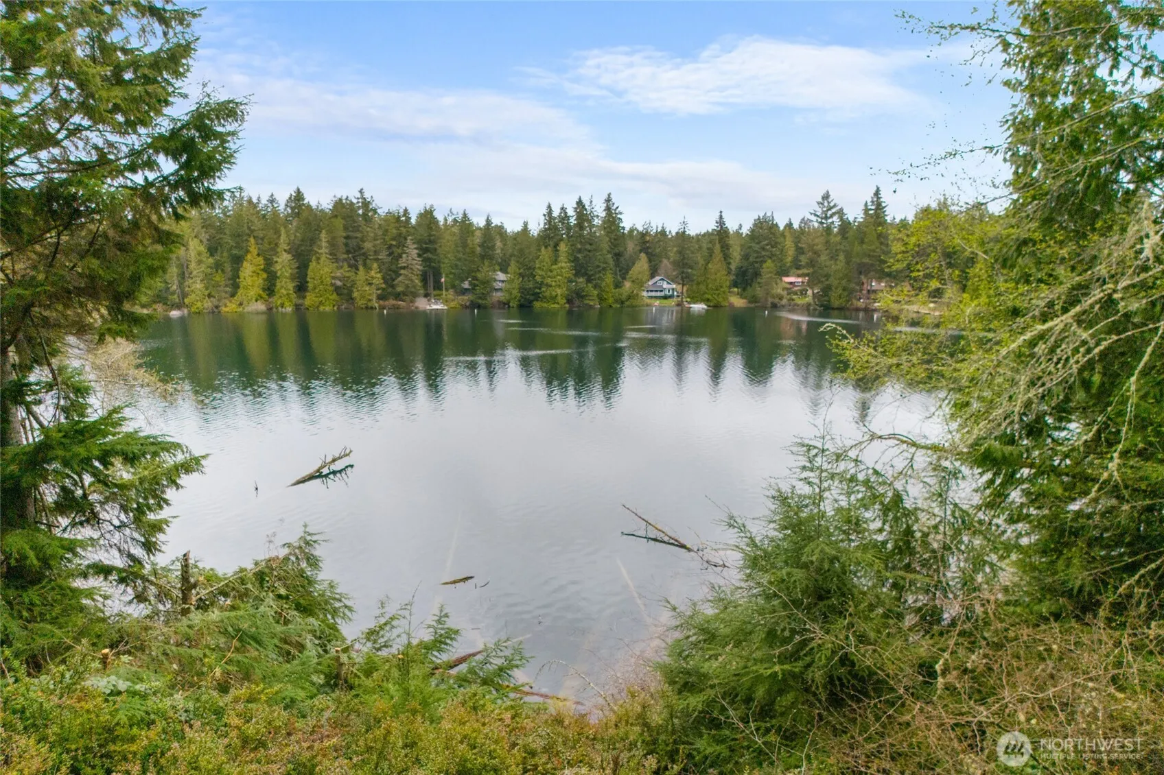 Perched overlooking pristine Lake Florence, this spacious & comfortable home offers serene water views and easy lake access. Enter to light &bright living room w/ vaulted ceilings, hardwood floors, a venting skylight & cozy pellet fireplace. Enjoy breathtaking water views in the updated kitchen &dining space, which open to an expansive deck for all your entertaining needs. The main floor primary suite offers the convenience of single-level living, while upstairs is a second primary suite w/ updated 3/4 bath. The finished daylight basement affords ample space for guests, hobbies, or multi-gen living with a bedroom, den, full bath, kitchenette, patio, & wood stove. New roof in 2023! Embrace island living in this peaceful oasis!