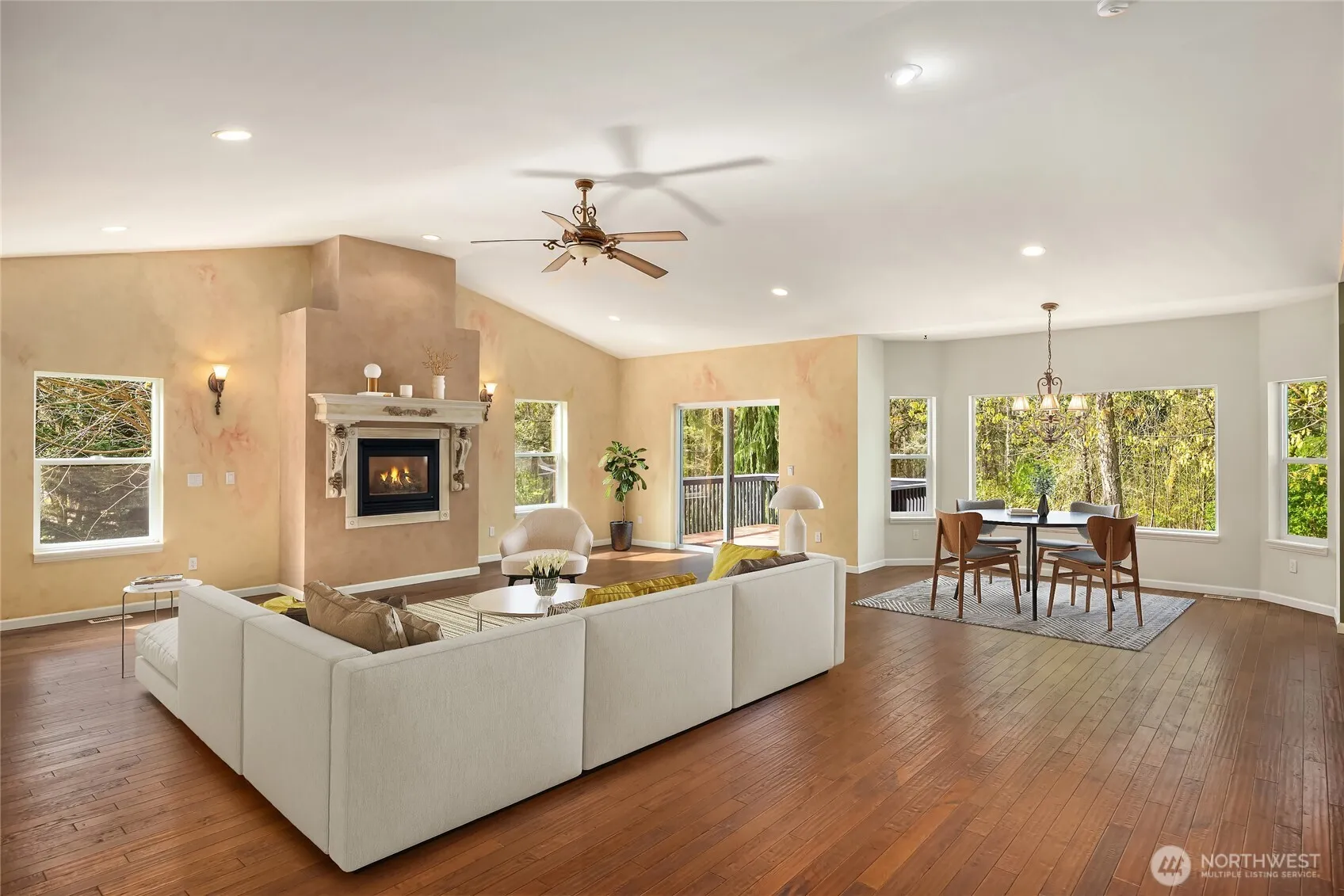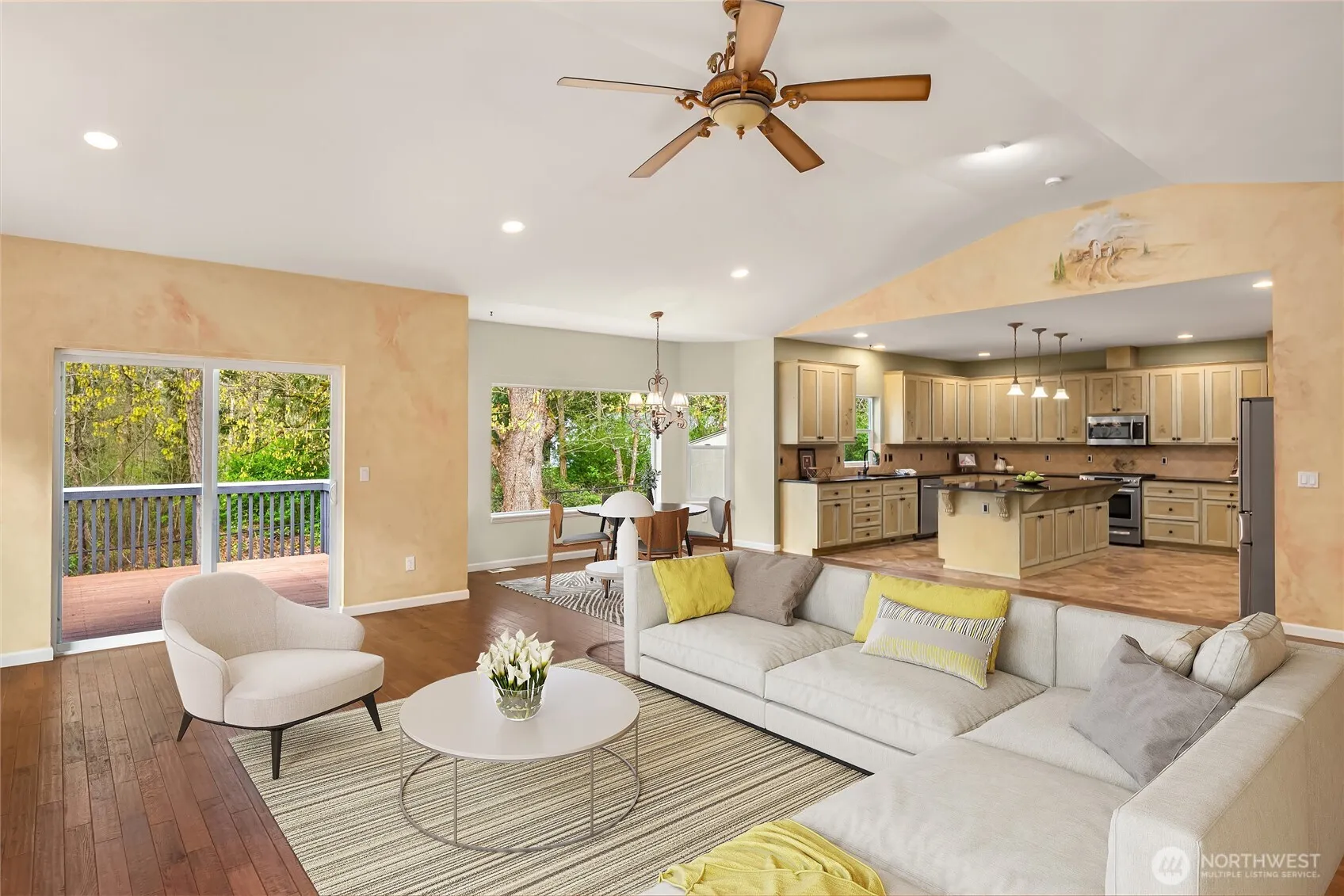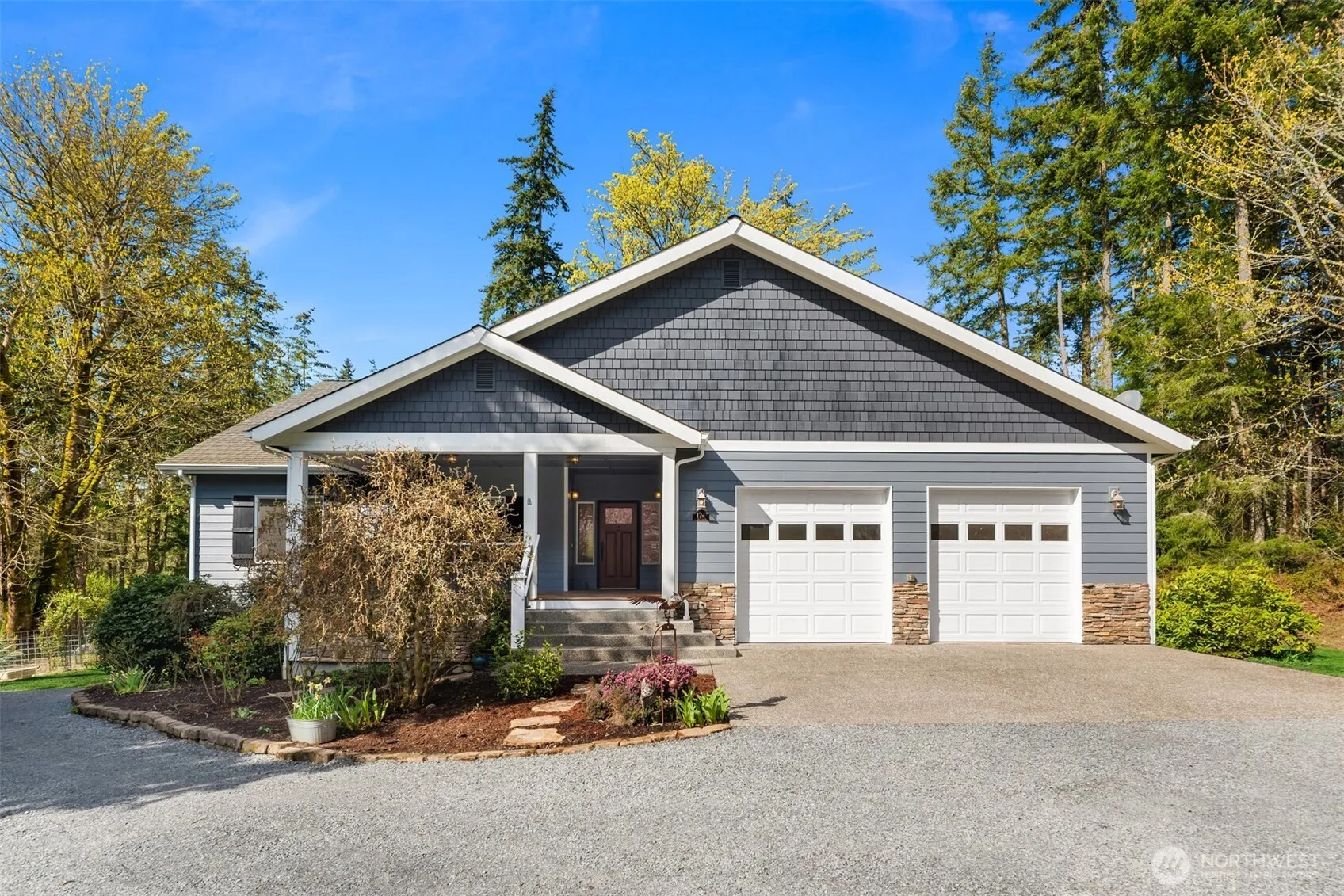 2.4-acre sanctuary offers main-level living designed for entertaining. Features include an open layout, vaulted ceilings, gas fireplace, hardwood floors, and designer faux paint accents. Large kitchen offers custom designer painted cabinets, travertine floors, and large eating bar for 4 & pantry. The spacious primary suite boasts a 5-piece bath, walk-in closet, and private deck access. Enjoy 3 sunlit decks, a hot tub, a separate art studio, oversized 2-car garage, and an 800 sq. ft. heated shop/game room with separate entrance. RV parking with garden space complete this peaceful private retreat. Surrounded by towering trees with Elger Bay trails out your back door, this level lot is all usable w/ room for shop. Close to beaches and schools.