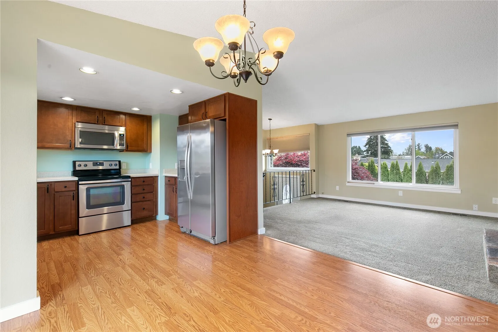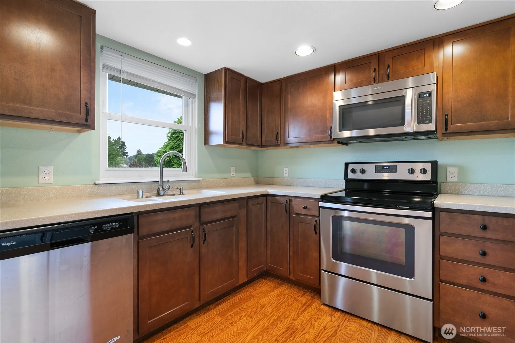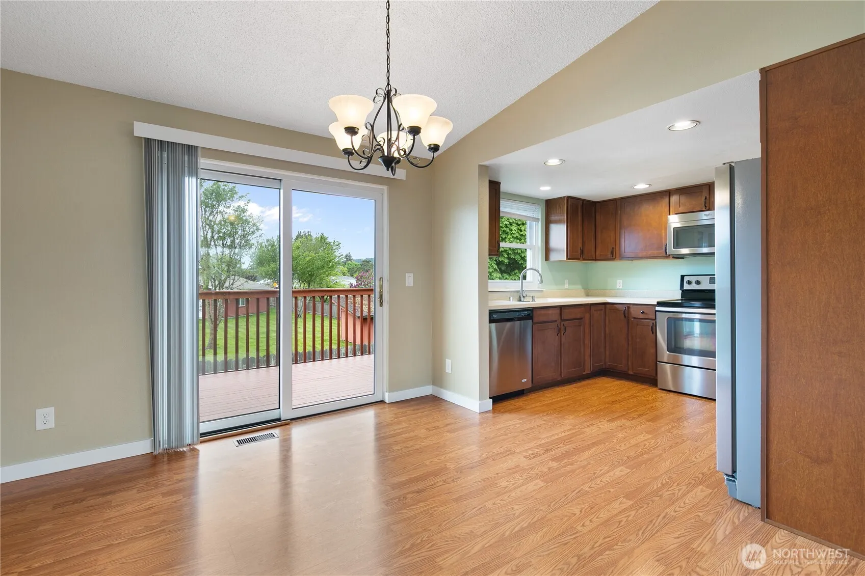 Charming 4 bed, 1.75 bath split-level home in the heart of Sumner! Nestled on an immaculate lot, this home offers a spacious layout with vaulted ceilings and a cozy wood-burning fireplace in the upstairs living room. The dining area opens to a deck through sliding doors, perfect for entertaining. Kitchen features stainless steel appliances. Two upstairs bedrooms, including a primary with access to the 3/4 bath. Downstairs includes 2 more bedrooms, a full bath, additional living space with fireplace, and a separate entrance—ideal for multigenerational living or potential ADU. Large fully fenced yard and attached 2-car garage. Close to shops, restaurants, and cafes.