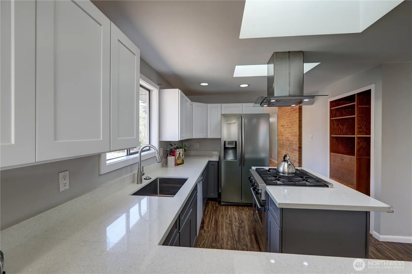 Welcome to your updated mid-century modern home in the Angle Lake neighborhood of SeaTac. Featuring new soft-close cabinets with quartz countertops and island-mounted stove with eating space. Separate light-filled dining room is perfect for entertaining. LVP flooring throughout. Newly remodeled upstairs bathroom with tiled bathtub and new light fixture. Spacious living room w/ fireplace. Basement bedrooms have good ceiling height and plenty of space! Large wrap-around covered deck overlooks a spacious backyard. Close to SeaTac airport and Light Rail.