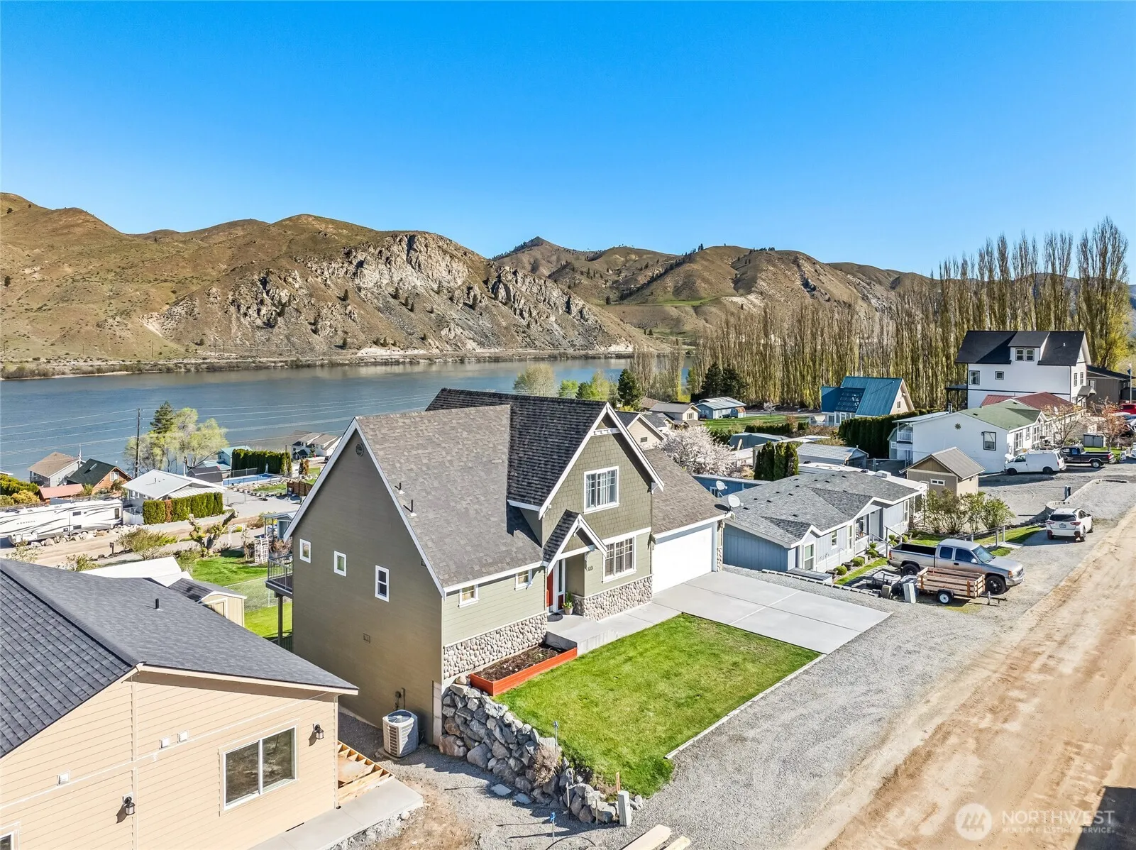 HUGE PRICE REDUCTION! All furnishings included in sale! Majestic Mountain & River Views from every room! Professionally maintained spacious 3 bdrm, 2.5 bath home with vaulted ceilings, huge loft & open floor plan. Gourmet kitchen with breakfast bar, custom cherry cabinetry & stainless steel appliances. Main floor primary bedroom with private deck. Primary bath has soaking tub, duel shower & dual vanities. 2 basement bedrooms serviced by a full bathroom & large family room with slider to back patio. Community access to boat launch & dock. Finished garage. Hot/cold water exterior hose faucet. RV parking & garden area. New Paint in/out. Newer $4000 awning system for deck. Great Airbnb location! American Home Shield Warranty provided.