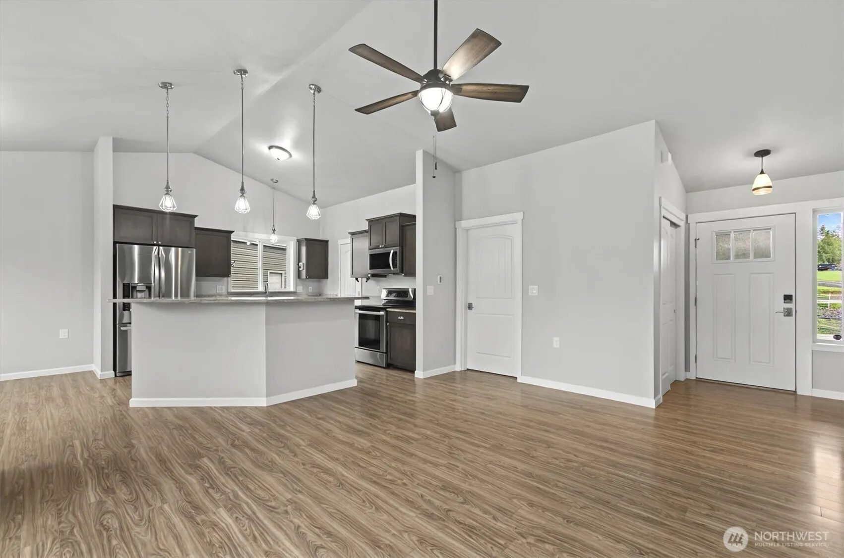 Step into heaven with this stunning home that redefines single story living. Built in 2018, this three-bedroom, two-bathroom retreat boasts extra-wide doors, an expansive 2.57-acre property, and a nice size deck. Inside, discover an airy open floor plan, sleek kitchen with ample counter space, and a dining area perfect for gatherings. An amazing 2021 shop addition offers endless possibilities, and RV parking provides ample space for guests. With its open floor concept, laminate flooring, and vaulted ceilings, this home embodies freedom and possibility. The primary bedroom’s walk-in closet and en-suite complete this serene oasis..