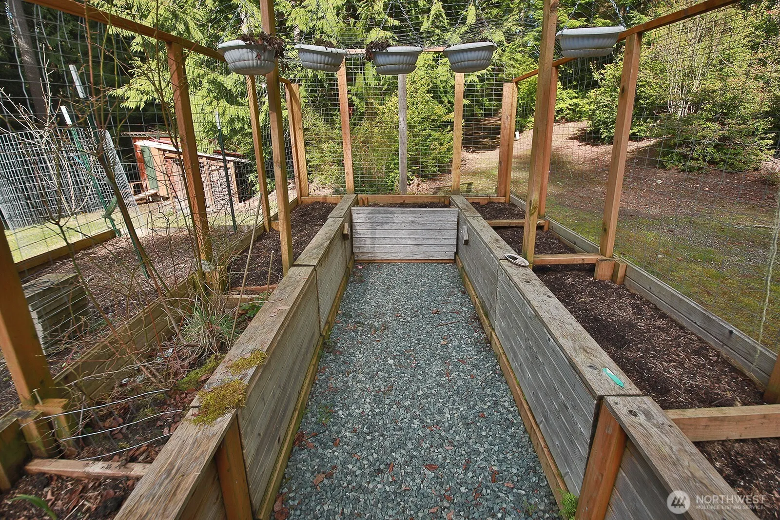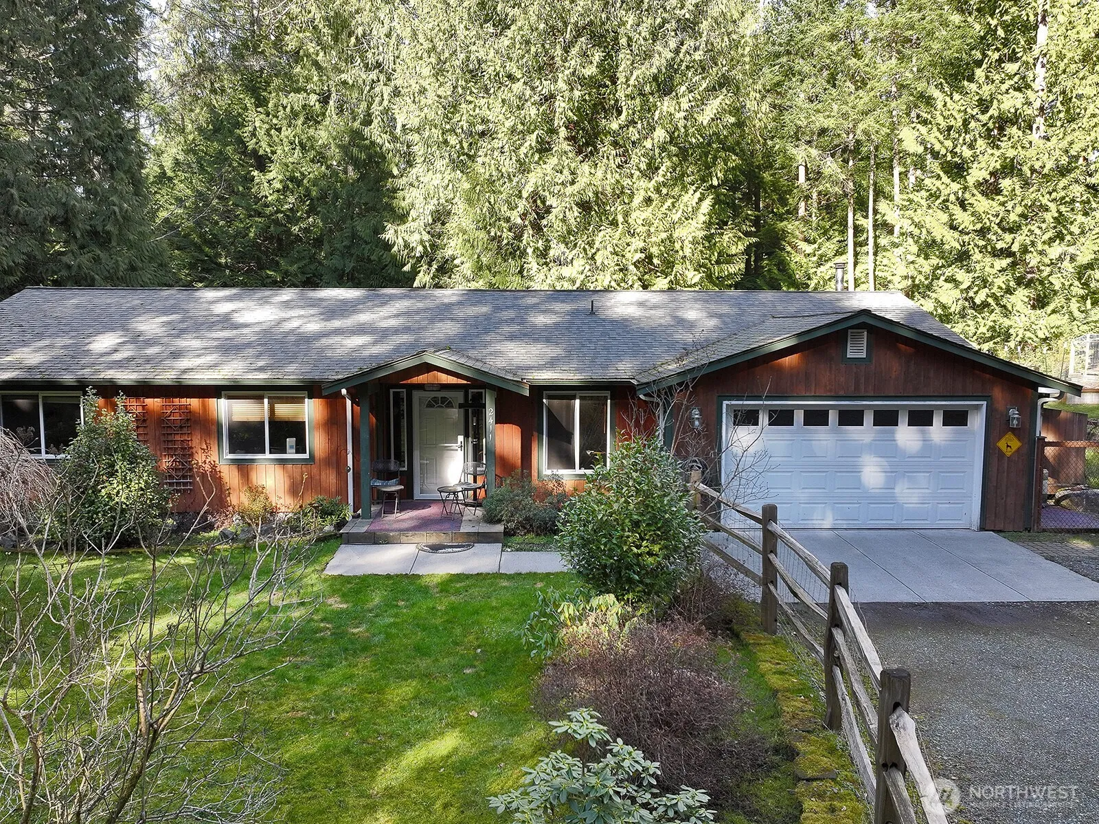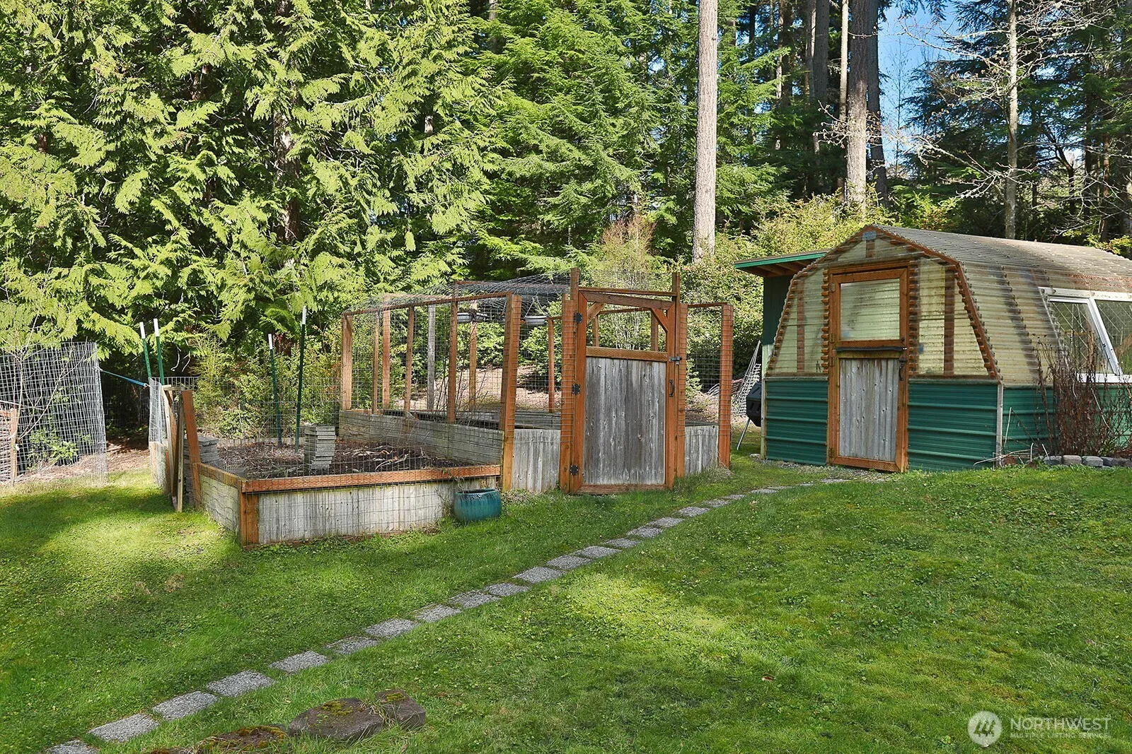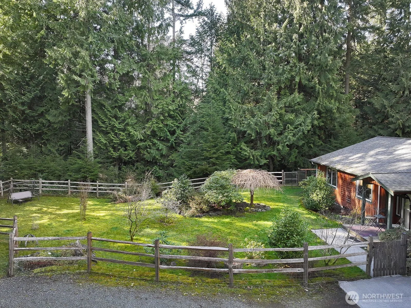 This is a magical setting on 2.4 acres with walking trails and serenity abounding. The land is a mix of open spaces, evergreens, and diverse wildlife. Enclosed gardens and a greenhouse sit alongside a cabin used as an Airbnb, where many have come to exhale from the busyness of life. As you wander around, the back of the property features an RV pad, a large carport, wood storage, a shop with power, and numerous outbuildings. The one-level home features vaulted tongue-and-groove (T&G) ceilings, an open floor plan, a wood-burning stove, and skylights, which lend this home a cozy ambiance. The primary bath has been updated, and a hot tub awaits you outside. The side deck for relaxing has an automatic Sunbrella awning for warm days.