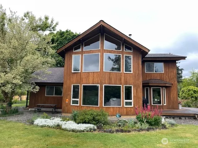You will be delighted with this custom Lindal Cedar home! It is gorgeous, with natural lighting throughout! Large picture windows and wood vaulted ceilings look out to the beautiful flower gardens. The open floor plan includes a spacious living room, formal dining room/opens to deck, breakfast nook, a bright kitchen with abundant cabinetry and a walk-in pantry. Included on the main floor is an office, utility room and 1/2 bath. Upstairs is a charming primary bedroom with attached 5 piece bath and jetted tub as well as two additional bedrooms and a guest bath. Outside features a two car garage with a large 2nd story room, attached greenhouse, 28×40 large shop, acres of peaceful landscaped grounds, fruit trees, grapevines and circular drive!