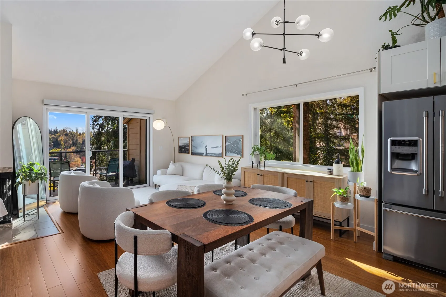 Welcome to this beautifully maintained, top-floor end unit that lives like a townhome. Thoughtfully renovated in 2018, this east-facing home features peekaboo views of Lk WA & the Cascades, vaulted ceilings, & oversized windows giving tons of natural light. The layout offers 1-bedroom, 1-bath down + a primary suite up. Additional upgrades are bamboo hardwoods, heated entry & bathroom flrs, new W/Dryer, & water heater, making this home truly move-in ready. Enjoy quiet mornings on your private deck w/additional storage, plus one covered pkg space. Located in a quiet, well-maintained community w/a strong HOA & large reserves, this pet-friendly home also has top-rated schools. Very walkable & just 10 minutes to Seattle or Bellevue. A Rare find!
