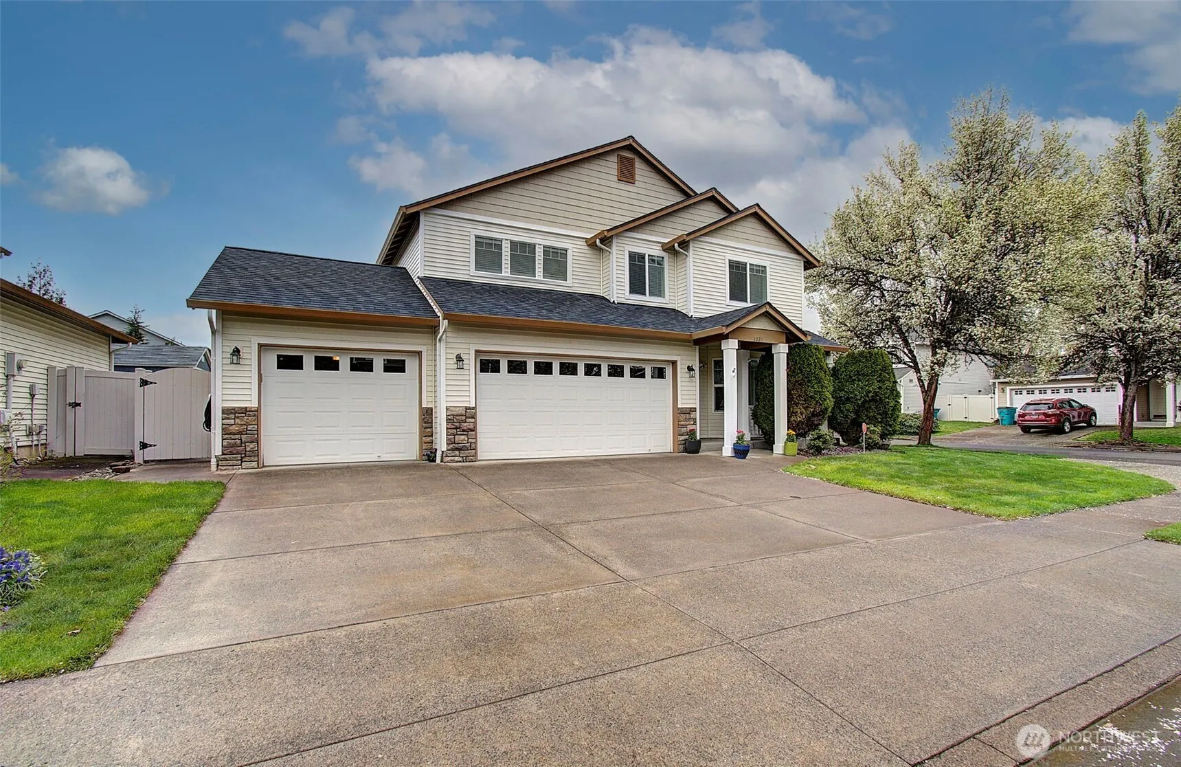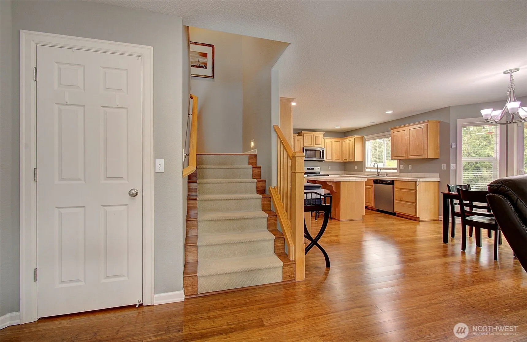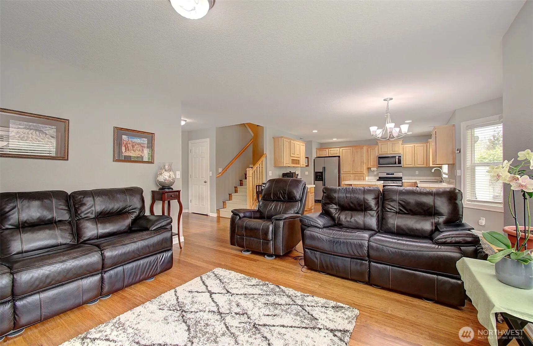 This beautifully maintained home boasts 4 bdrms, 2.5 baths, and a 3-car garage. Step inside to discover gorgeous bamboo flooring throughout the formal living, dining, and great rooms that offer ideal spaces for entertaining. The large great room, with gas fireplace, is an inviting gathering space. The kitchen flows comfortably from the family room and features an island making meal prep a breeze and a dedicated work station for a computer or extra serving space. The spacious primary offers vaulted ceilings, walk-in closet, and an en-suite bath complete with a soaking tub and dual sinks. Three additional bdrms, full bath and laundry complete the upper floor. This home is perfect for those seeking both comfort and style in a prime location.