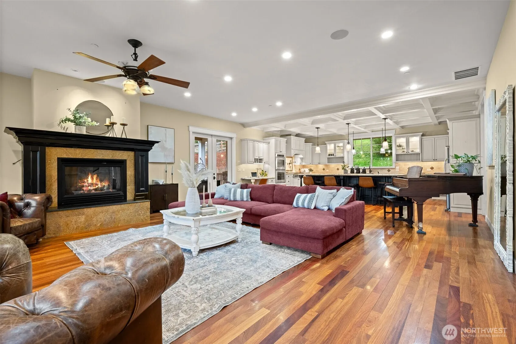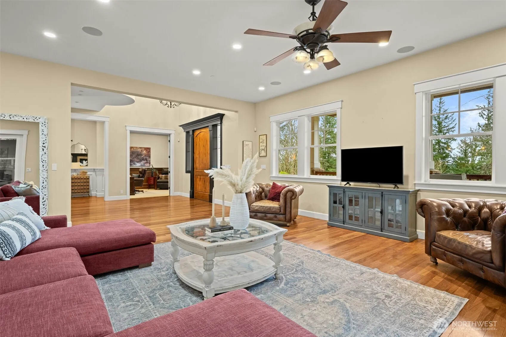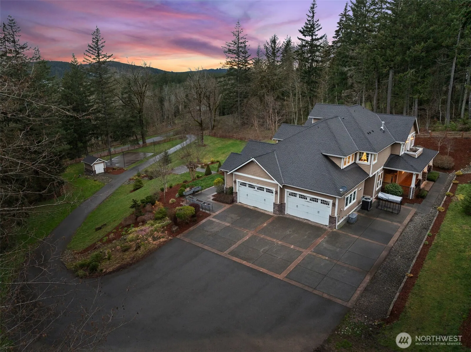 This breathtaking estate on nearly 4.5 acres, tucked behind a gated entry on a secluded dead-end street, offers luxury and views of Mt. Rainier. The grand entry features soaring ceilings and exquisite millwork, leading to a great room with a striking gas fireplace. The chef’s kitchen boasts dual refrigerators, dishwashers, ovens, a Dacor 6-burner cooktop, pot filler, granite counters, and an oversized island perfect for entertaining. The primary suite includes a fireplace, spa-like bath, and private deck access. Upstairs, two bedrooms share a Jack/Jill bath, plus a spacious bonus room with an en-suite. The game room, wrap-around covered deck, sport court, and motorcycle track enhance outdoor living, making this estate the ultimate retreat!