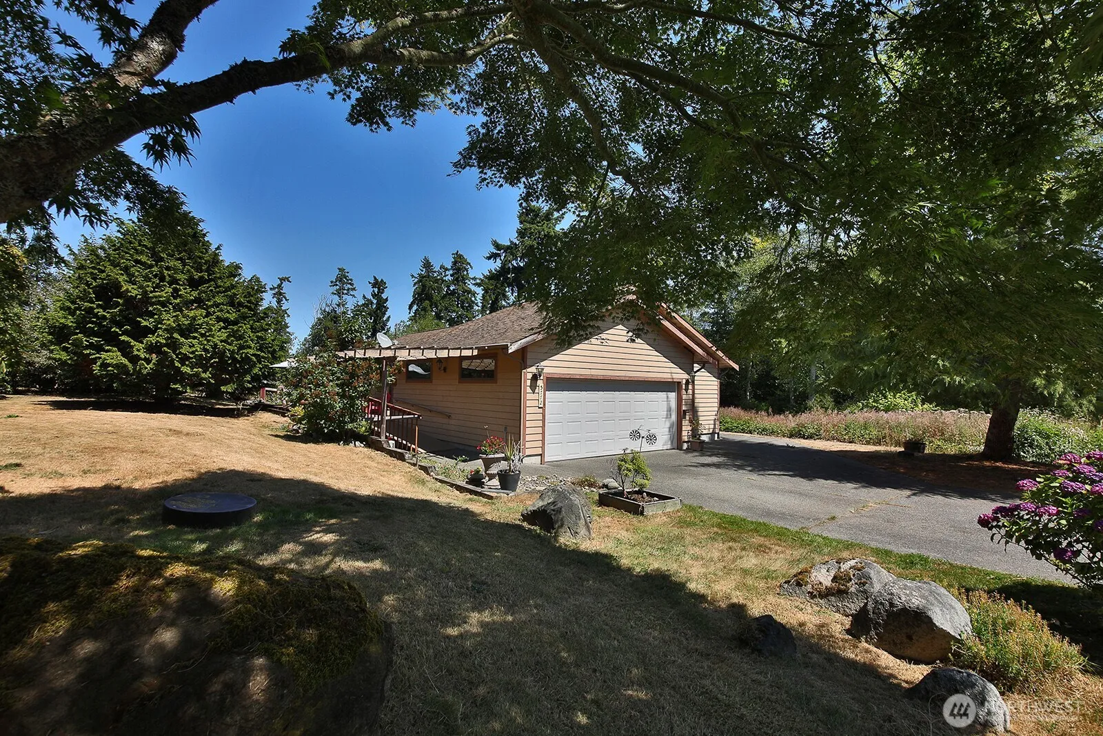 One-level home located in the Useless Bay Colony on a corner lot. Step inside to vaulted ceilings, skylights, and picture windows. An inviting open floor plan with a large kitchen, Viking stove, large pantry, and ample cabinets. The primary offers a 3/4 bathroom, while the den/additional guest room has a full bath. A large deck for enjoying BBQs or just unwinding from the day. The two-car garage features an extra side door, perfect for storing a golf cart or workshop. Leaf gutters are installed. The yard is open and sunny with apple, golden plum, and Asian pear trees. Community amenities include a pool, tennis courts, a gym, and private beach access.