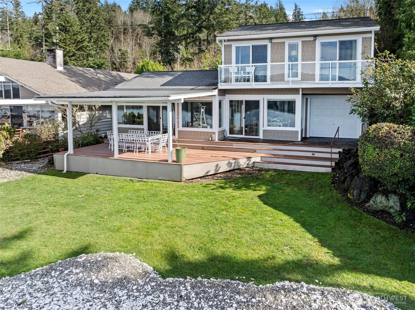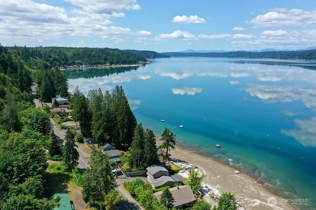 Motivated Seller~ Life on the water doesn’t get much better than this! A perfect opportunity to own a quaint low/no-bank waterfront home on the highly sought-after South Shore. Designed to embrace the breathtaking water & mountain views, this home is filled w/natural light, creating a seamless connection between indoor & outdoor living. Perfect for entertaining w/upgraded kitchen overlooking dining area flowing in to the living rm & effortlessly connecting to the covered deck & pass thru garage. Main floor also features walk in storage pantry & 1/2 bth. Up is 2 bdrms w/their own ensuite baths & private decks. Don’t miss this incredible opportunity to own a fully furnished waterfront retreat …ideal for hosting, relaxing, rental or?