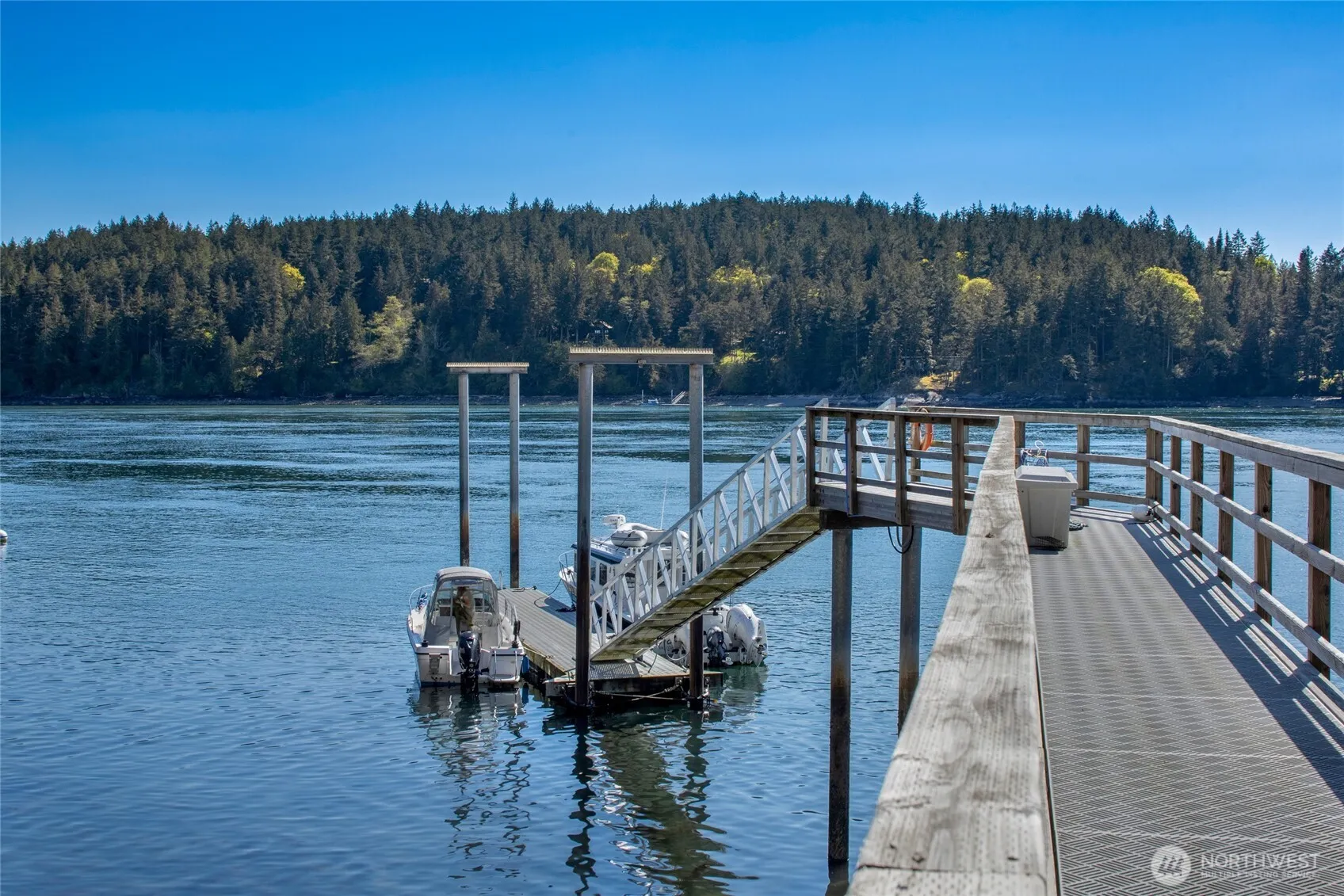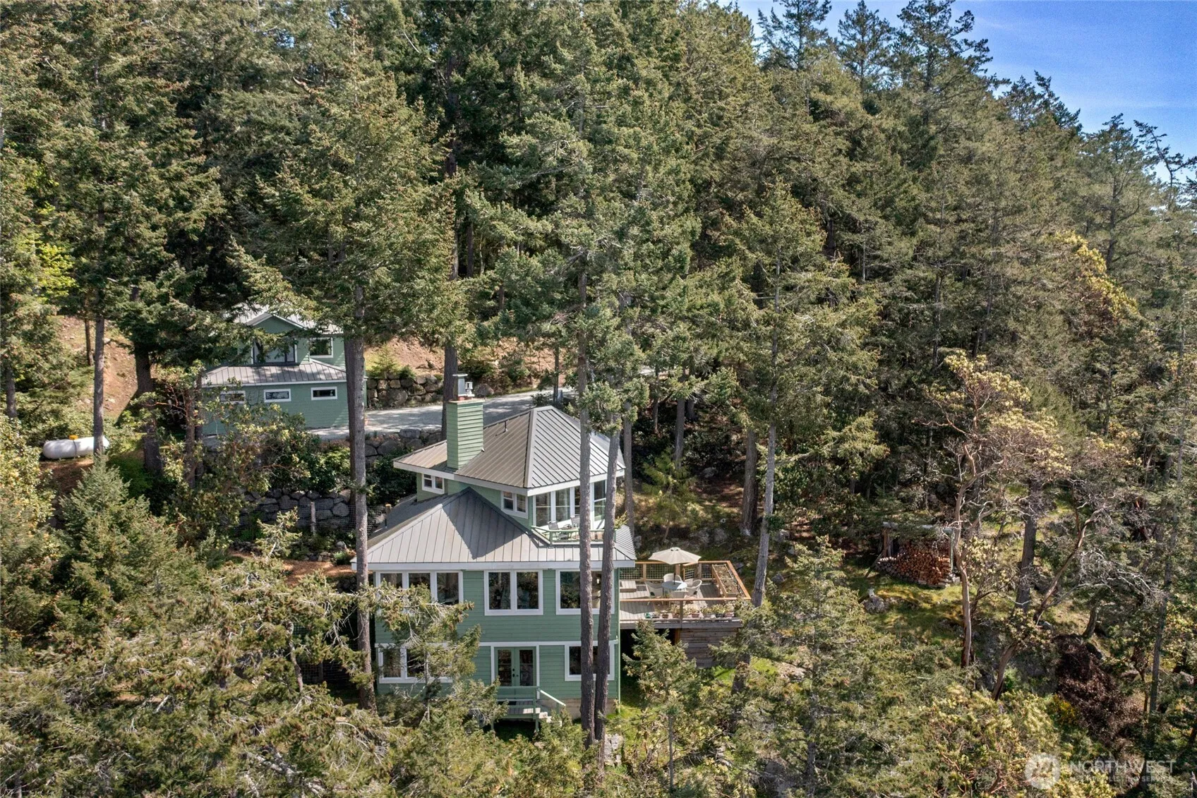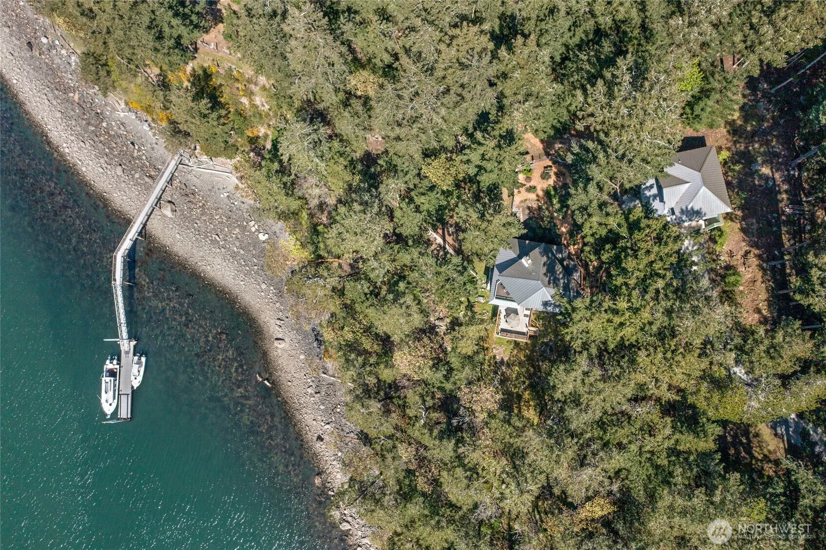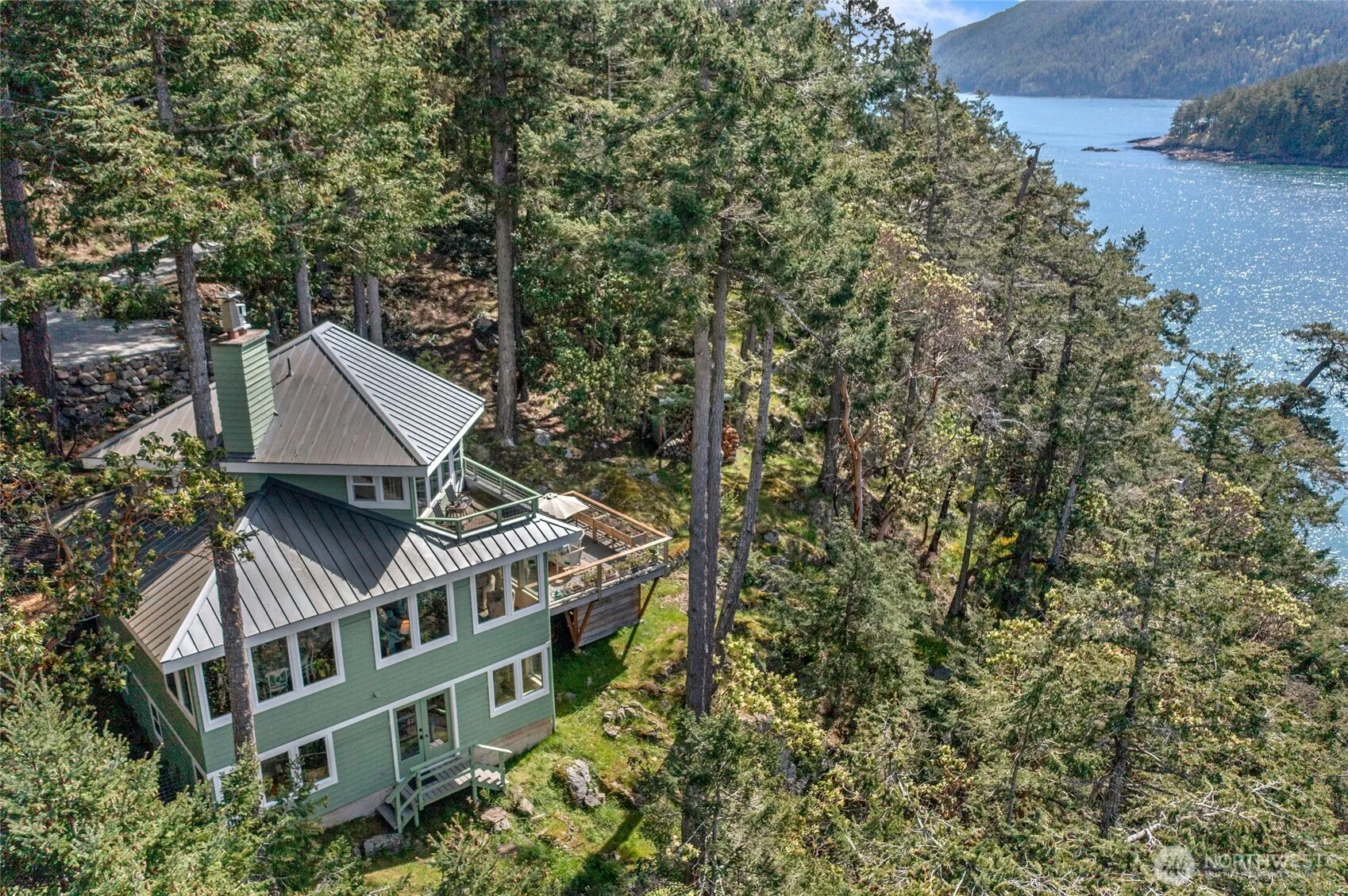 Experience serene waterfront living at this 1.93-acre Deer Point residence. This 2,168 sq ft home offers sweeping southwest marine and mountain views from nearly every room. Enjoy 194 ft of private shoreline, a shared dock, a registered mooring buoy, and access to a private community beach. Thoughtfully updated, the 2-bedroom, 3.5-bath home features a private studio above the detached garage, sun-drenched decks, wood floors, a metal roof, and a beautifully renovated kitchen and baths. Surrounded by madrona and fir trees with terraced herb and flower gardens, this property encapsulates the essence of island living, situated conveniently close to Olga, post office, art studios, Doe Bay Resort and Moran State Park.