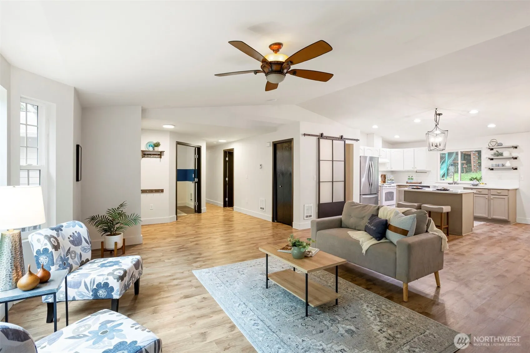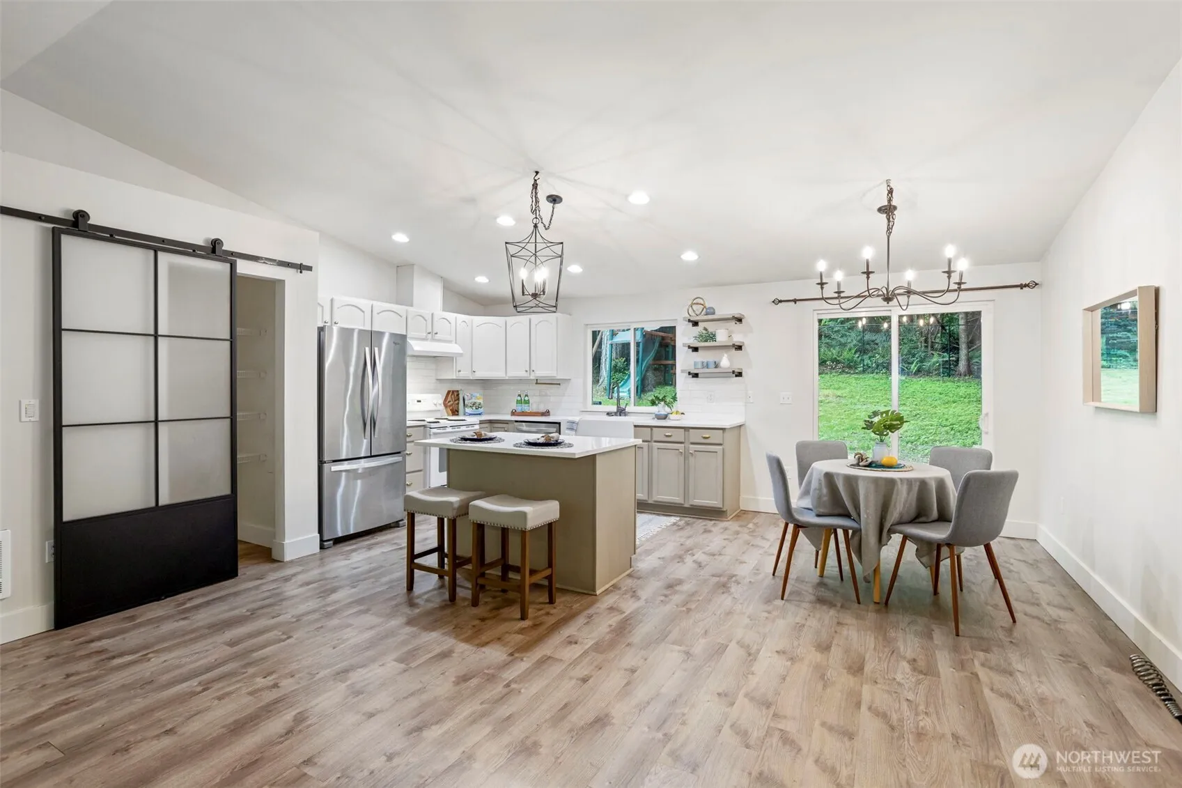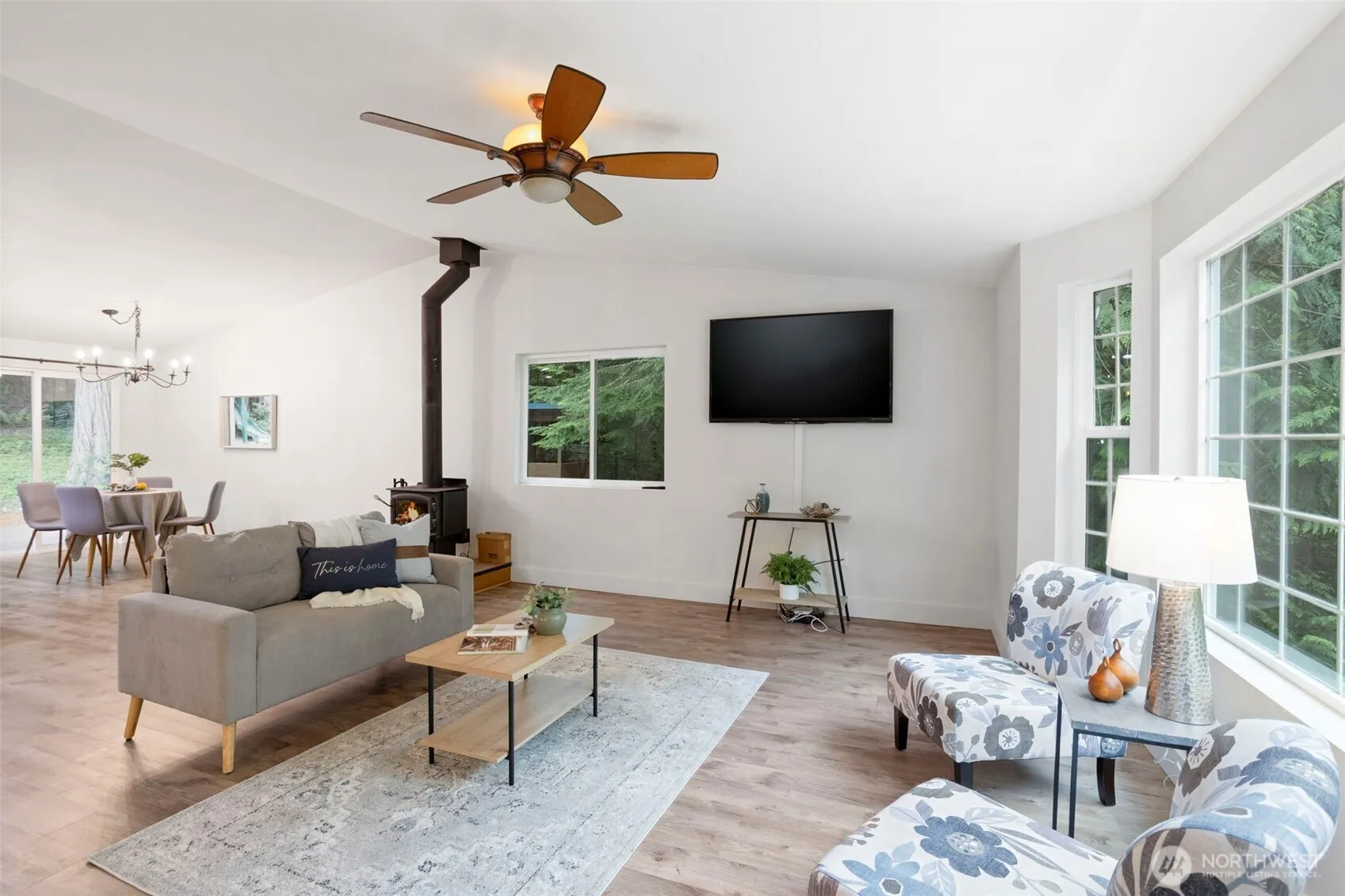 Experience peaceful living in this 3-bedroom rambler in Seabeck. Light and spacious floor plan with vaulted ceilings, low maintenance vinyl plank flooring throughout and open concept living area with woodstove. Beautifully updated kitchen with farmhouse sink, island and dining area with a slider leading to the back deck. Spacious primary bedroom with an updated 5-piece bathroom and huge walk-in closet. Plus 2 additional bedrooms, large office and full bathroom. Fully fenced backyard backs up to Community greenbelt for added privacy. Attached 2-car garage has shop area with extra storage. Perfect location within minutes from Scenic Beach St Park, Seabeck Marina, local dining & shopping, and close to Silverdale & Schools.
