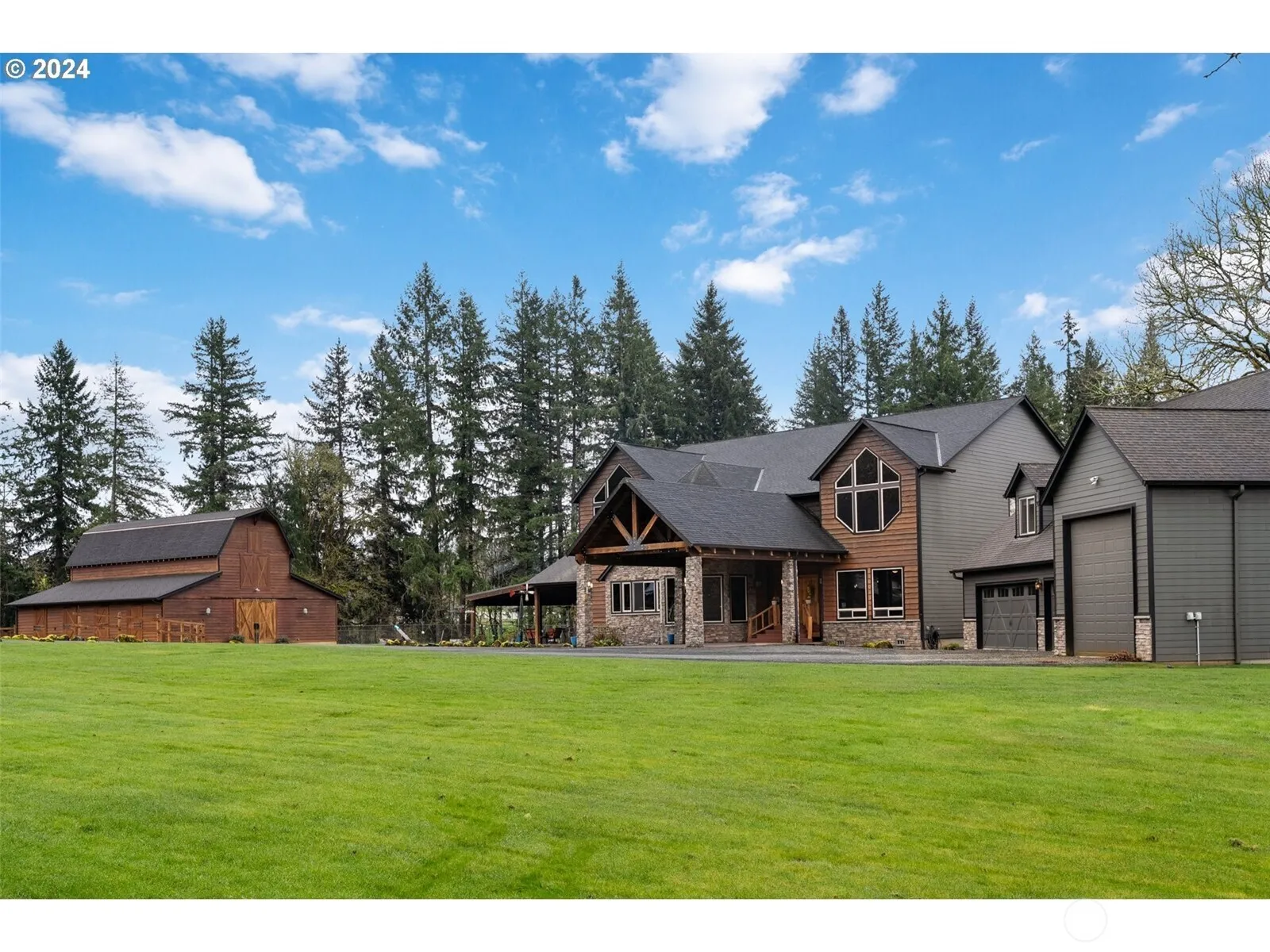Owner Financing Available-Custom PNW living on rare 10-acre gated estate! 4bed/3bath main home sprawls 7562 sqft w/primary suite on main, 3 bonus rms, and a 20-seat home theater. Stunning timber frame entrance, hardwood floors, vaulted ceilings, and intricate stonework. Chef’s kitchen features custom cabinetry, SS appliances, and marble countertops. Entertain outdoors with hot tub amidst expansive covered spaces. Outbuildings include a 2688 sqft 6-stall horse barn, 2144 sqft 6-car garage w/1005 sqft furnished apartment, RV amenities, and a separate entrance to a 4800 sqft heated AG blding. Fenced, usable acreage w/seasonal creek and R5 zoning for future division. 8 mins from Battle Ground, with access to I-5, PDX, and Lewis River rec area.