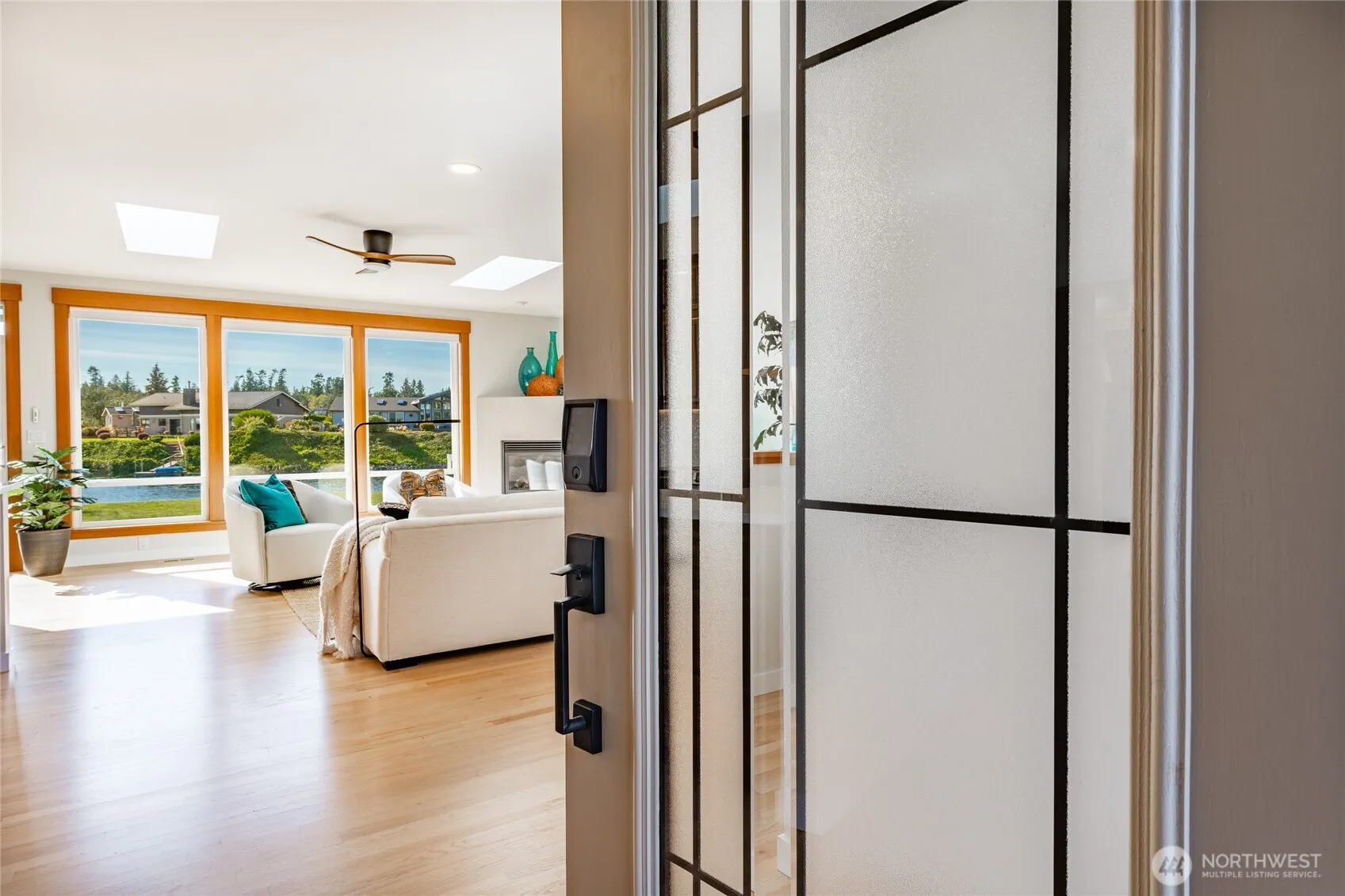 Elegant Lakefront Living! Situated on Thunderbird Lake, a seamless blend of modern upgrades & timeless style. Complete renovation offers luxurious experience where every detail has been curated. Refinished pale oak hardwood, kitchen: quartz counters, stainless, touchless faucet. Expansive lake views w/wall of windows-remote control cell shades & exterior solar shades, LED throughout + 9 skylights. Gas fireplace w/Italian porcelain. Primary ensuite: walk-through closet, radiant heat tile, walk-in shower, floating vanities & towel warmer. Flex space in the sunroom. Outdoor entertaining on the large deck. Garage w/Clopay Modern Steel doors/epoxied floors. Lifestyle community=golf, pickleball/tennis, marina, pool, beaches & live security gate.