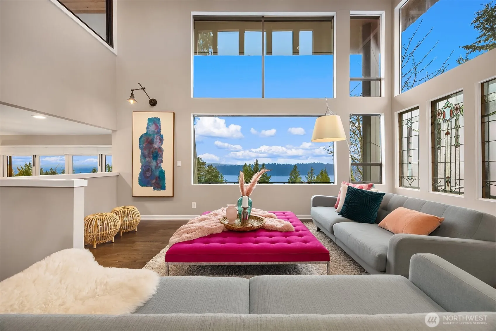 Stunning light-filled custom home with the best lake, city, and mountain views on the island—enjoy it all from an expansive entertainer’s dream deck! Set well back from the street, this home is peaceful & private. Inside, a chef’s kitchen wows with a Wolf range & oven, two dishwashers, full size fridge & freezer, and seamless flow to indoor-outdoor dining through bifold glass doors. Vaulted ceilings and original stained glass add timeless charm. Dreamy primary suite offers panoramic views, even from the spa-like bath. Three beds, 2 updated baths, laundry room on one floor. LL guest room, full bath, gym, and rec room. Extra boat/parking near garage. A hot tub on the private deck & flat yard for play complete your perfect, pre-inspected home!