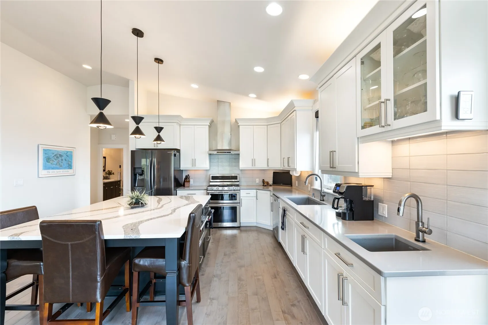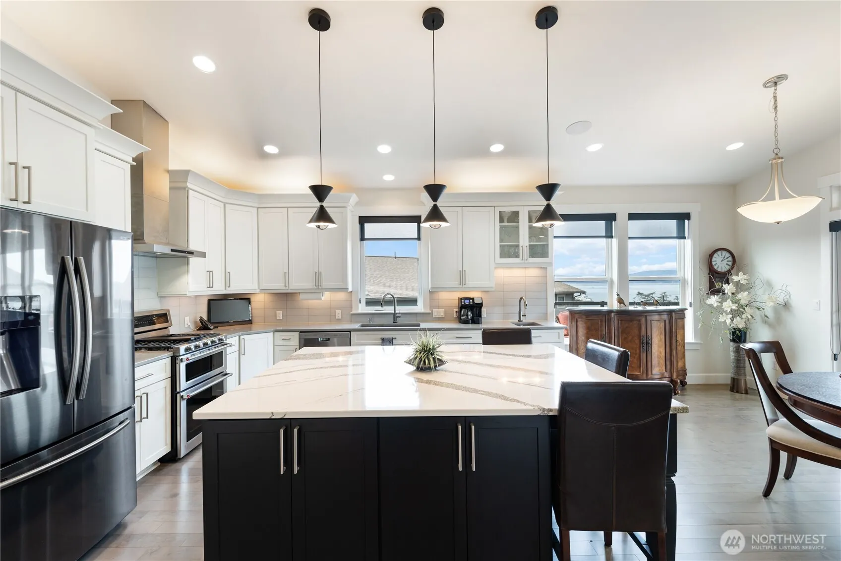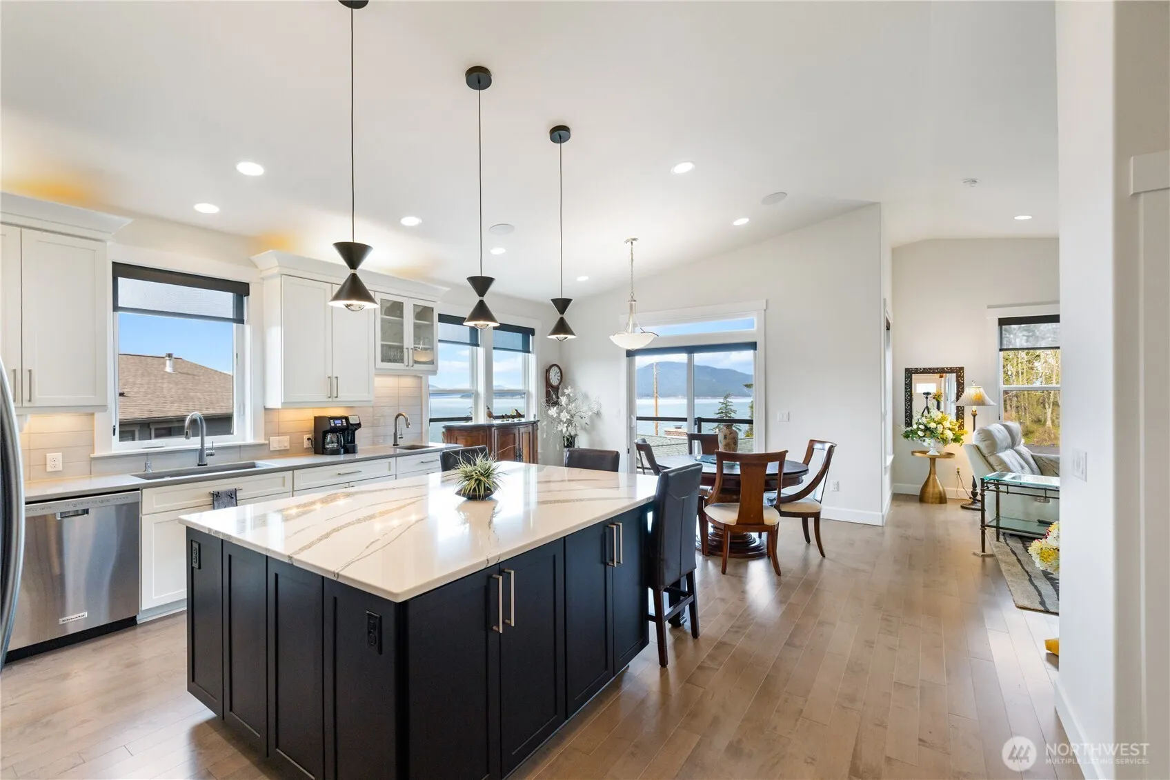 Indulge in luxurious coastal living with this stunning home overlooking the Guemes Channel. Soak in sweeping water views and watch ferries & boats pass by. Inside, hardwood floors flow through the main level, a chef-inspired kitchen—features shaker cabinets & a generous center island. The main floor also includes a private den/office & peaceful primary suite with a spa-like bath. Downstairs offers flexible living space with a cozy family room, two additional bedrooms, and a full bath—ideal for guests. Step outside to a beautifully landscaped, fully fenced yard with a spacious paved patio, built-in firepit, raised garden beds, illuminated walkways, and plenty of space to relax or entertain. This is Northwest living at its finest.