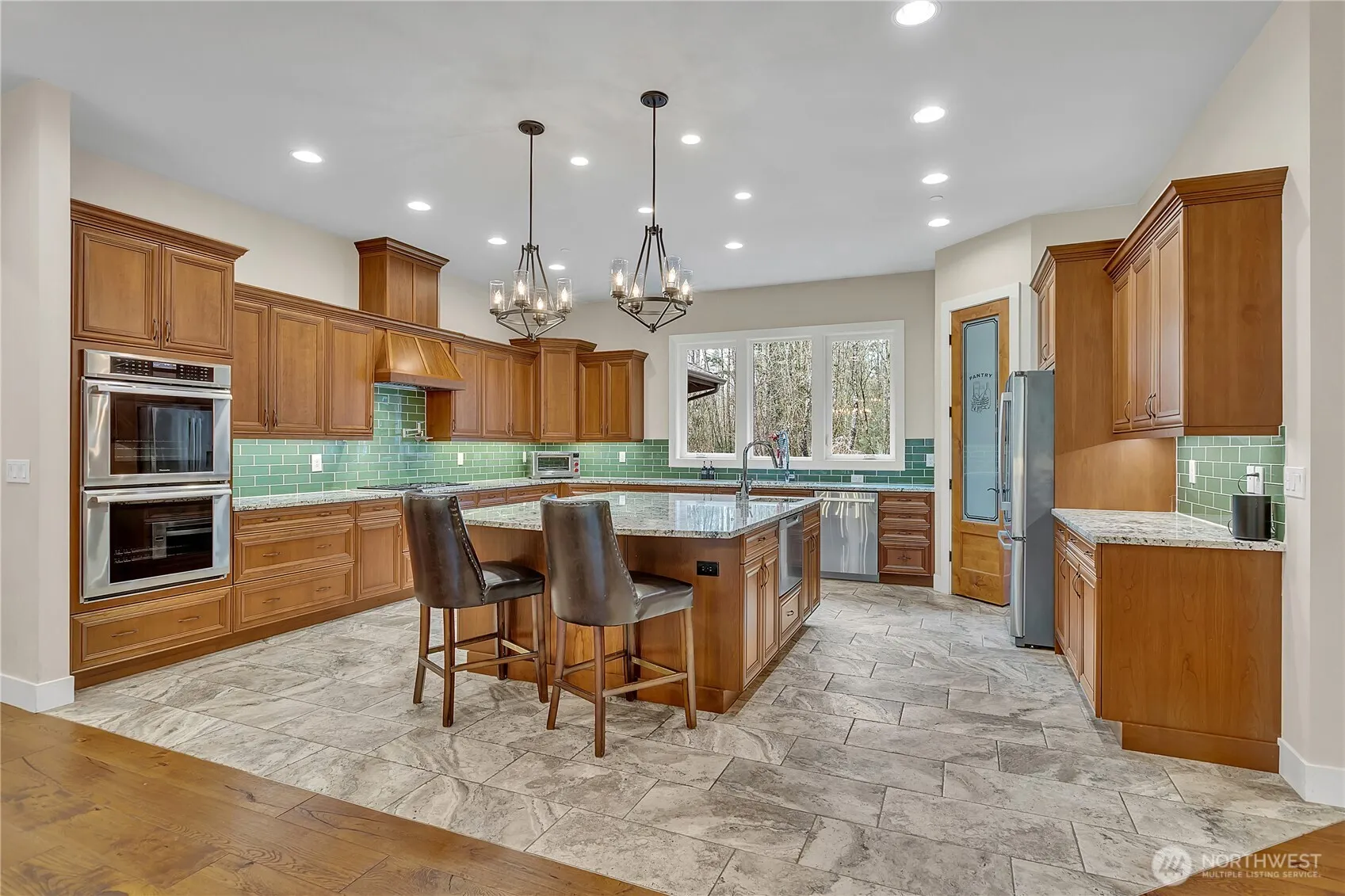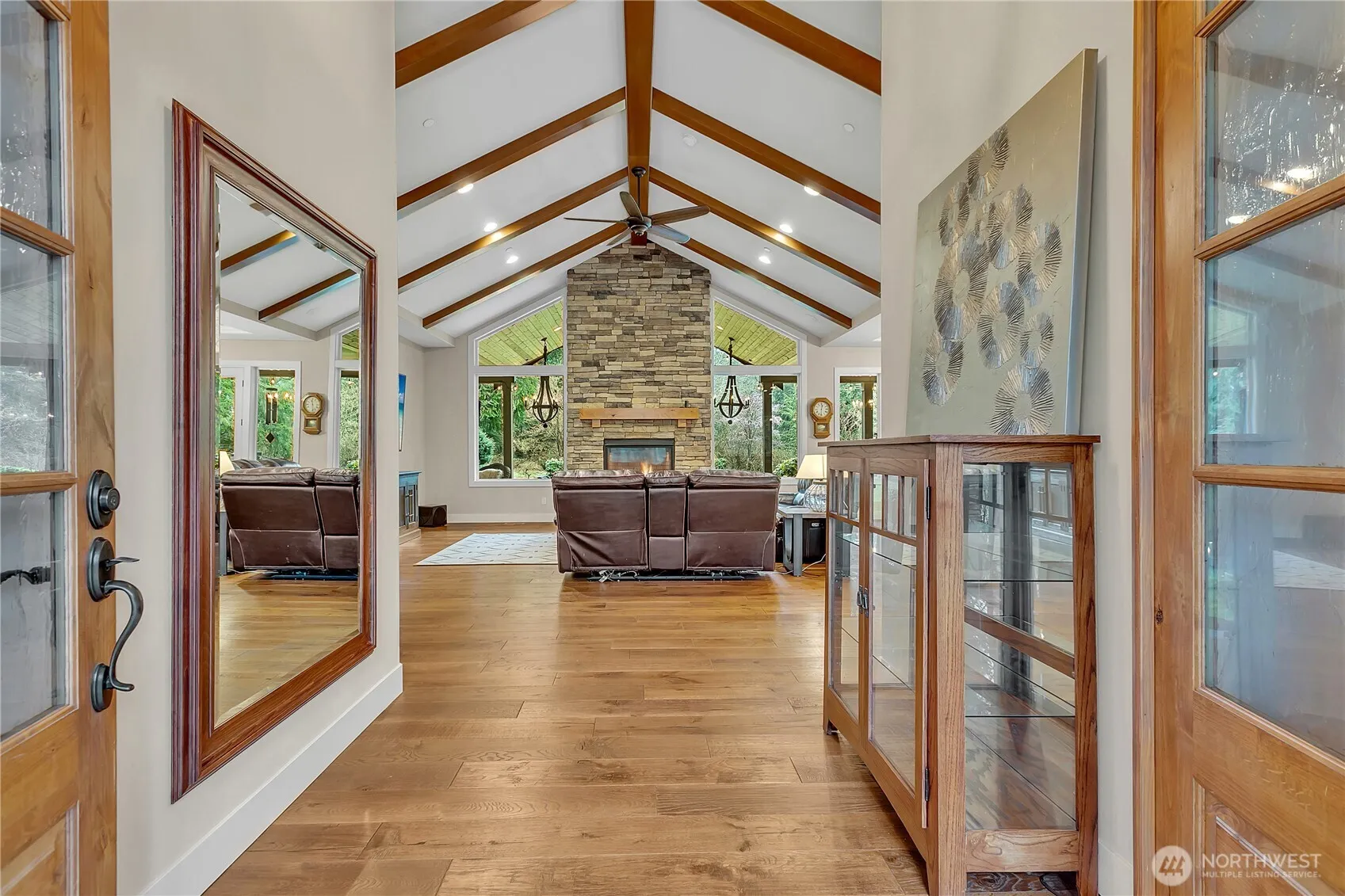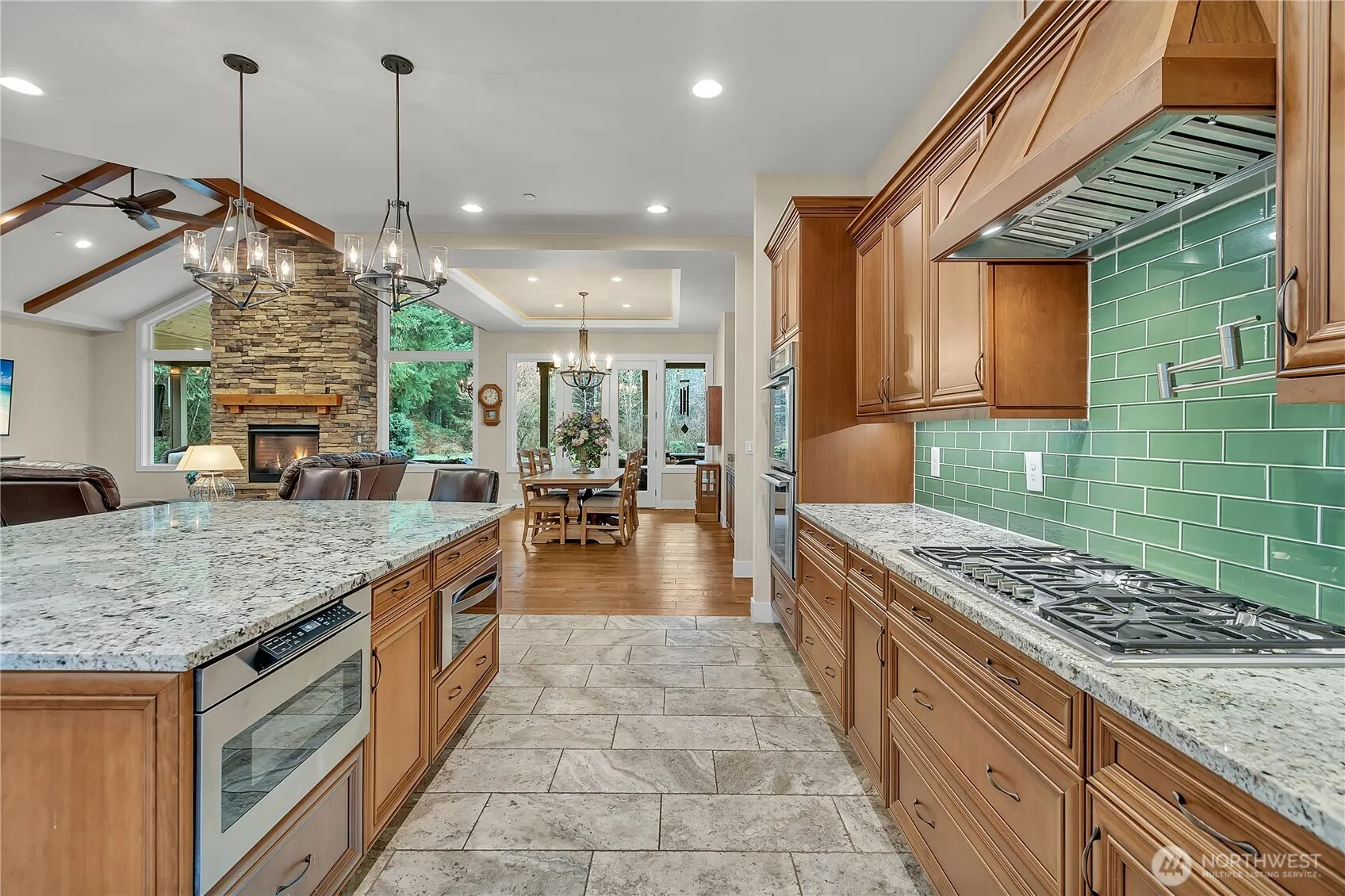 Beautiful custom rambler has it all. Great indoor and outdoor living spaces, privacy and large level 6+ acre corner lot. Enjoy this tastefully designed home, beautiful hardwood floors throughout, light and bright kitchen with SS appliances and slab countertops, large island with prep sink, dishwasher and storage, warm and inviting living room w/oversized windows and gas fireplace. Perfect dining room with french doors to oversized covered patio, wood burning fireplace, outdoor kitchen, hot tub and TV perfect for year round entertaining! 3 generously sized bedrooms, primary with walk in closet, fireplace and private patio/hot tub access, two additional bedrooms on opposite side with shared bath, plus 3/4 bath, huge laundry room with pet spa!