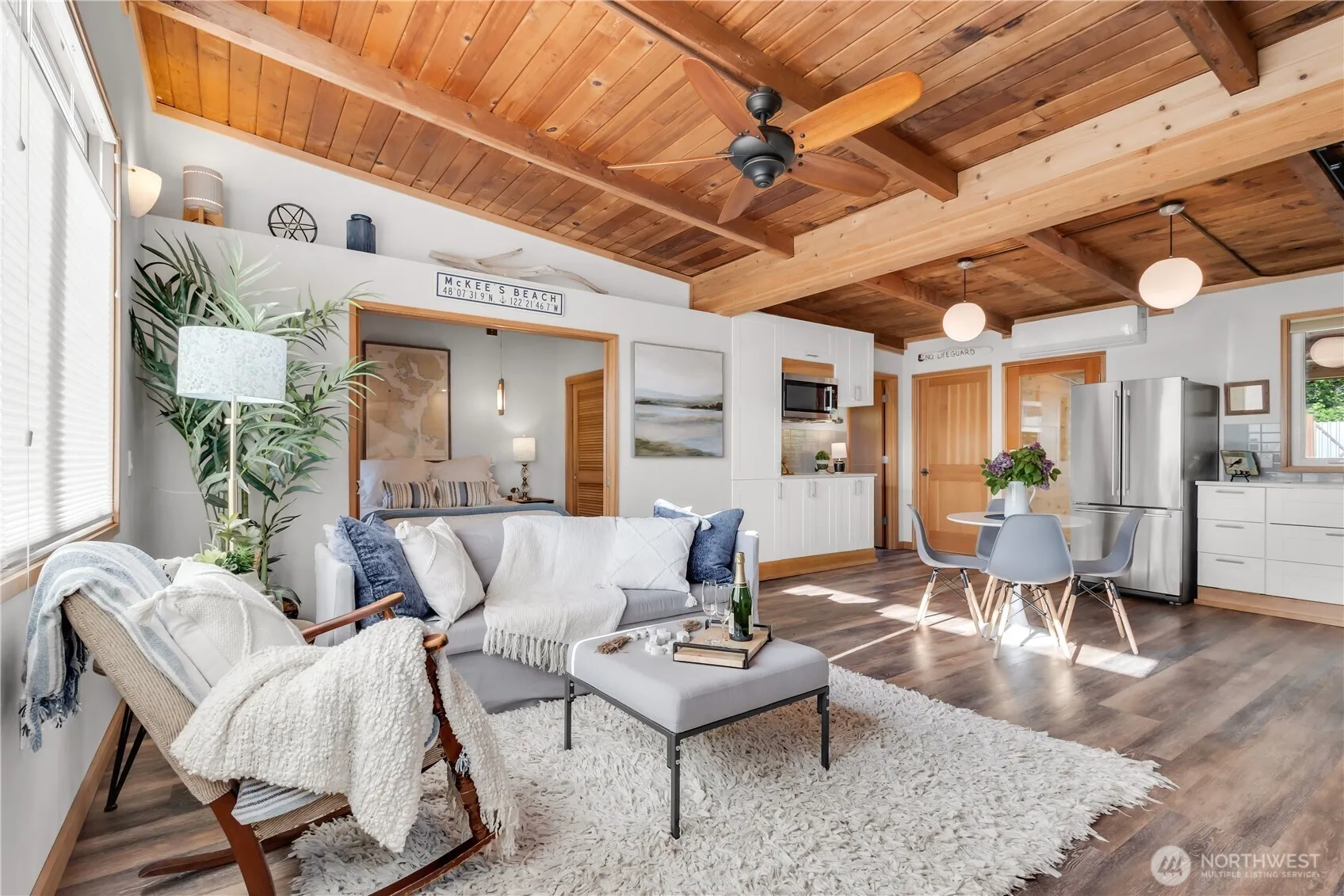 STR’s allowed! Park your boat! McKee’s Beach Cottage – Fully Remodeled, Furnished & Move-In Ready! This charming 2 bed year-round cottage is just a few doors down from one of the 5 beach access points which includes 2 boat launches. Thoughtfully re-imagined inside & out in 2018 w/new roof, siding, plumbing, electrical, kitchen, bath, full-size laundry, etc. Vaulted original fir ceilings, open floor plan, waterproof laminate wood plank floors, casement-style windows, ductless heat/AC & tankless hot water. Covered patio & deck w/outdoor sink & BBQ. Fenced grass yard, storage shed & parking for 5 cars, RV, and/or boat. From the private beach, enjoy watching eagles, seals, orcas & crabbing on Port Susan. Your year round coastal escape awaits!