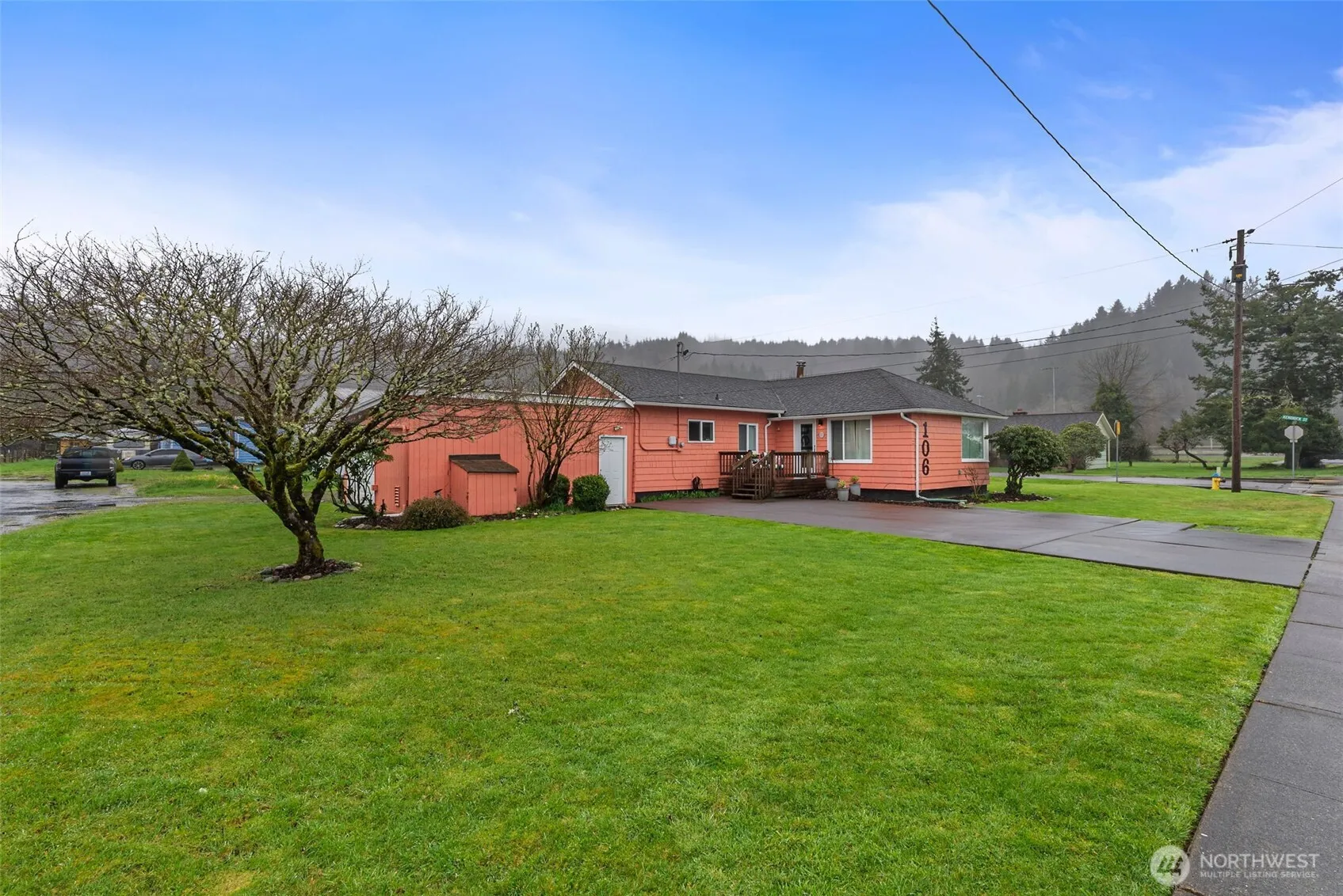 This charming home sits on a generous corner lot, with stylish accents and modern fixtures throughout. The spacious living and dining area offer a great flow for entertaining, making gatherings effortless. The kitchen features butcher block countertops, open shelving, and a convenient bar top seating area. The main bedroom stands out with a beautiful shiplap wall, moody tones, and direct access to the bathroom with a large shower. The utility room adds extra space for storage or as a mudroom, leading to the covered back patio. The driveway offers ample parking, plus there’s an attached garage and a large shed for additional storage.