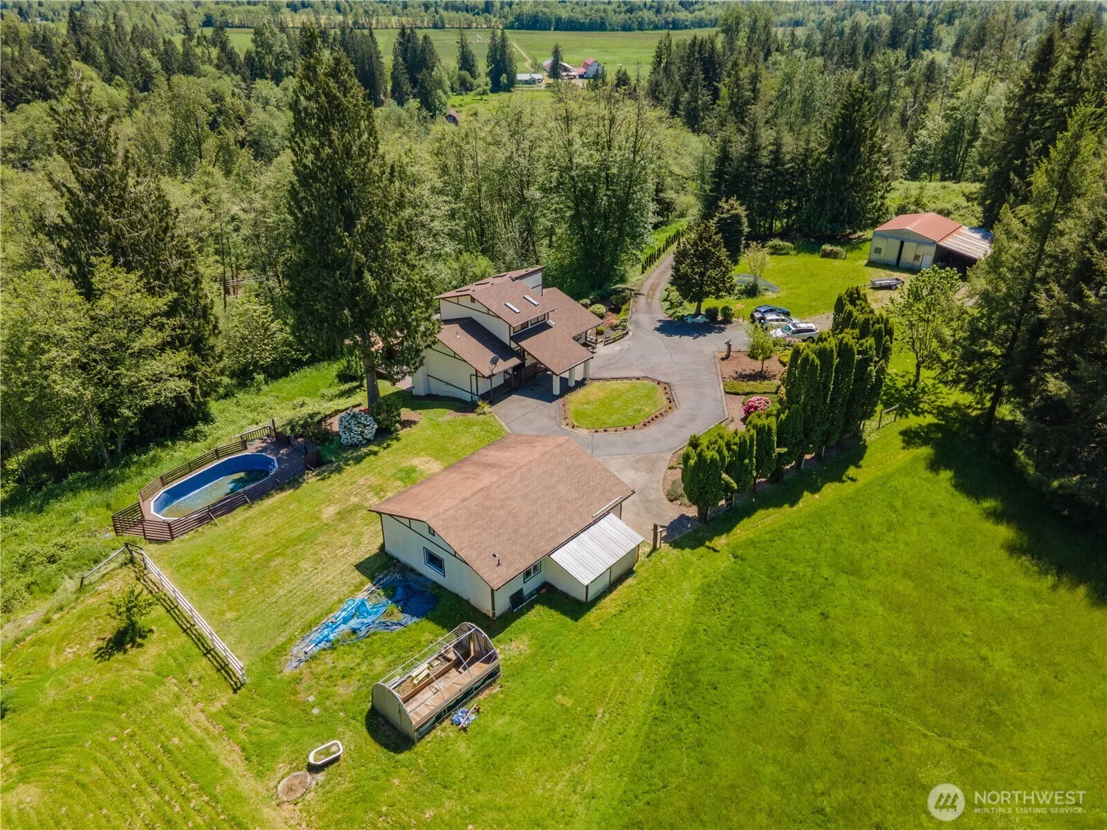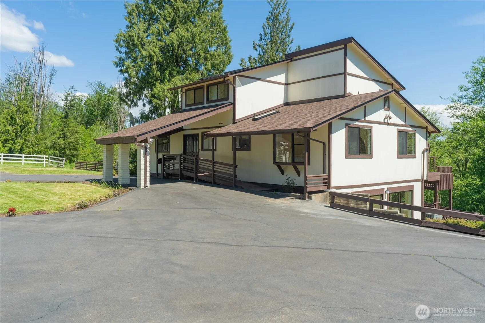 Back on Market – Buyer’s contingent house sale fell through. This house was fully remodeled 3 yrs ago & sits on 6 park-like acres! Paved drive leads to this amazing home up on a hill. 2 new bathtubs, newer interior paint, carpet, luxury laminate, light fixtures & well pump. The upper floor is a hugh primary ste. Main floor has Lg open skylighted kitchen w/eating area & SS appliances, bright dining rm, hugh living area & family rm w/fireplace. Day basement boasts lg game rm w/pool table, wet bar & bonus rm. Carport w/ramp, detached 2 car garage w/storage, studio or office w/ 3/4 bath. Recently painted renovated 3 level deck system w/BBQ area. Property has an above ground pool w/deck, barn w/3 stalls & Mature landscaping w/fruit trees.