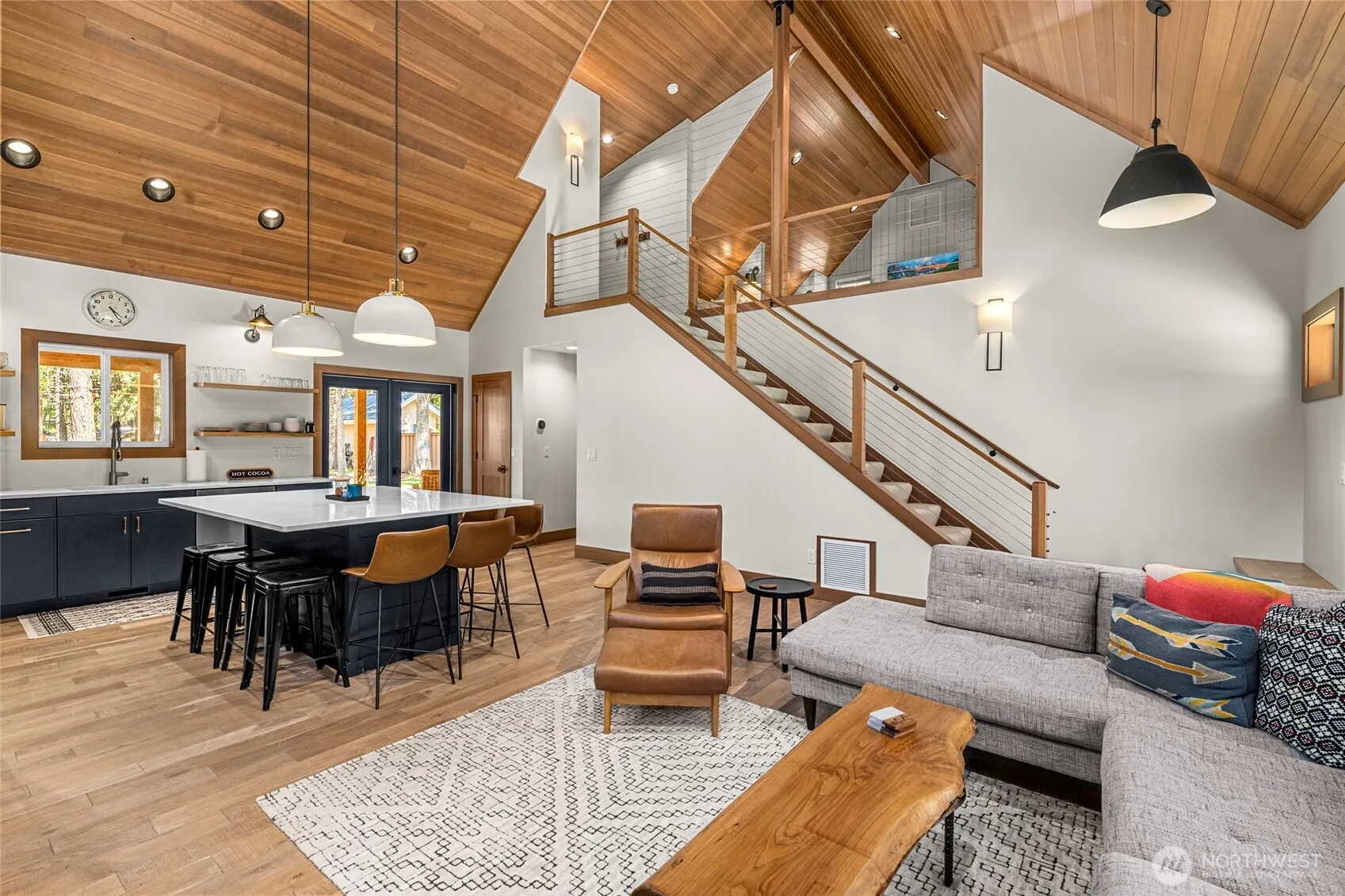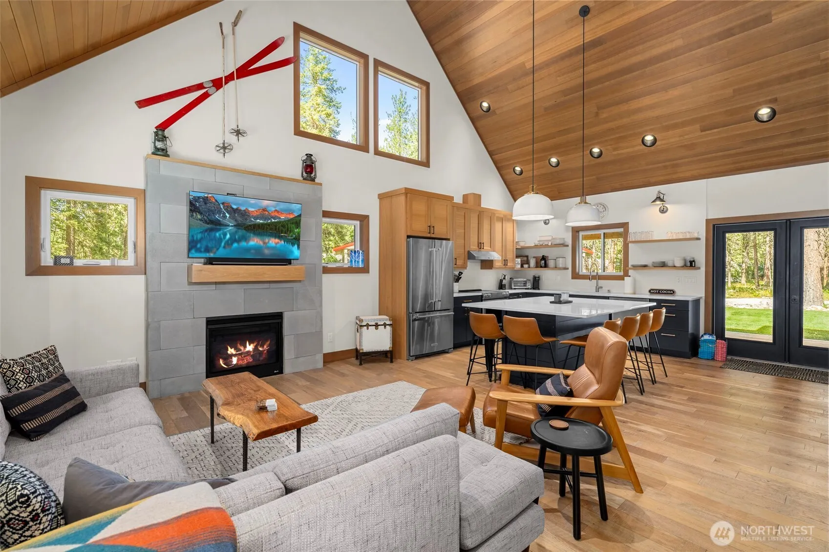 Impeccably designed and built in 2021, this stunning home in the Ponderosa community blends craftsmanship with comfort in a serene mountain setting. Interior features include reclaimed white oak flooring, vertical grain white oak cabinetry, and a custom-built island ideal for both meal prep and dining. Quartz countertops run throughout the home, paired with beautifully tiled showers and tub surrounds, warm hemlock ceilings, trim, and doors, and marmoleum flooring in all three bathrooms. The open loft offers charming built-in shiplap bunkbeds, and designer light fixtures elevate every room. No expense was spared in building this home. Just a short walk to the community swimming pool, Wenatchee River beach, pickleball and sports courts.
