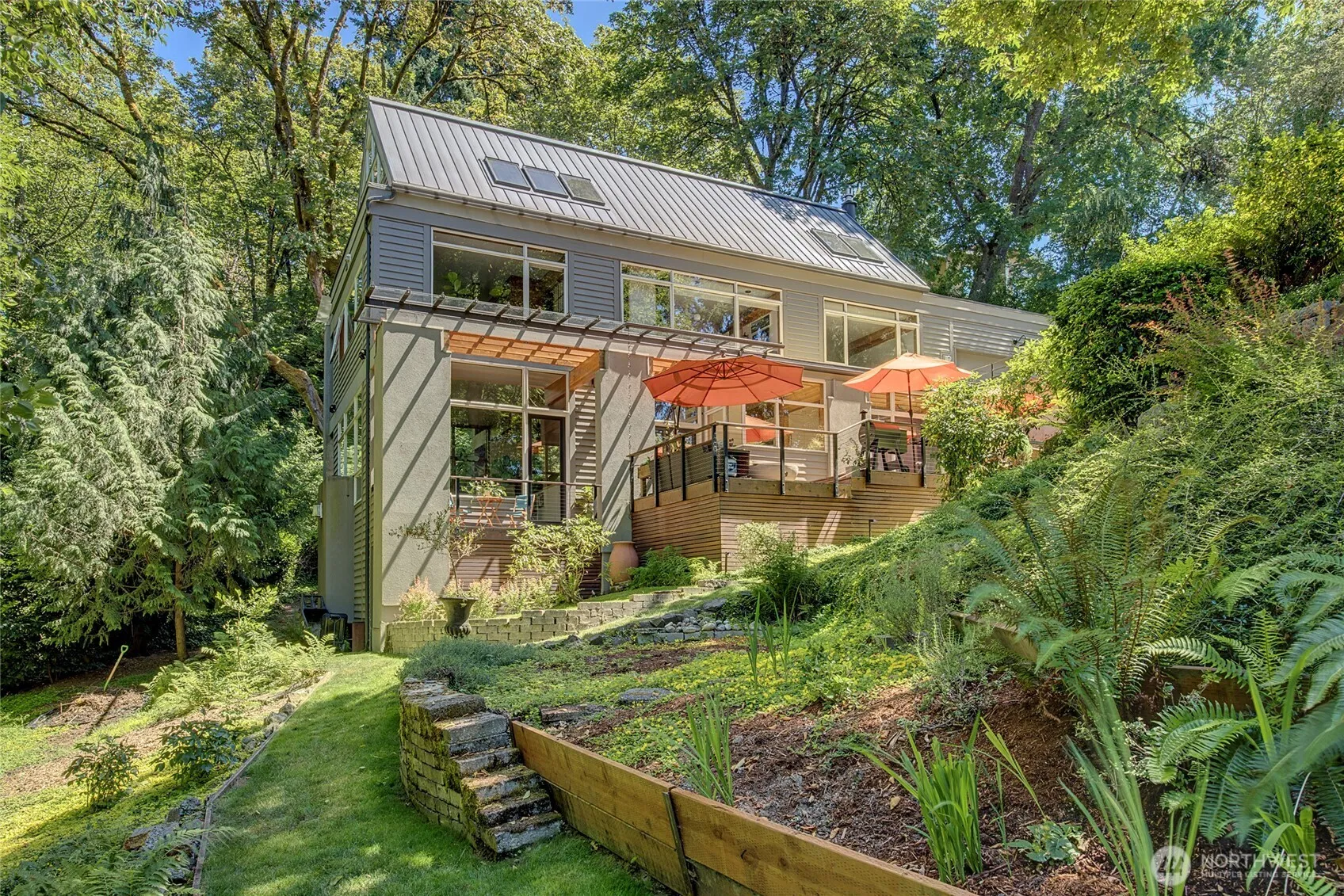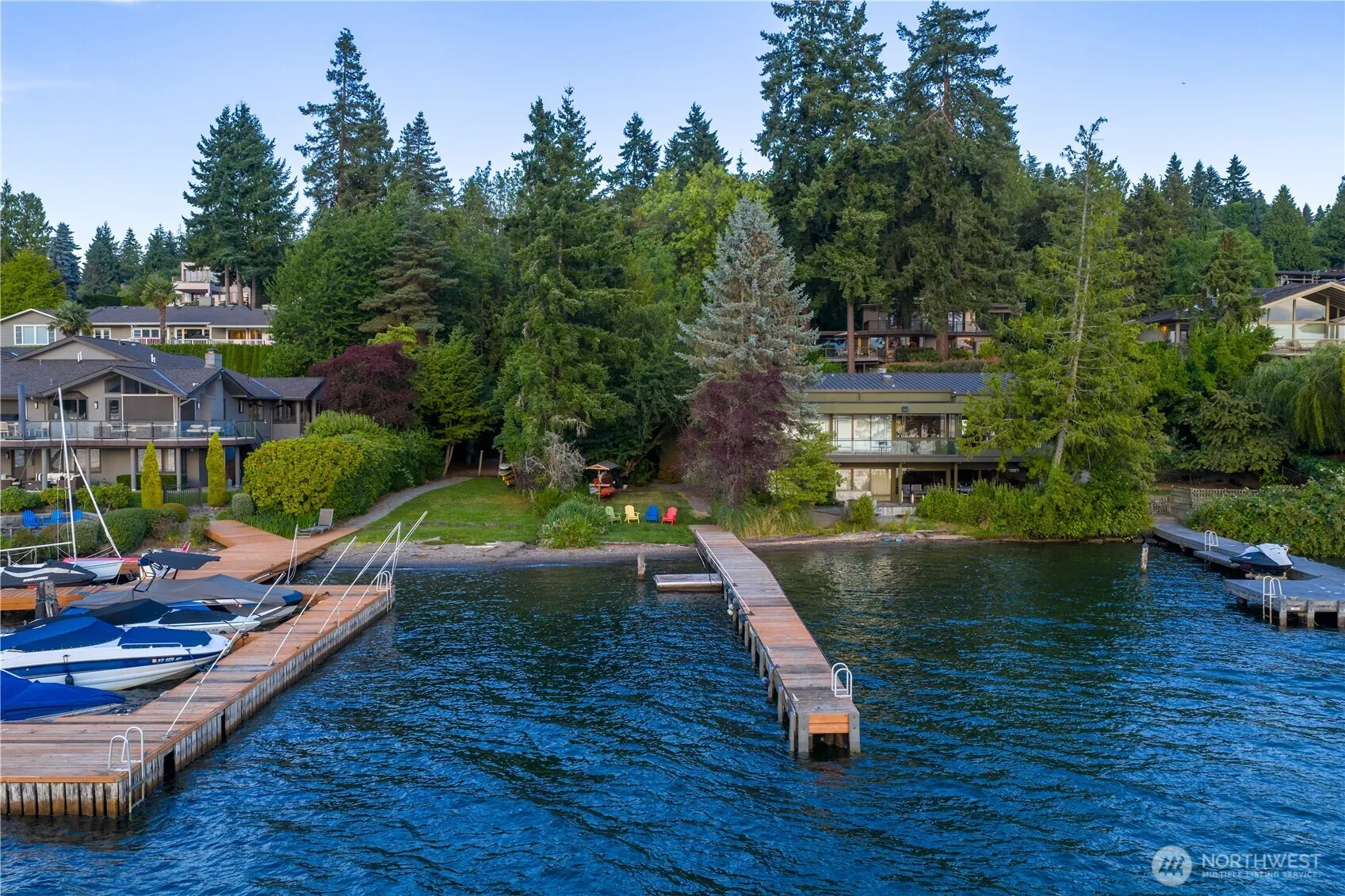 New exciting price for the classic Pacific NW home w/34 feet of no-bank waterfront shared with just 1 neighbor plus 100 foot dock. This custom-designed Jim Cutler masterpiece is an architectural gem by the renowned mind behind Bill Gates’ home. Classic & timeless, the residence features VG fir-trimmed walls of windows that dissolve the boundary between indoors & out. So much privacy, no need for blinds. Sophisticated entertaining space combined w/cozy family areas. Dream all weather deck. Short path leads to the water. Hop on the boat, paddle board or just soak up the sun with western exposure. Tucked away in tranquil privacy yet moments to the S’End shopping center, Beach Club, & schools. NOT cookie cutter! This is quiet luxury with soul.