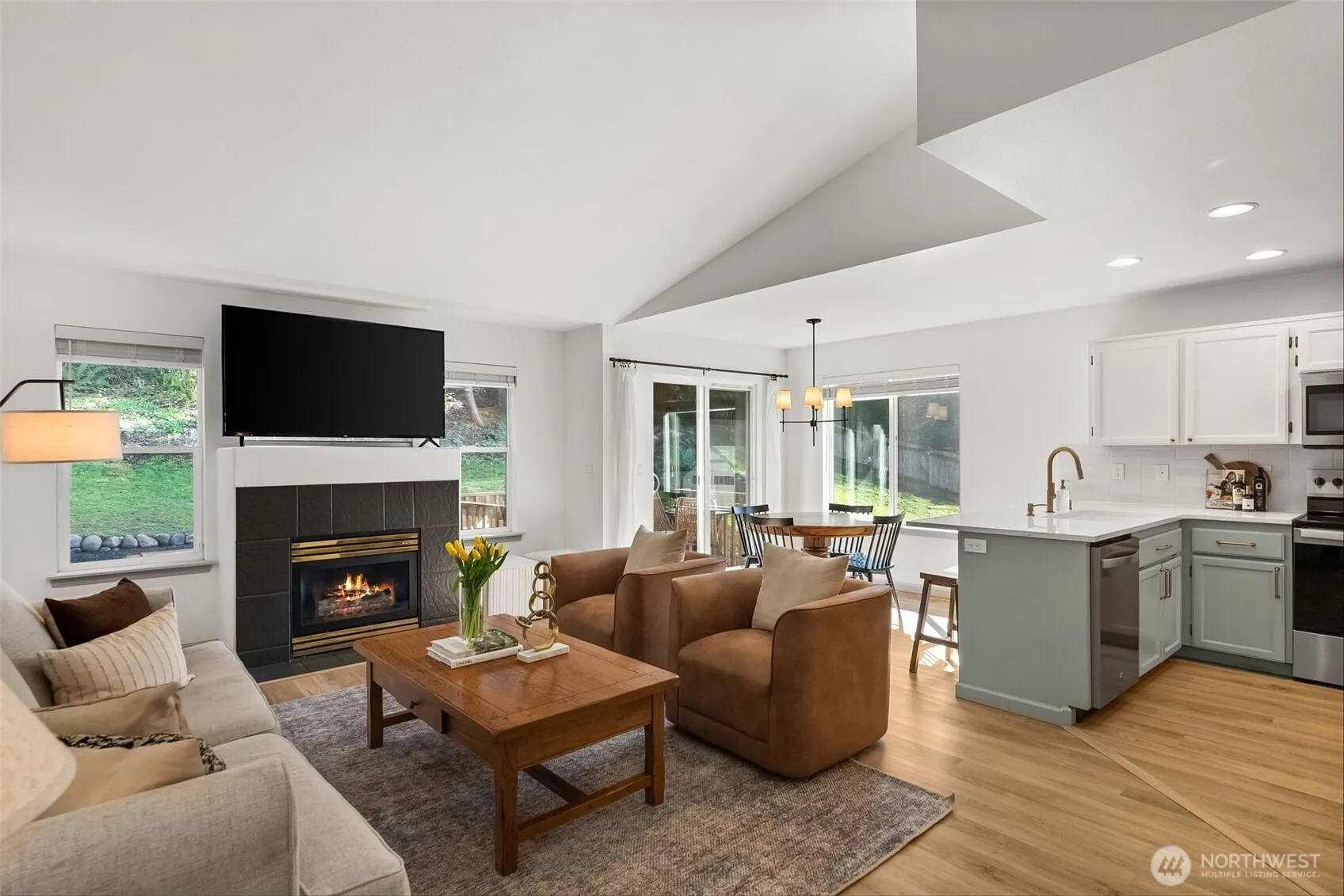 This beautifully remodeled home sits on a private, corner, fully fenced, 3/4 acre lot that backs up to a greenbelt. Situated in a country setting but close to all amenities. Open concept, one level living with views of nature from every room. Remodeled kitchen with new appliances & quartz countertops looks out to the dining room & steps out to deck and yard. Primary with en suite bath plus 2 more bedrooms and a full guest bath. Oversized garage with HUGE storage area and epoxy garage floors. Backyard features a large patio with plenty of space for RV/Boat parking, gardening, and much more! Located just minutes from East Gate Entrance of JBLM, close to shopping & restaurants in either Yelm or Spanaway. Home comes with 1 year home warranty.