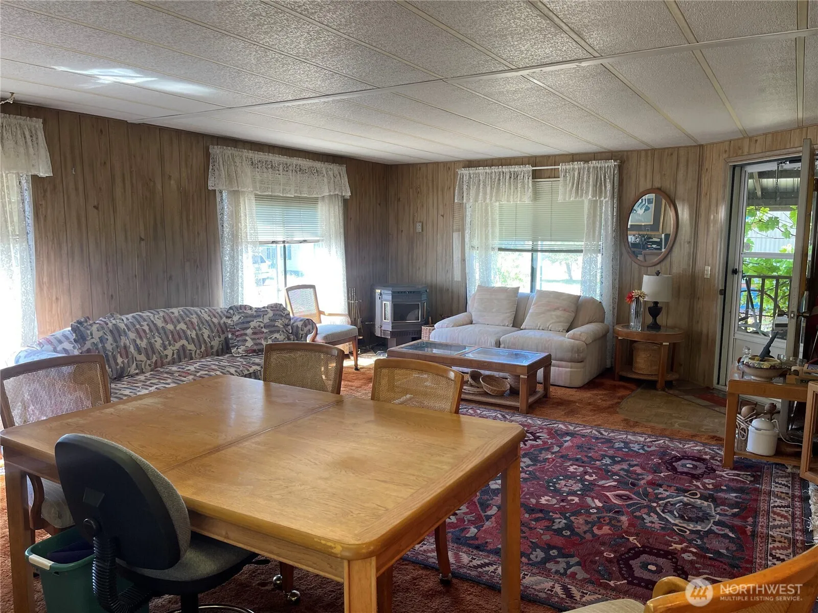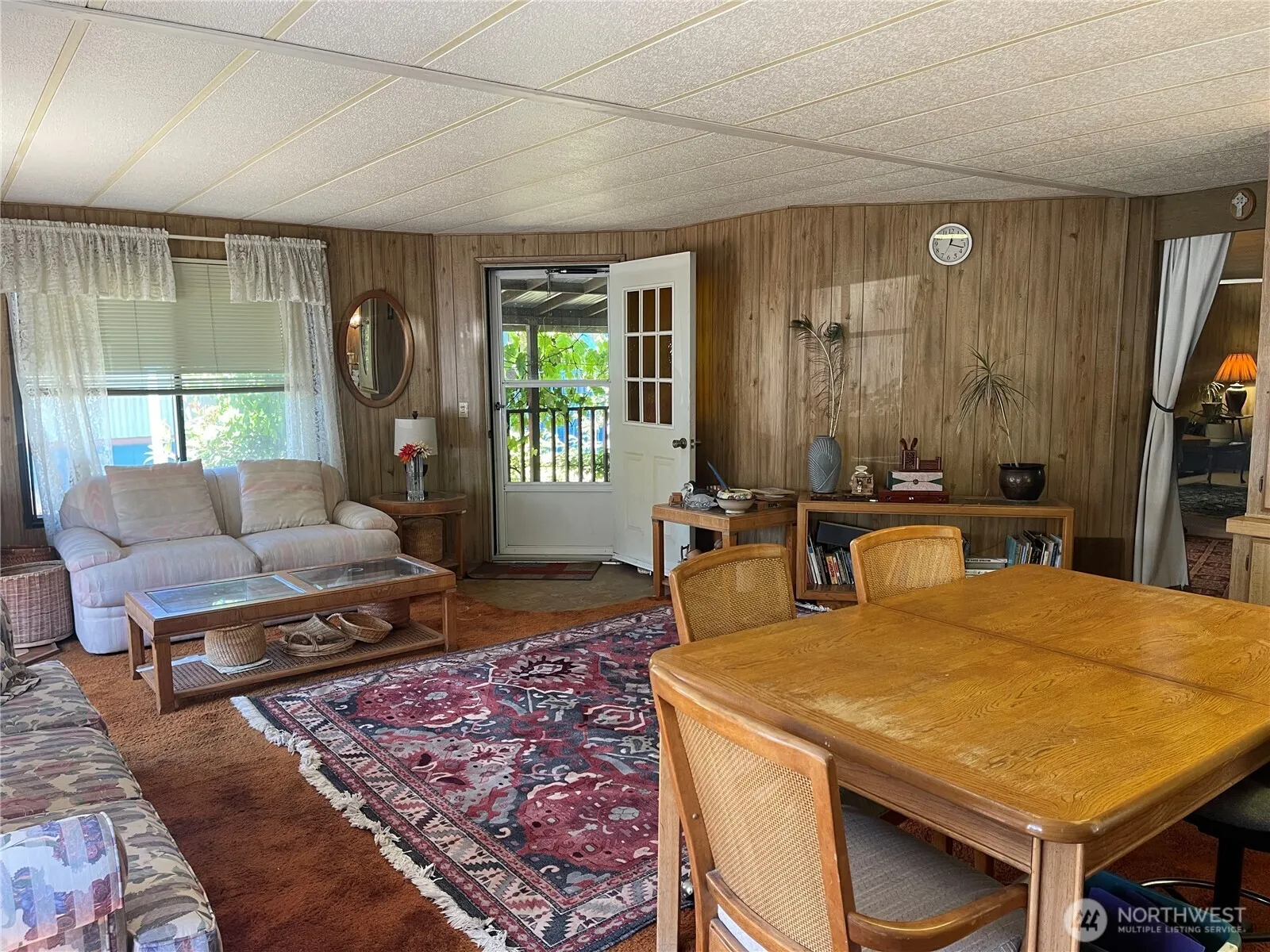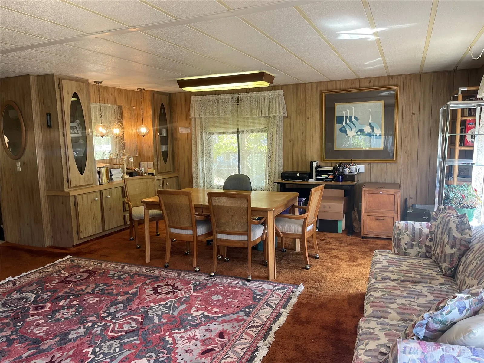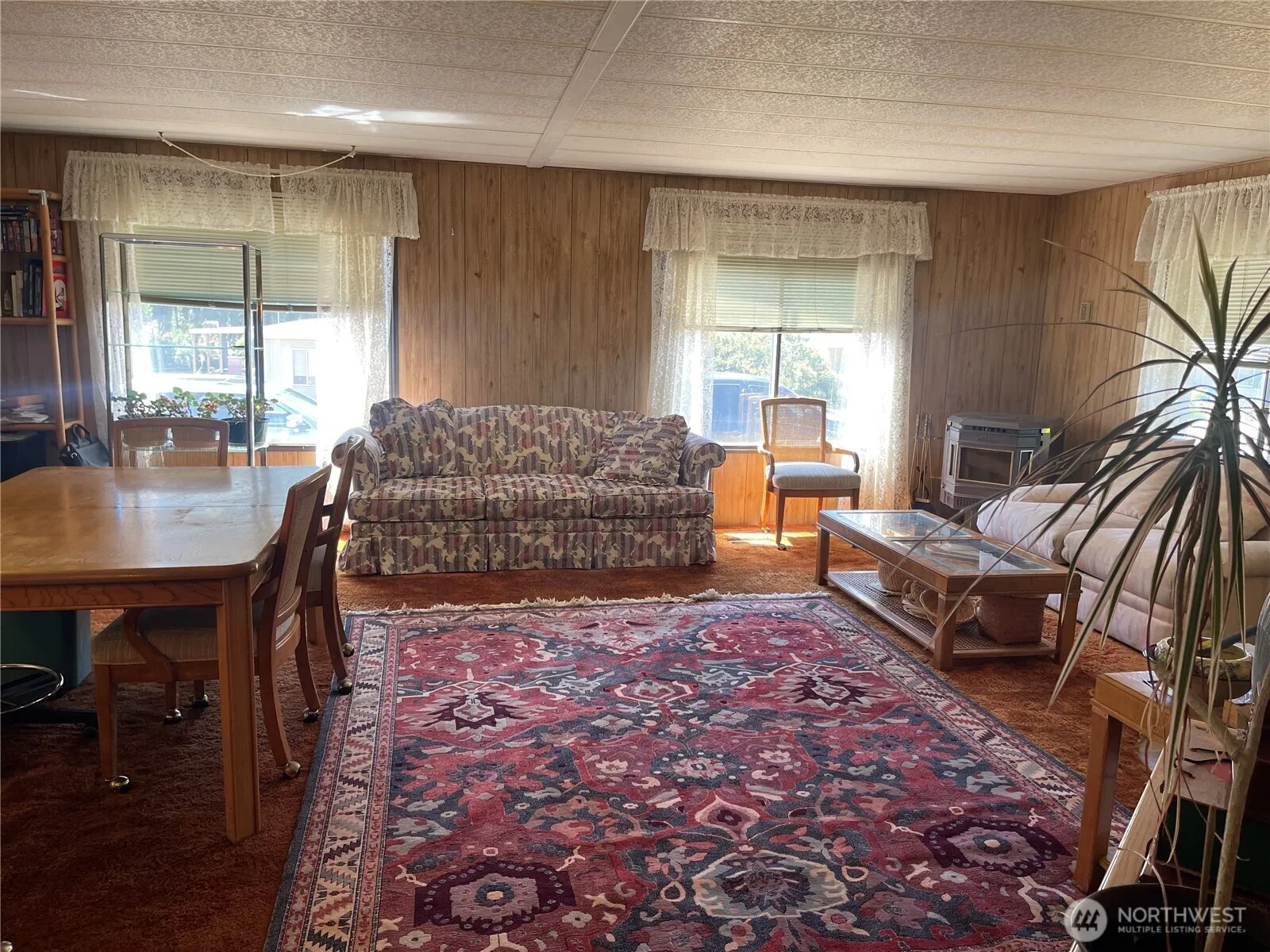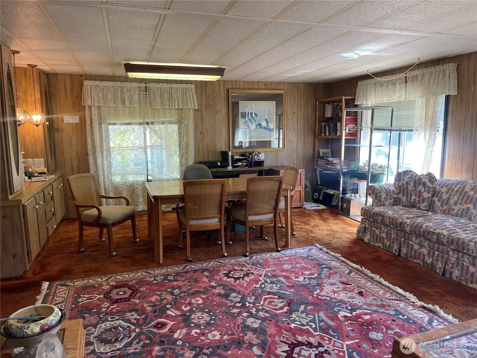 Affordable, spacious home with full size living room and great room off the kitchen with peninsula. Good light throughout. Formal dining and an office off the side entry with the carport. It is warm and inviting and in very good condition inside. New/newer metal shed and another one behind. HUGE greenhouse in the back of the property and tons of plantings just needing loving care. Wait until you see the grape arbor! Lush juicy grapes coming your way. Park rent is $790 and 2 indoor pets allowed.