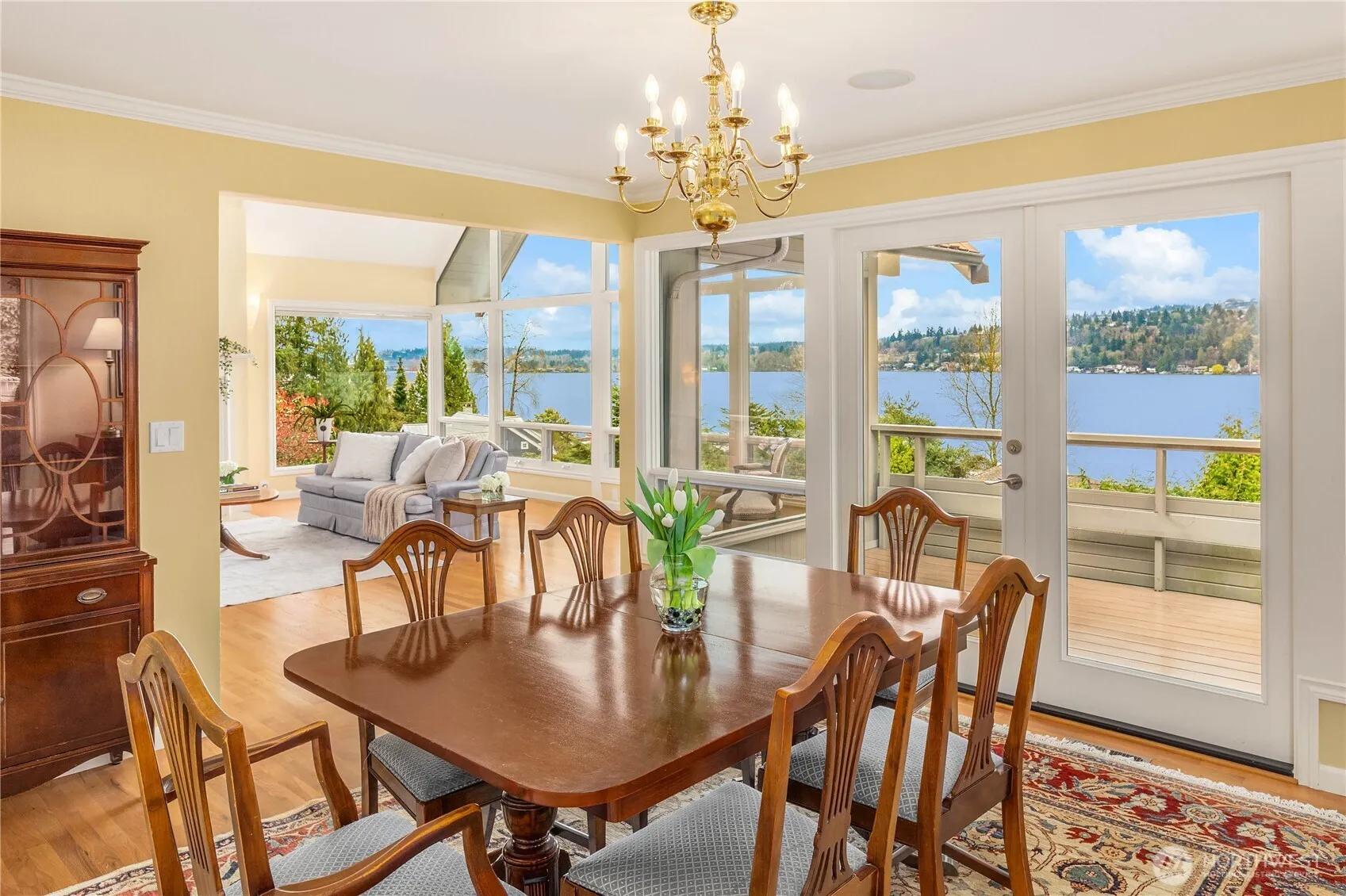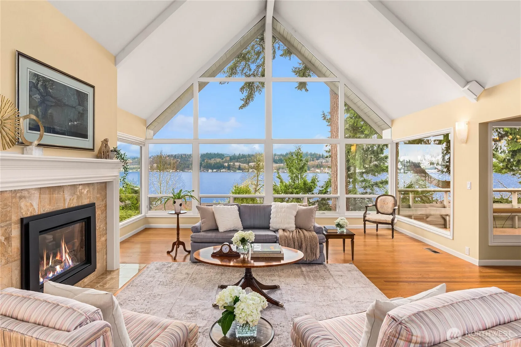 Experience sweeping lake views from the Cascade Mtns to Mt. Rainier in this beautifully updated NW Contemporary home. Vaulted ceilings, open spaces & window walls invite natural light framing the ever-changing landscape. Designed for seamless indoor-outdoor living, enjoy ±50′ of shared waterfront w/moorage, boat lift & picnic area. Private backyard staircase offers direct access to the waterfront. Thoughtfully renovated for one-level living, main floor features primary suite, living & dining rms, remodeled kitchen, utility & expansive ±500 sq’ view deck. Lower level offers two additional bedrooms, ¾ bath, rec rm & sought after ±500 sq’ workshop (4th BR renovation?). Stunning sunrises & vibrant seasonal colors enrich this tranquil setting.