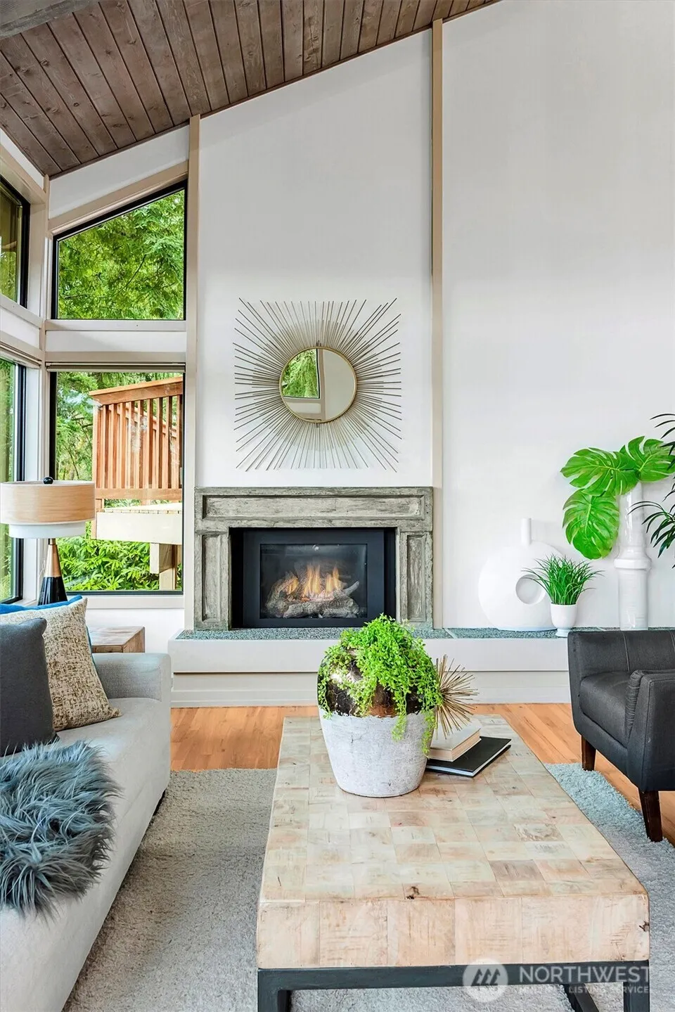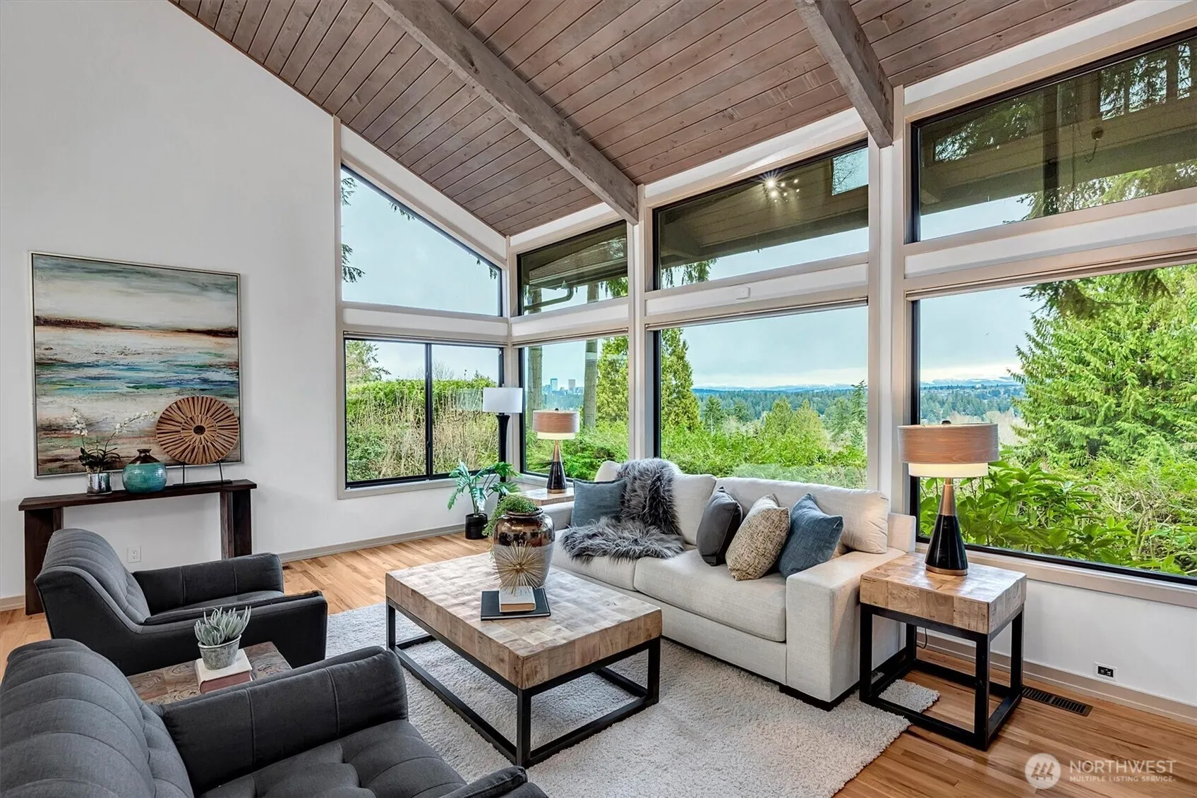 Now offered at an incredible $2,019,000! This exceptional home has spacious living w/abundant natural light & breathtaking Cascade Mtn. & City of Bellevue views. A showstopper living room—w/soaring vaulted wood-paneled ceilings, rich hardwood floors, a gas fireplace, dramatic windows. Ideal dining area for entertaining, w/easy kitchen access. Kitchen boasts granite countertops, ss appliances, & ample cabinetry, flowing seamlessly into family room w/a gas fireplace & access to the deck. Main floor primary suite w/stunning views & a private ensuite. 2nd bedroom & nearby powder room complete the main level. Downstairs, find three additional bedrooms—or office/den options—a large rec room w/fireplace, & lots of closet space for storage.