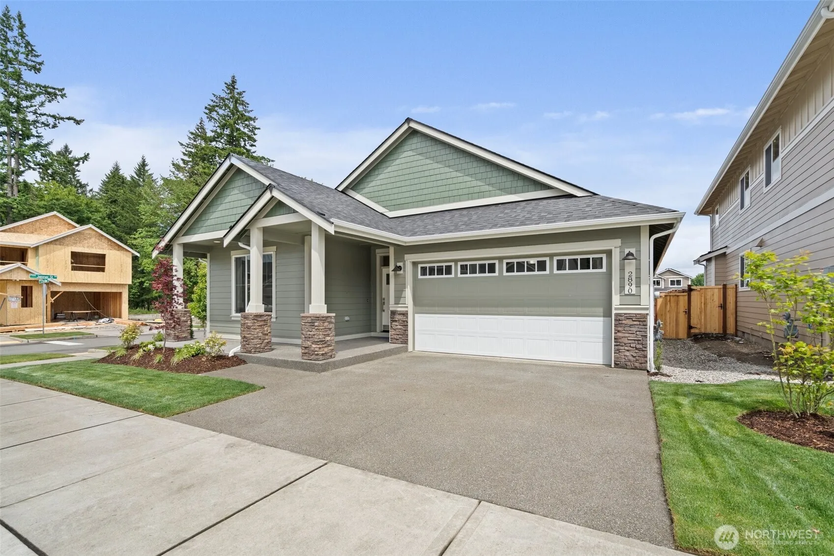 Discover Tumwater’s Skyview Estates by local builder Rob Rice Homes where elegance and convenience meet! Rare single-level 3-bed/2-bath plan spans 1944 sf. Kitchen boasts quartz counters with full tile back splash, Maple “Shadow” shaker cabinets, gas range, and opens to vaulted great room with fireplace. Entry, kitchen & dining feature engineered hardwood flooring, quartz counter tops throughout. Enjoy the outdoors on the covered patio, fully landscaped yard with privacy fencing! Energy-efficient features include solar panels, heat pump for heating/cooling, and electric hybrid hot water. Ideal location near Black Hills High, Costco, and quick I-5 access. Photos are Virtually Staged