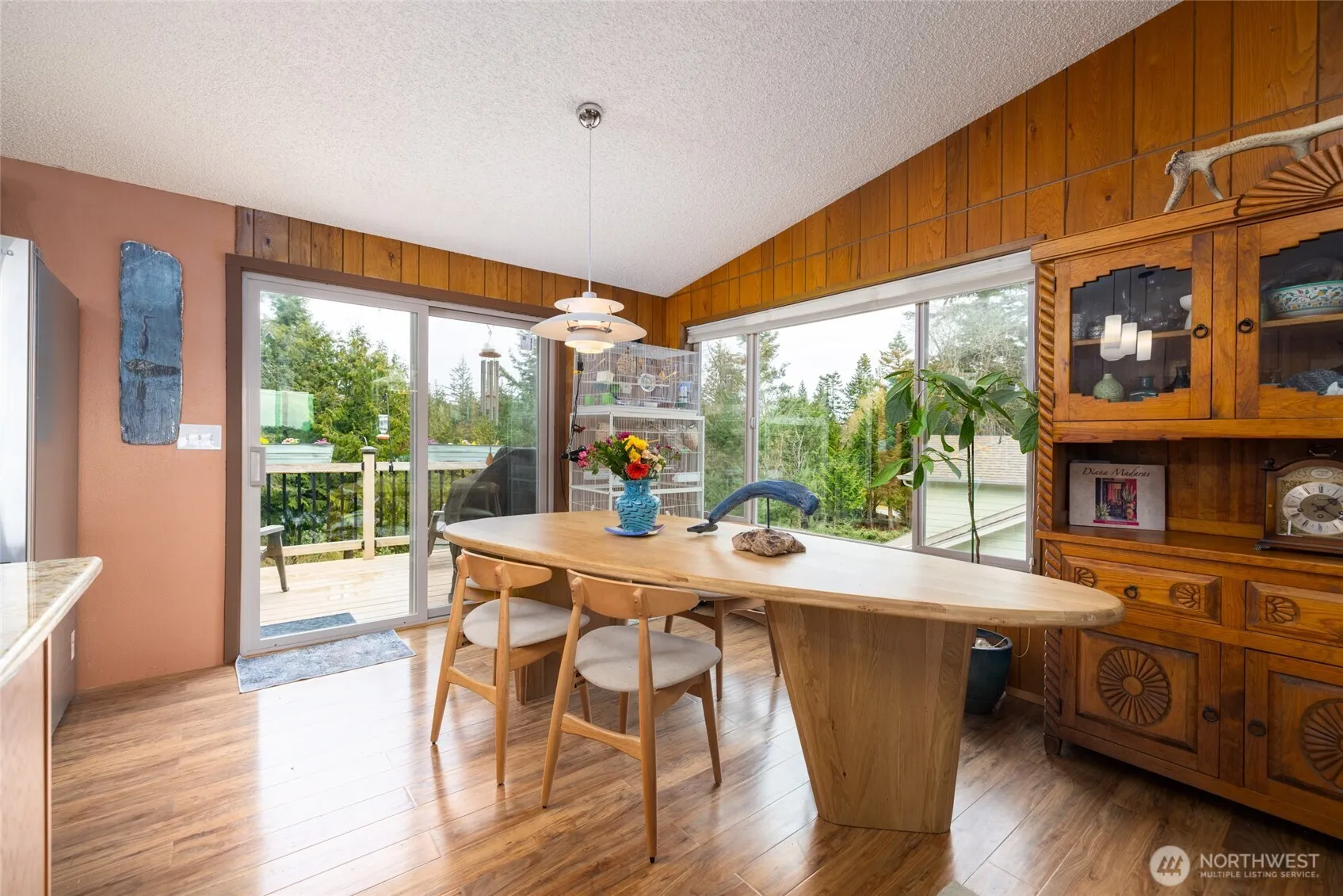 This property offers unparalleled view opportunities with the ambiance of a treehouse. Positioned high above the surrounding neighborhood rooftops, it provides a sense of privacy and expansive vistas. The elevated living areas provide breathtaking panoramas of the Olympic Mountains to the West and Mt. Baker and the Skagit Bay to the Southwest, creating a truly unique living experience. All this from the living and dining room areas! Multi-level decks overlook lush gardens with winding paths, a tranquil water feature, and a greenhouse. The versatile downstairs offers so much potential—perfect for a mother-in-law suite, rec room, or massive workshop. Enjoy Shelter Bay amenities: a pool, tennis, beach access, and minutes to charming La Conner!