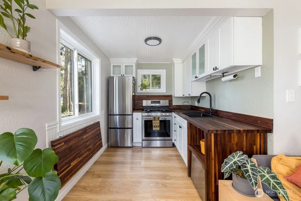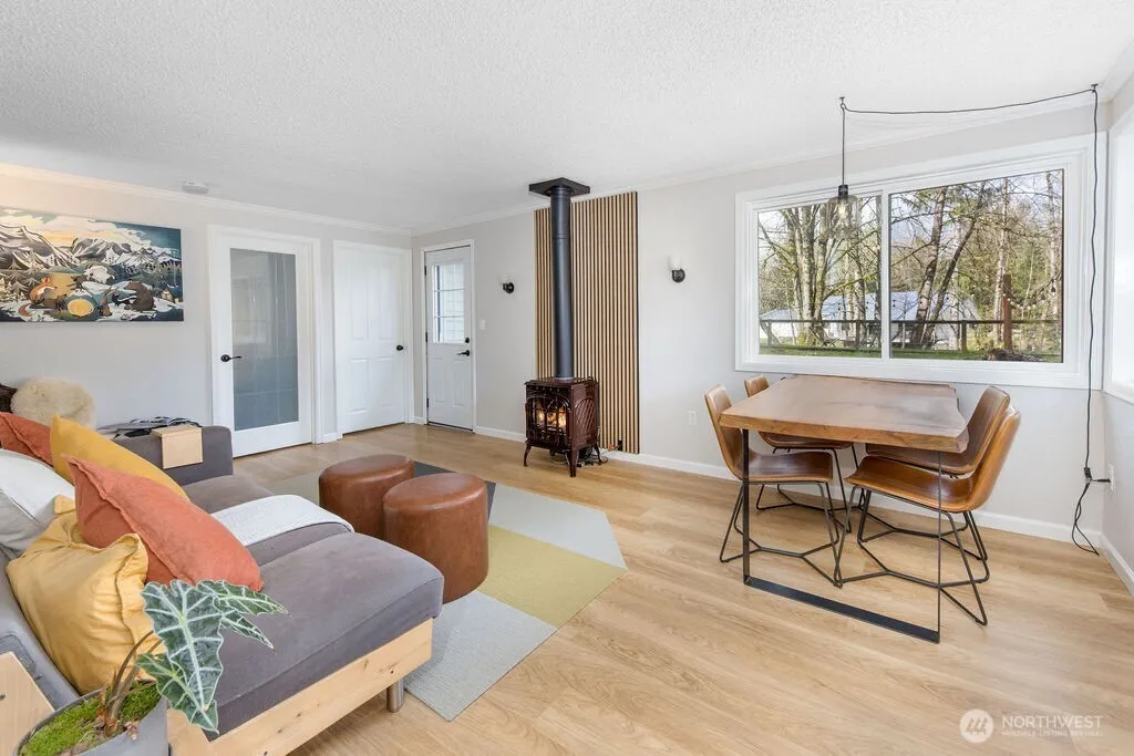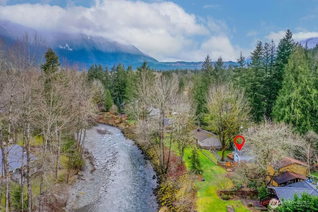 Nestled along the S. Fork of the Snoqualmie River, this beautifully updated home blends nature, creativity & modern comfort. Enjoy breathtaking Mt. Si & river views from the new deck or go down to the river to relax & take a dip. The lush, mature landscaping features garden beds, wildflowers & old-growth maples, creating a serene outdoor retreat. Inside, the newly remodeled kitchen boasts walnut butcher block counters, a drop-down prep space & stylish updates throughout. Fresh LVP flooring flows seamlessly, complementing the newly updated bath. The fully fenced yard provides privacy, while an art studio/maker’s space invites creativity. Easy access to the SVT & dt NB. The perfect blend for outdoor lovers™ seeking riverside charm.