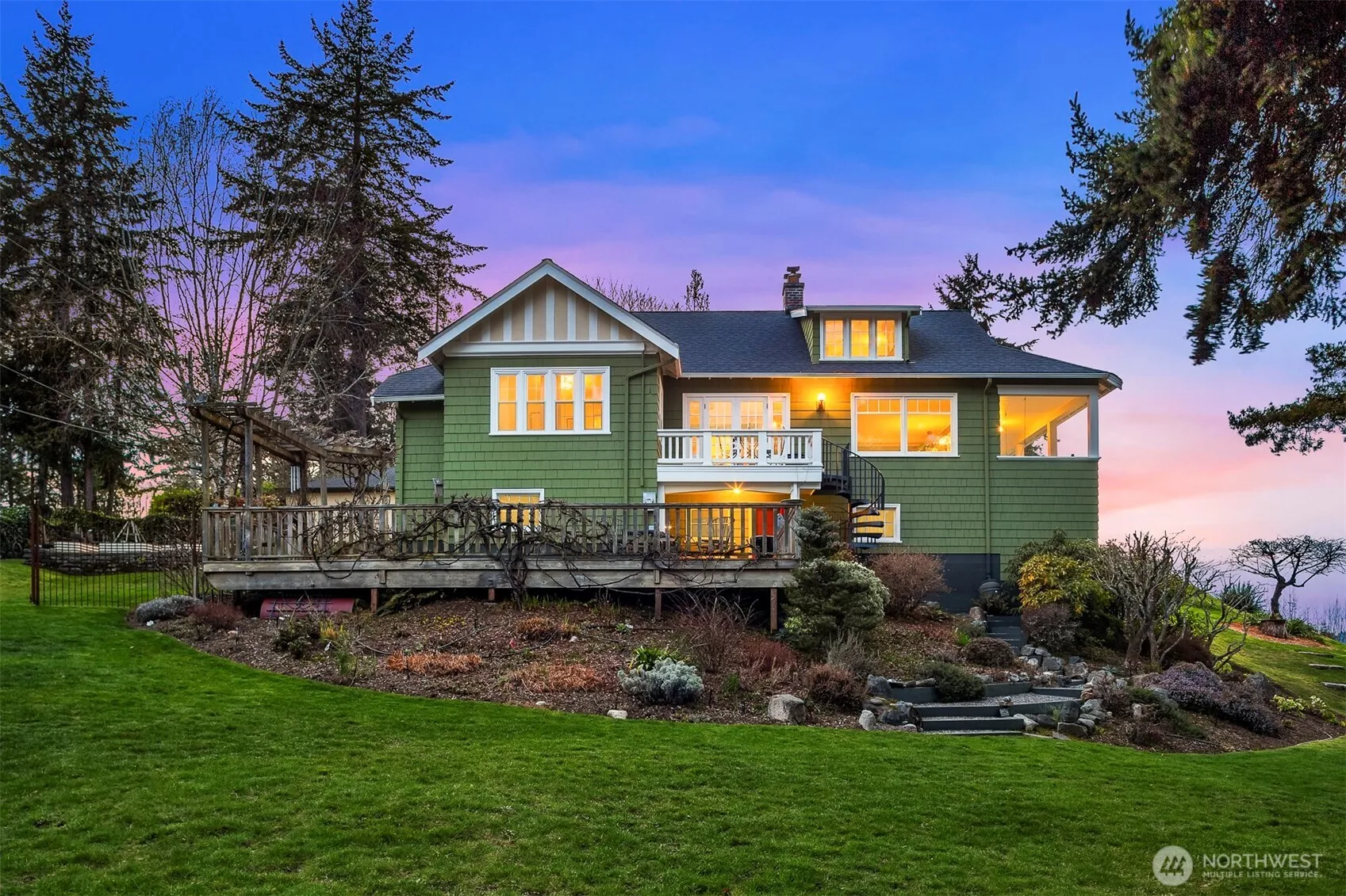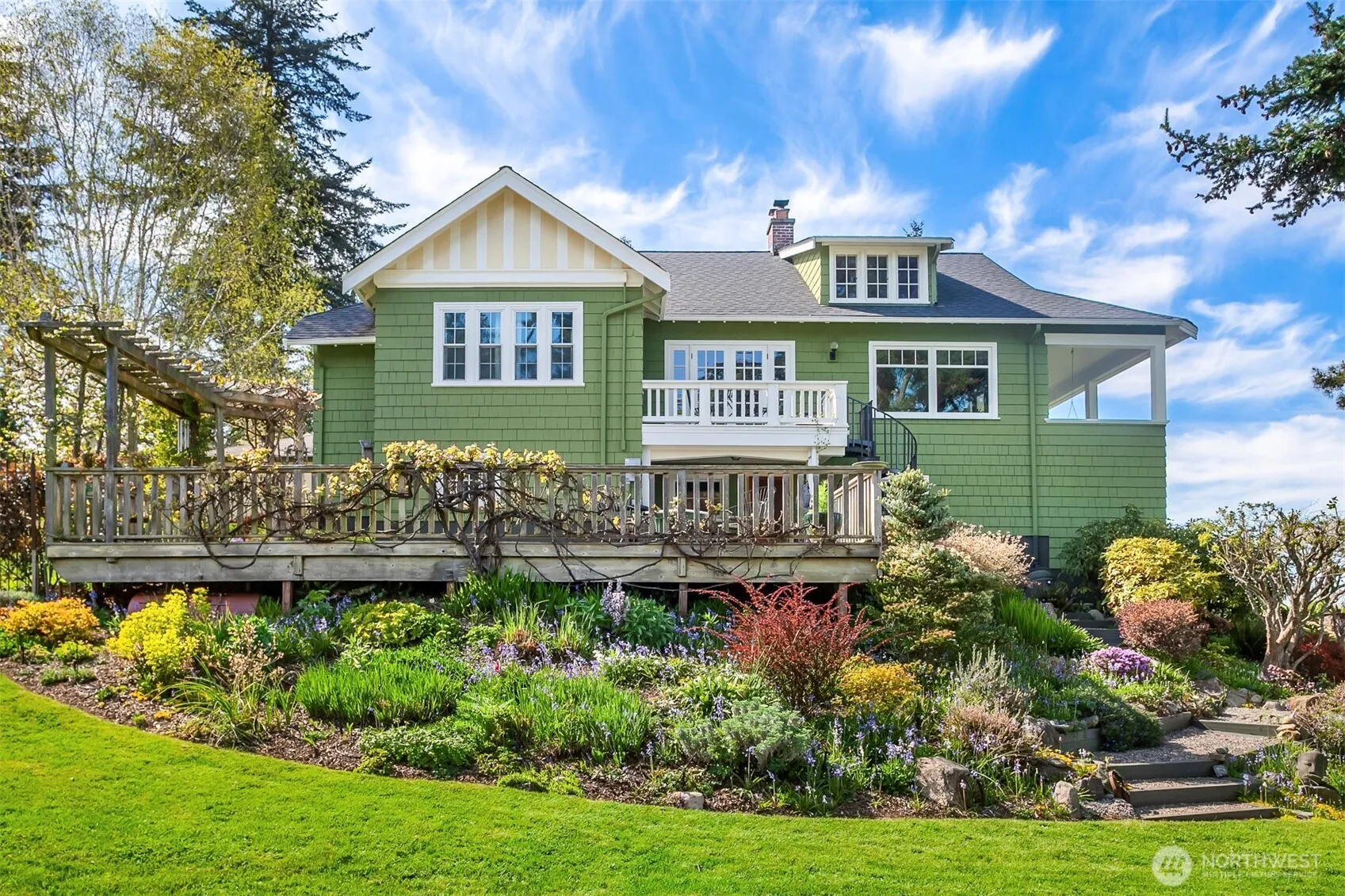 Classic North-End Craftsman with stunning Sound, Mountain, and City Light Views. Perched atop one of Vashon Island’s most commanding bluffs, the 100-year-old Craftsman home offers dramatic 180-degree views. This architectural gem has been carefully restored and meticulously maintained. Featured on the Vashon Garden Tour, the flowing lawn and lush, award-winning gardens provide a serene, peaceful sanctuary. A spacious deck and an expansive patio invite outdoor gatherings and activities. The three bedroom, one-bath layout is warmed by rich fir and quarter sawn oak flooring. French doors, built-in bookshelves, and an updated eat-in kitchen add charm and comfort. Walk-in attic space invites extra Bathroom.