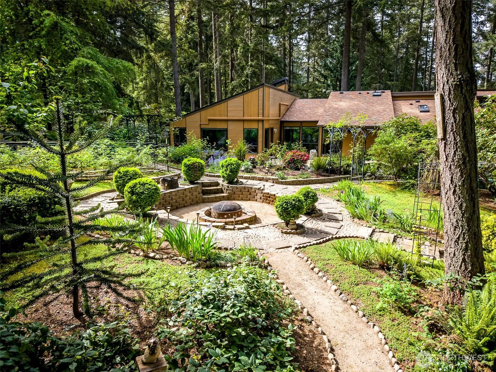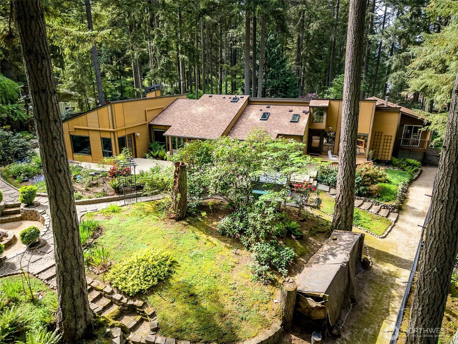 EXTRAORDINARY mid-century modern design by original owner/Tacoma architect, Robert Lynch! Rare, 5-bd, 3-ba, 3600+ sf rambler in a gated oasis of waterfalls, lush foliage & cobblestone paths! 1.8+/- acres of easily-managed & well thought-out landscaping, perfect for multi-gen living (MIL unit)! Two kitchens, lofts, skylights, high-end appliances, A/C, htd shower floor, BT lighting & int/ext speakers! In-ground wine cellar, hot tub, greenhouse, dog run, fire pit, fully-fenced, htd porch & decks. 2-car att’d garage w/EV charging & add’l carport. The newly-passed ADU/DADU bill allows add’l dwellings on the same parcel w/no short plat req’d! Featured in the prestigious U.P. Garden Tour! UP schools! Recent appraisal at $1,330,000! Gate code 6912.