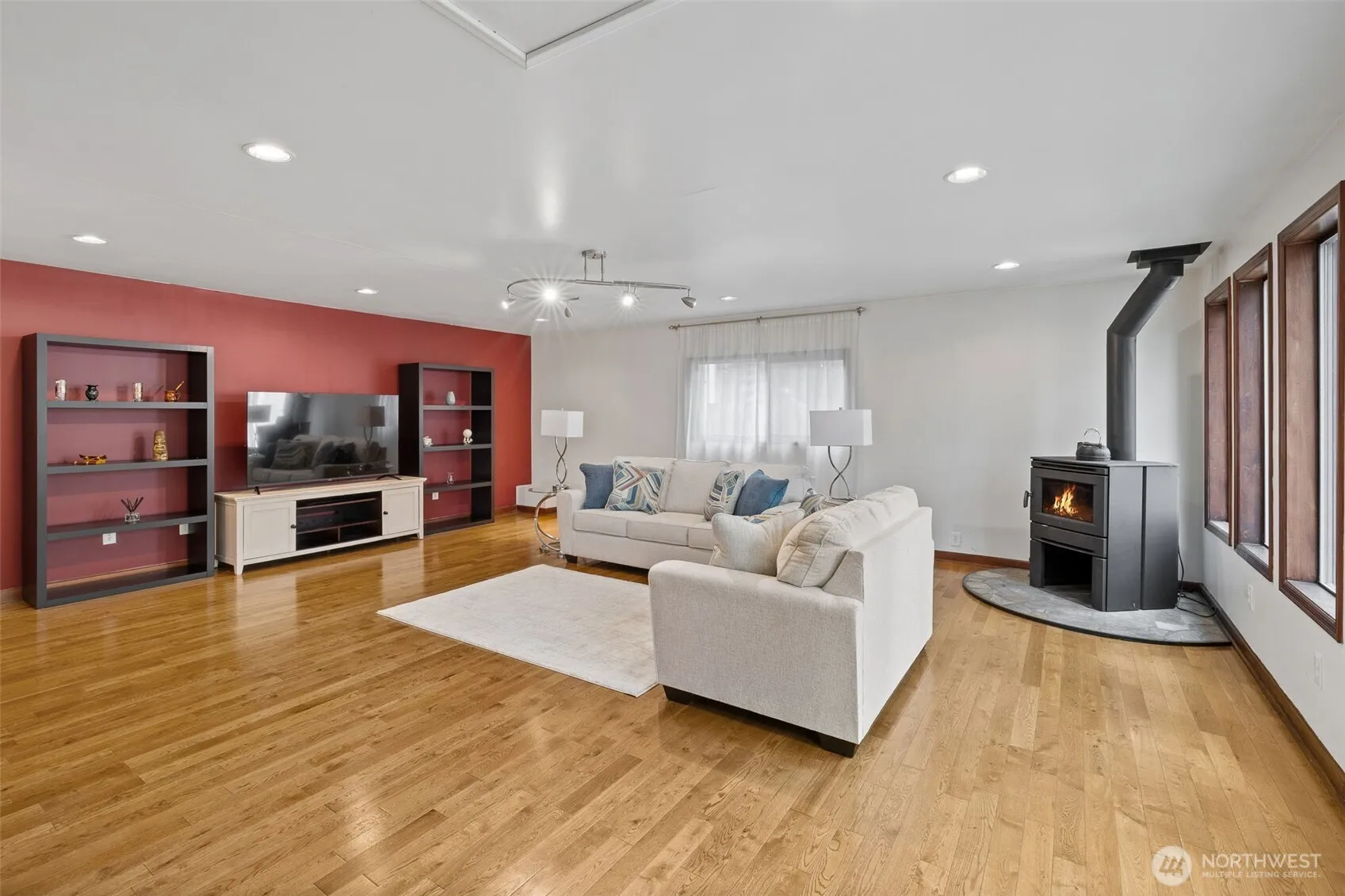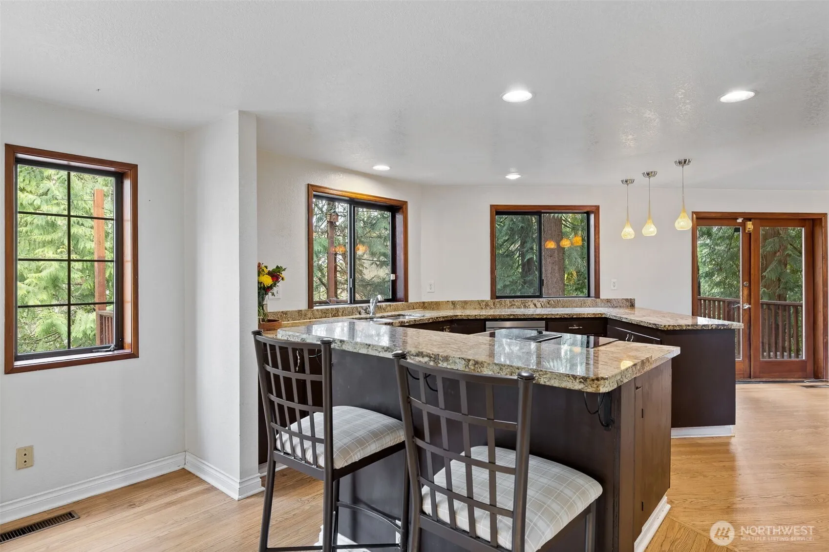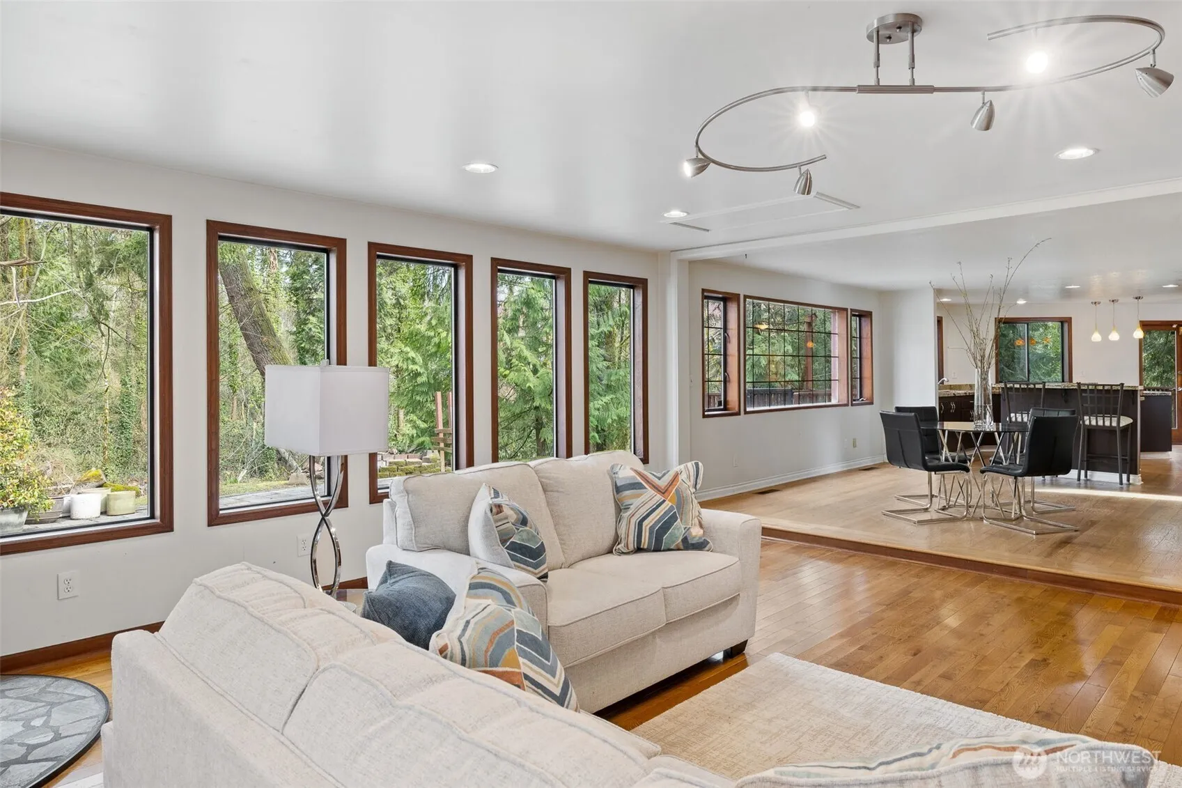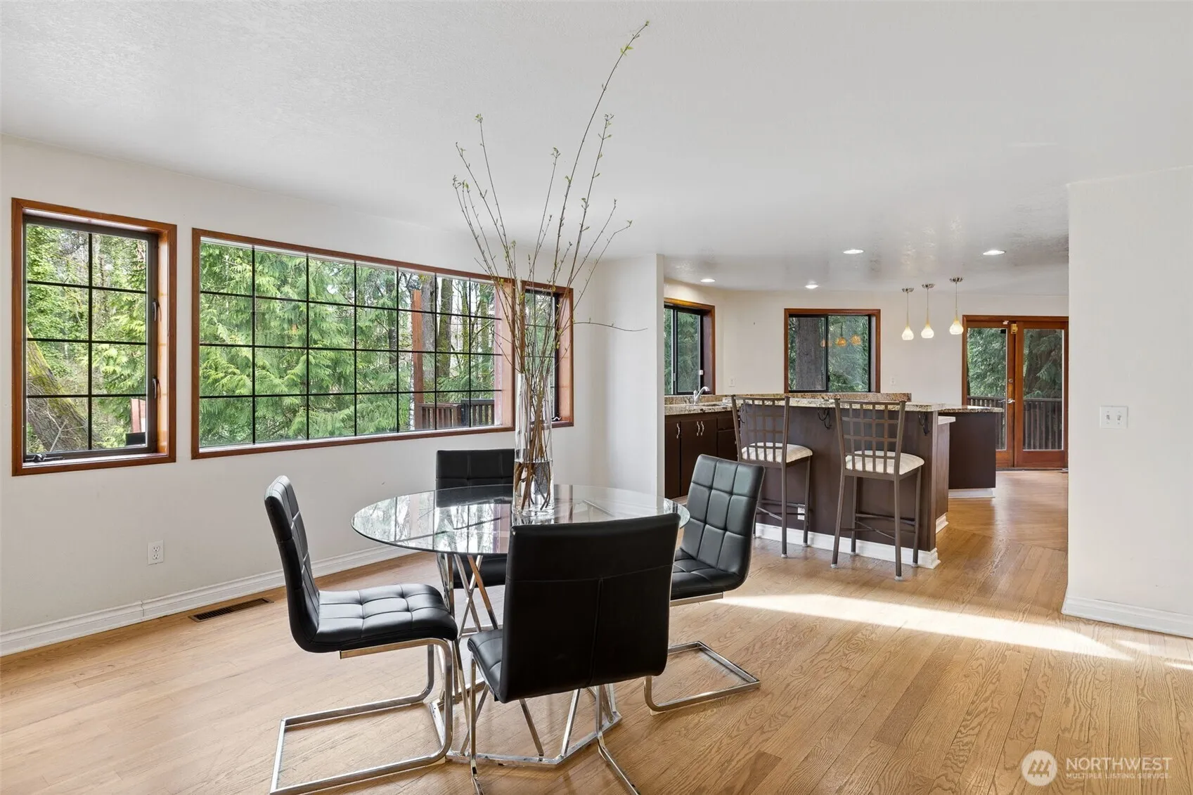 Welcome to this unique, custom-built home—originally the first constructed in this quiet cul-de-sac of a desirable Mountlake Terrace neighborhood. Featuring a PRIVATE GREEN BELT, this home offers rare seclusion and a peaceful setting. Expansive windows invite natural light throughout the open-concept living, dining, and kitchen areas, creating a bright and airy atmosphere. French doors open to a spacious deck and fully paved backyard—ideal for entertaining. The seamless indoor-outdoor flow is perfect for gatherings or quiet relaxation. Minutes from light rail, shopping, dining, and entertainment. A property offering both privacy and convenience.