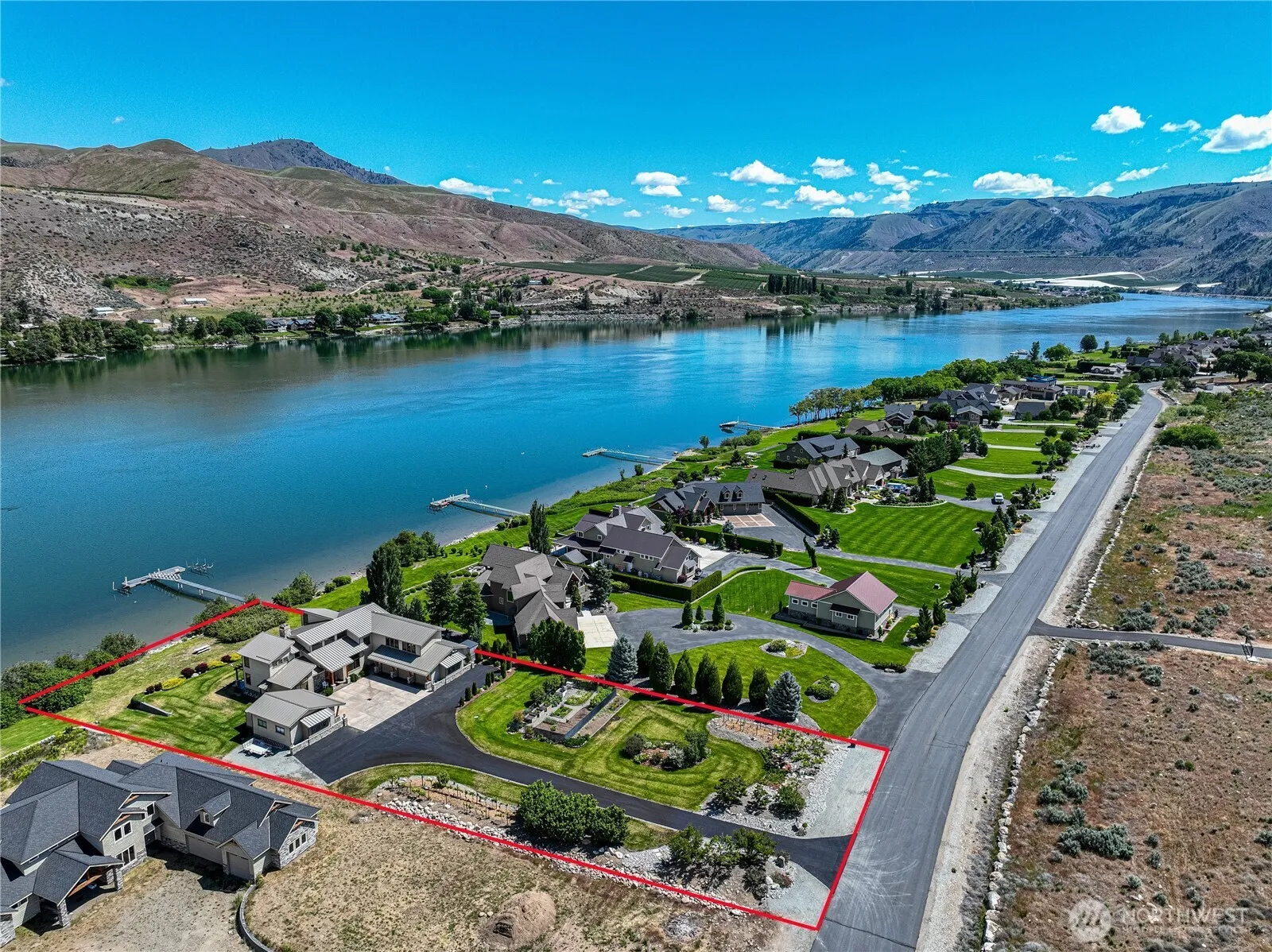 Custom Home in prestigious Twin W. 140 feet waterfront no bank, beach area on Columbia River/Lake Entiat. Private dock shared with one other property. Twin W community boat launch. Chefs kitchen includes Wolf propane cooktop, double ovens. 10 ft granite island provides both cooking and entertaining. Soaring 24 ft living room ceiling, with natural Montana stone fireplace. In winter the fireplace is like being in a lodge, warm and inviting. Primary bedroom with viewing deck and 5 piece bathroom in travertine and granite including a bubble soaking tub. All bedrooms with ensuite. Fully landscaped property includes, vineyards, fruit and nut trees and garden space, sprinkler system.