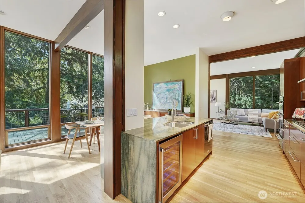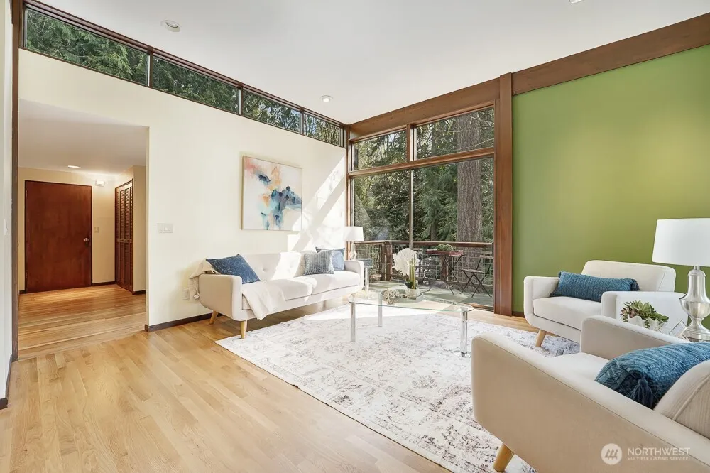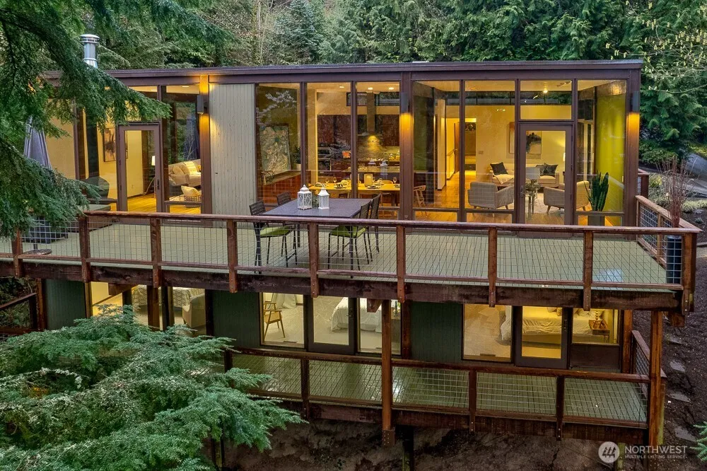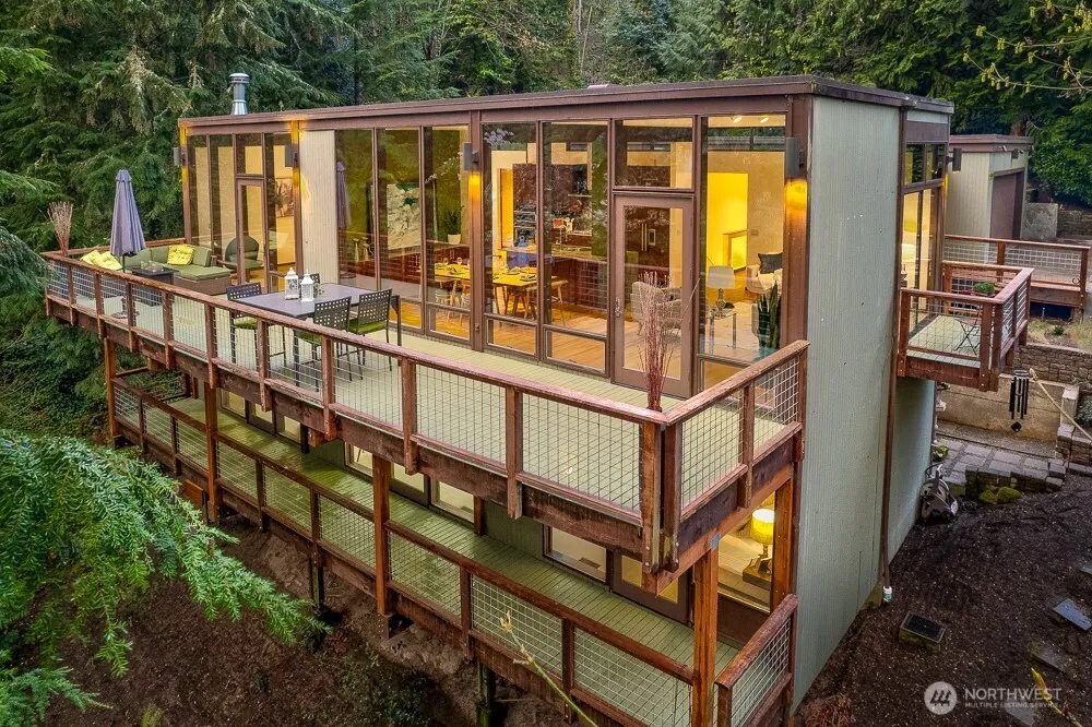 Perched on a shy half-acre private lot, this architecturally significant mid-century modern home is a true masterpiece. Designed by renowned architect Peder H. Knudson, the home is a showcase of design and sophistication. It features striking floor-to-ceiling walls of windows that flood the interiors with natural light, along with multiple decks that seamlessly connect indoors and outdoor living. Its eclectic charm creates a calming, natural vibe. Surrounded by a Zen-like, park-like tranquility, this urban oasis has filtered water views from the main deck, where soaring eagles abound. The peaceful setting, on a dead-end street, secluded from neighbors, provides the perfect space to entertain or embrace a slower, more mindful lifestyle.