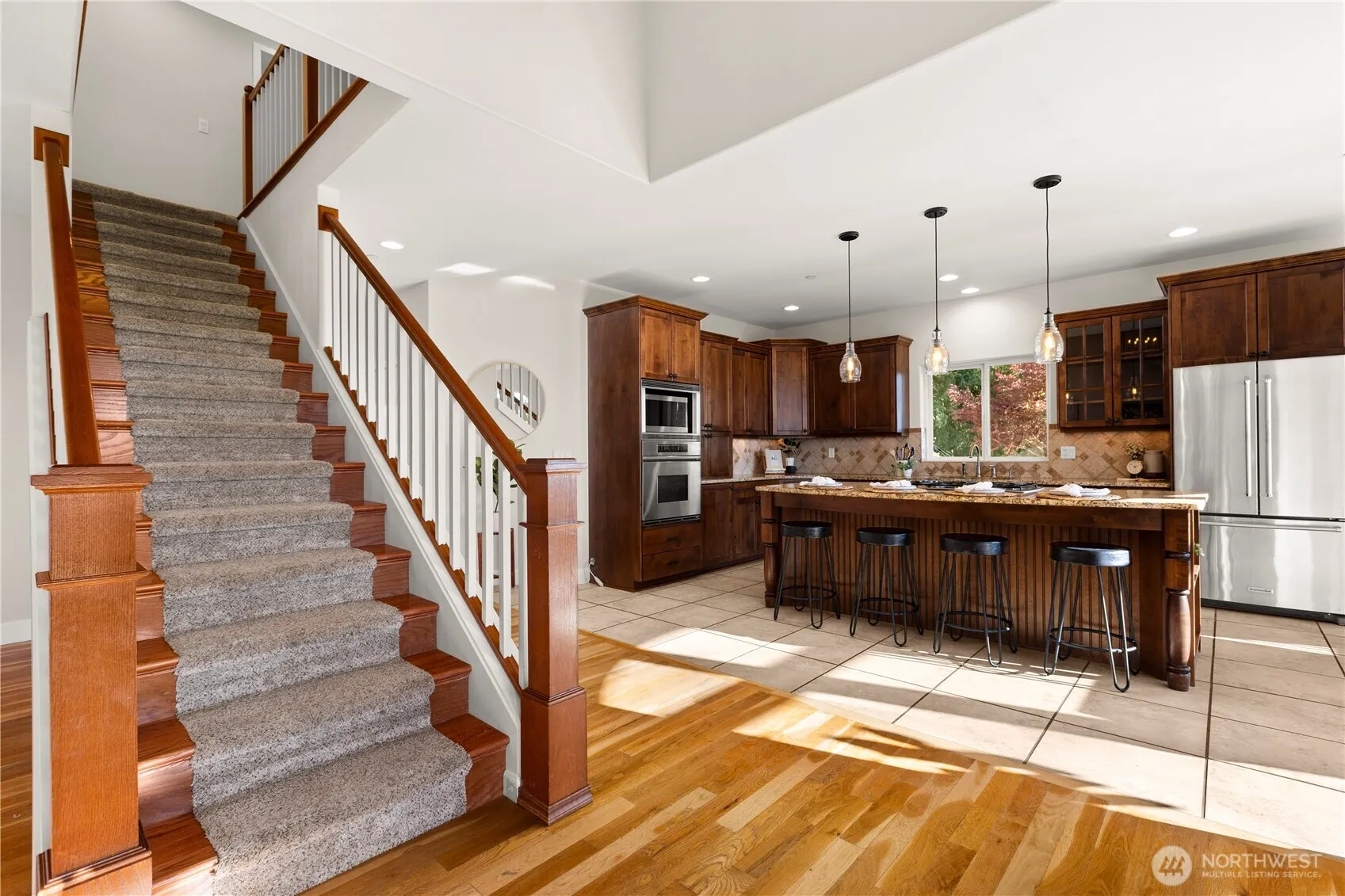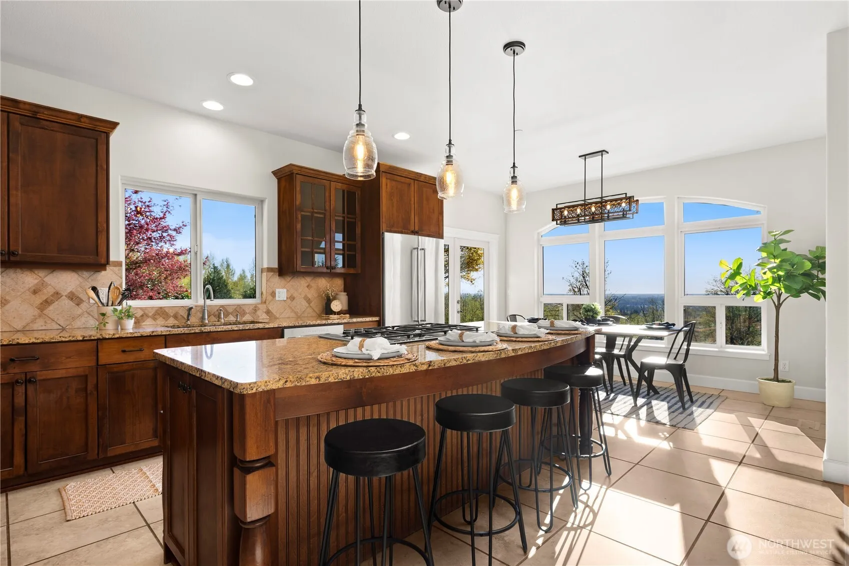 Nestled on 1.67 private acres in Black Diamond, this stunning retreat offers panoramic views of the Olympic Mountains and downtown Seattle. Thoughtfully designed to embrace the natural surroundings, this home features soaring ceilings, gleaming hardwoods, and walls of windows framing breathtaking vistas. The main-level primary suite offers a spa-like 5-piece bath and walk-in closet. Chef’s kitchen with granite counters, stainless steel appliances, and a dining nook oriented toward the view. Outdoor living shines with a covered patio, mature landscaping, fruit trees, chicken coop, backyard has direct access to private equestrian and walking trails. Ample parking for RVs, boats, and more—with a spacious 3-car garage.
