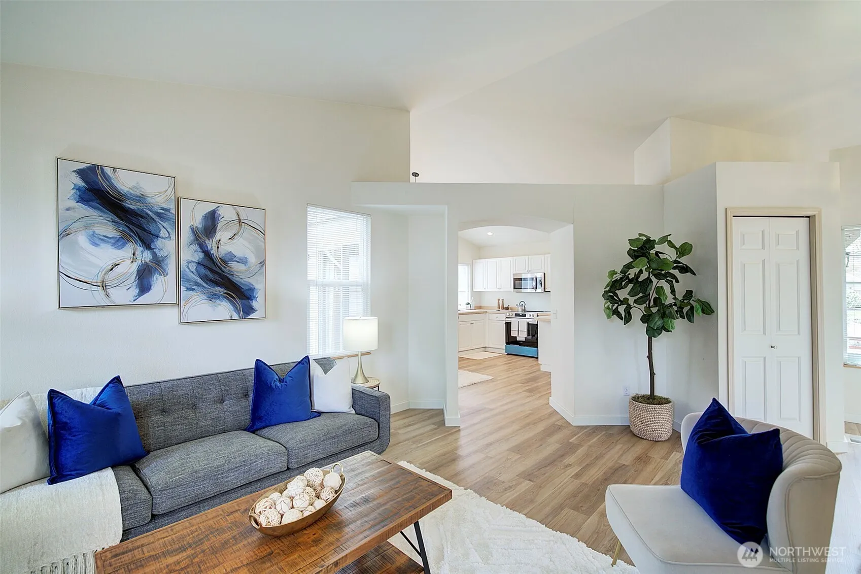 Delightful single level home with 2 bedrooms plus a flex room. This home’s design features vaulted ceilings, contemporary detail & new LVP flooring throughout. A gas fireplace is the focal point of the living room. Kitchen offers a peninsula with bar stool seating, dining area & brand new stainless appliances. Primary bedroom ensuite with walk-in closet & a private bath, w/walk-in shower. Additional bedroom & adjacent bath. The fenced backyard has new lawn installed alongside & arbor covered patio. A garden shed conveniently offers storage for tools & lawn furniture. You’ll enjoy this charming, tree lined neighborhood offering community parks & access to the Pipeline & Cedar River trails on the cul-de-sac. Starbucks is nearby too!