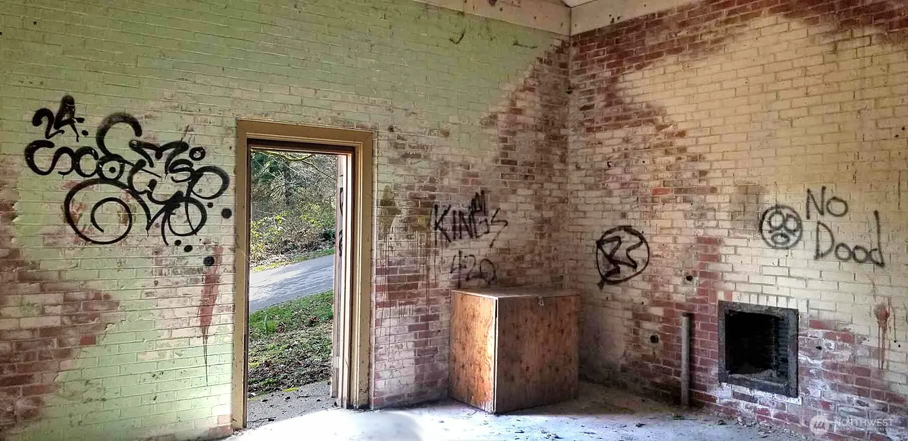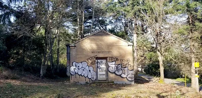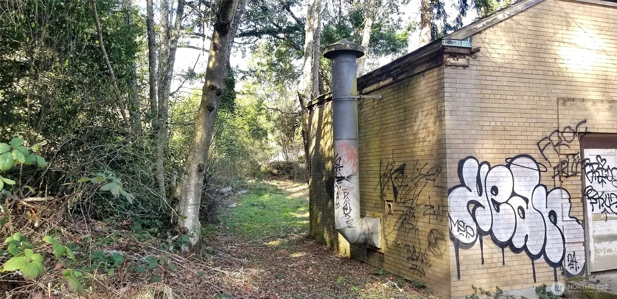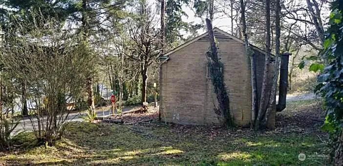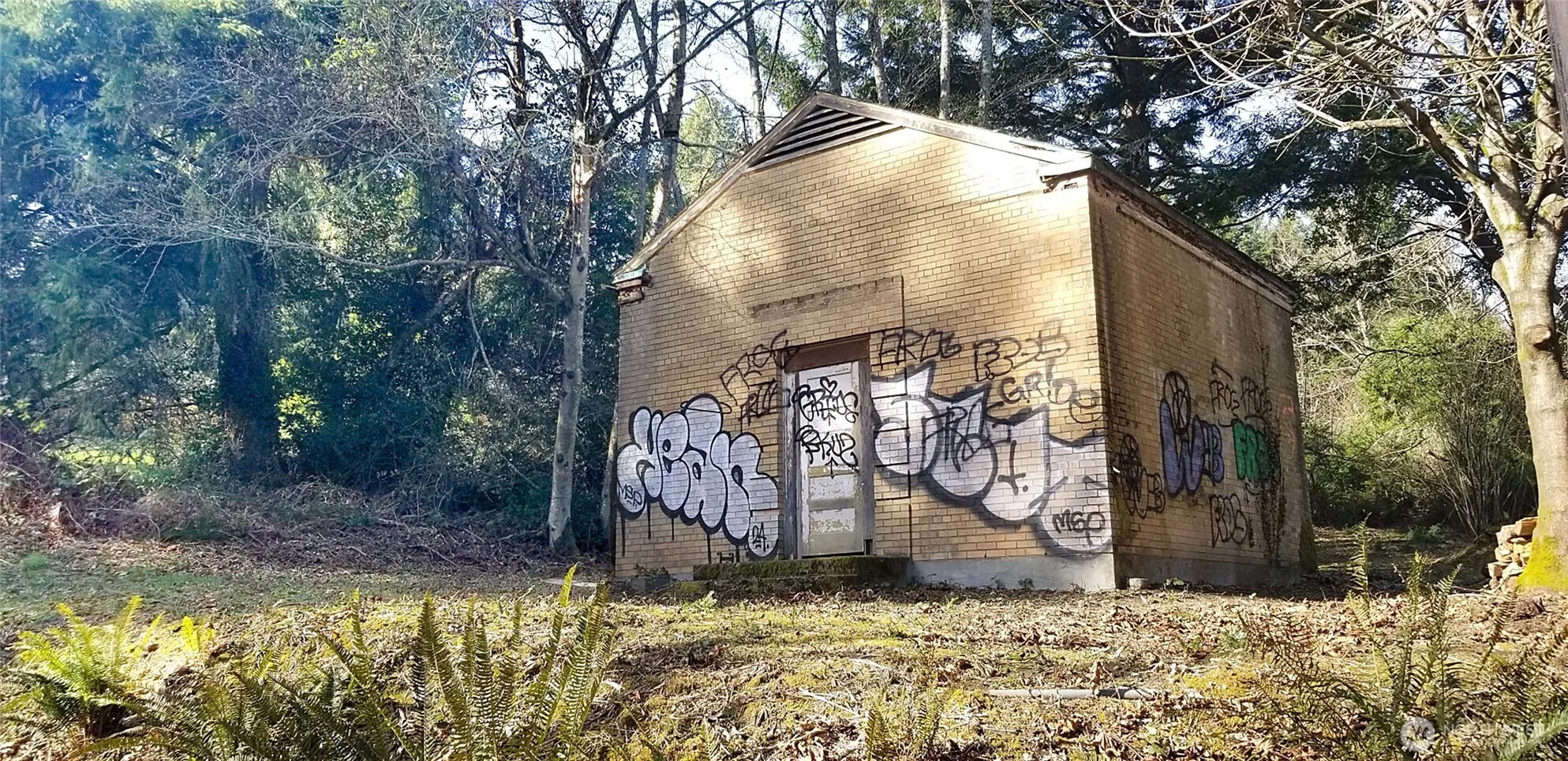 Postage stamp sized parcel near Portage. This is not a building site; no drinking (potable) water available from the local water district thus no septic system is possible this is only a recreational unbuildable parcel on Vashon Island. Although there is a solid building on the parcel according to archive records it was originally built in 1947 by Pacific Telephone & Telegraph Company. It’s a 400 (20′ x 20′) square foot colorful brick building that has a dry concrete interior with no windows or power although electricity is available in the street. The irregular shaped corner parcel is 80′ x 76′ x 64′ x 75′ according to tax records with a partial slope within the level areas, peek views and public beach nearby.