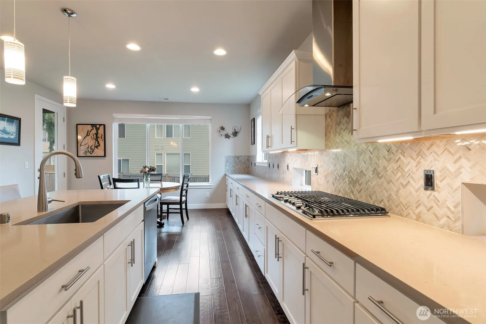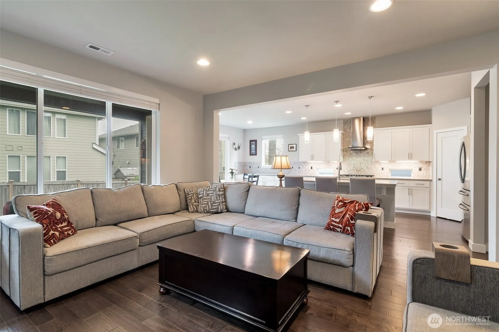 Light & Bright Woodland Trail craftsman in the heart of Mill Creek on quiet street. Inviting entry, high ceilings, craftsman touches & open floor plan with rich plank hardwood flooring. Main floor bedroom with ¾ bath. Gourmet kitchen with Shaker cabinetry, quartz counters, stainless appliances, pantry & prep island open to dining & living area with cozy gas fireplace & access to private, covered back patio & fenced, level yard. Mud room with built-in bench. Upper floor large open loft flex area, Primary Suite with walk in closet & 5-piece bath, two additional bedrooms, full-bath & laundry with storage. Two car garage & plenty of off-street parking. Community park/playground. Easy access to conveniences, trails & award-winning schools. A/C!